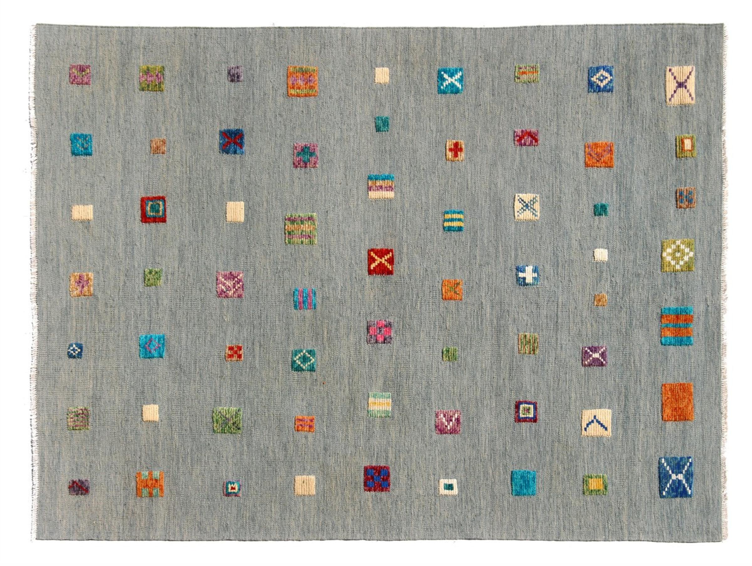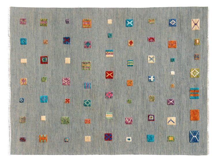 Esta alfombra fue hecha a mano en un telar como un tejido plano. Tejido plano es el término utilizado para describir las alfombras que no tienen pelo. Como el nombre promete, estas alfombras están tejidas y no anudadas. Esto resulta en una alfombra plana con una superficie estructurada. Los tejidos planos no son tan suaves y normalmente más delgados que las alfombras anudadas. Al mismo tiempo, su fabricación es mucho menos compleja y por lo general se pueden disponer por ambos lados (frontal y posterior). Sus patrones suelen ser geométricos, lo cual está determinado por el tejido.