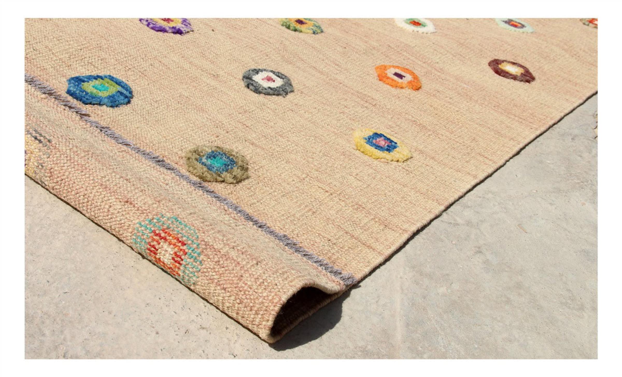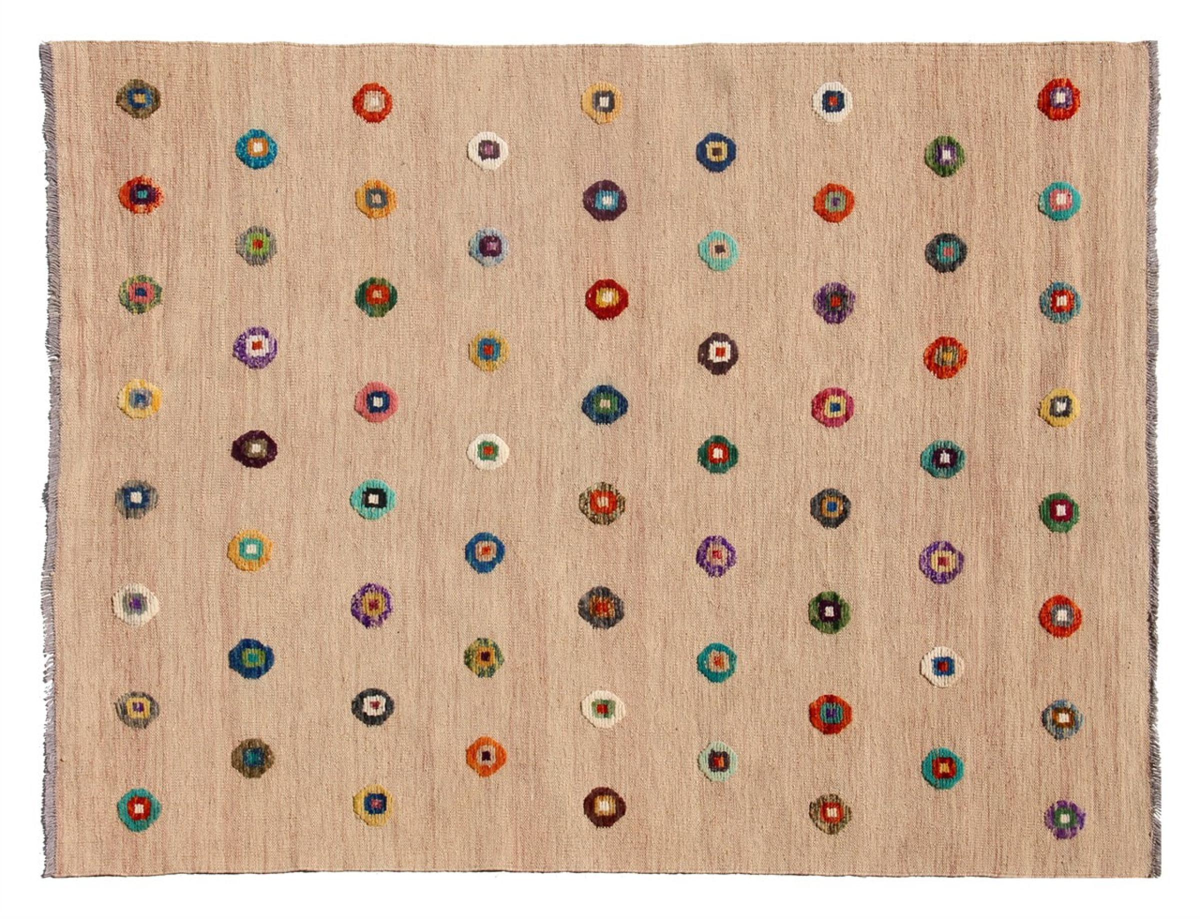 Esta alfombra fue hecha a mano en un telar como un tejido plano. Tejido plano es el término utilizado para describir las alfombras que no tienen pelo. Como el nombre promete, estas alfombras están tejidas y no anudadas. Esto resulta en una alfombra plana con una superficie estructurada. Los tejidos planos no son tan suaves y normalmente más delgados que las alfombras anudadas. Al mismo tiempo, su fabricación es mucho menos compleja y por lo general se pueden disponer por ambos lados (frontal y posterior). Sus patrones suelen ser geométricos, lo cual está determinado por el tejido.