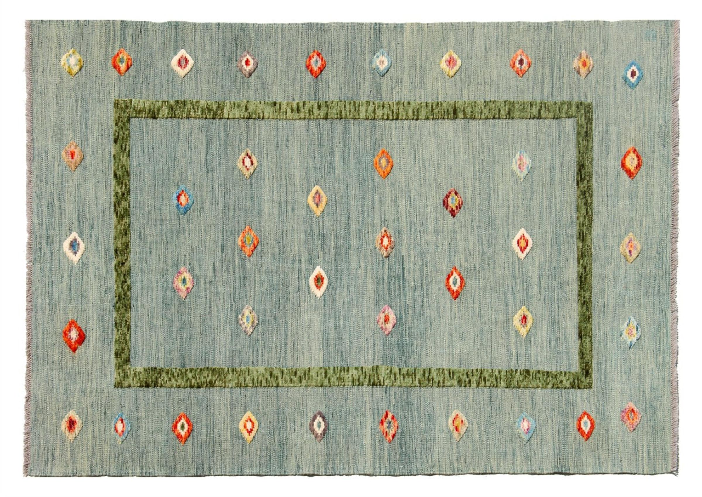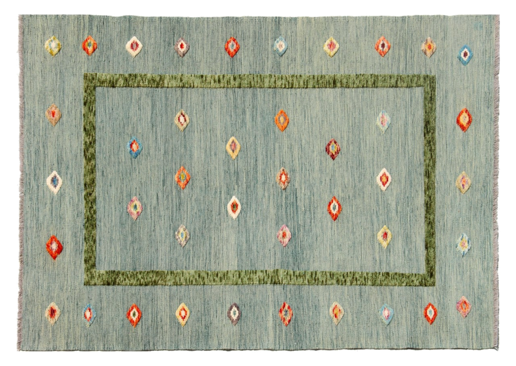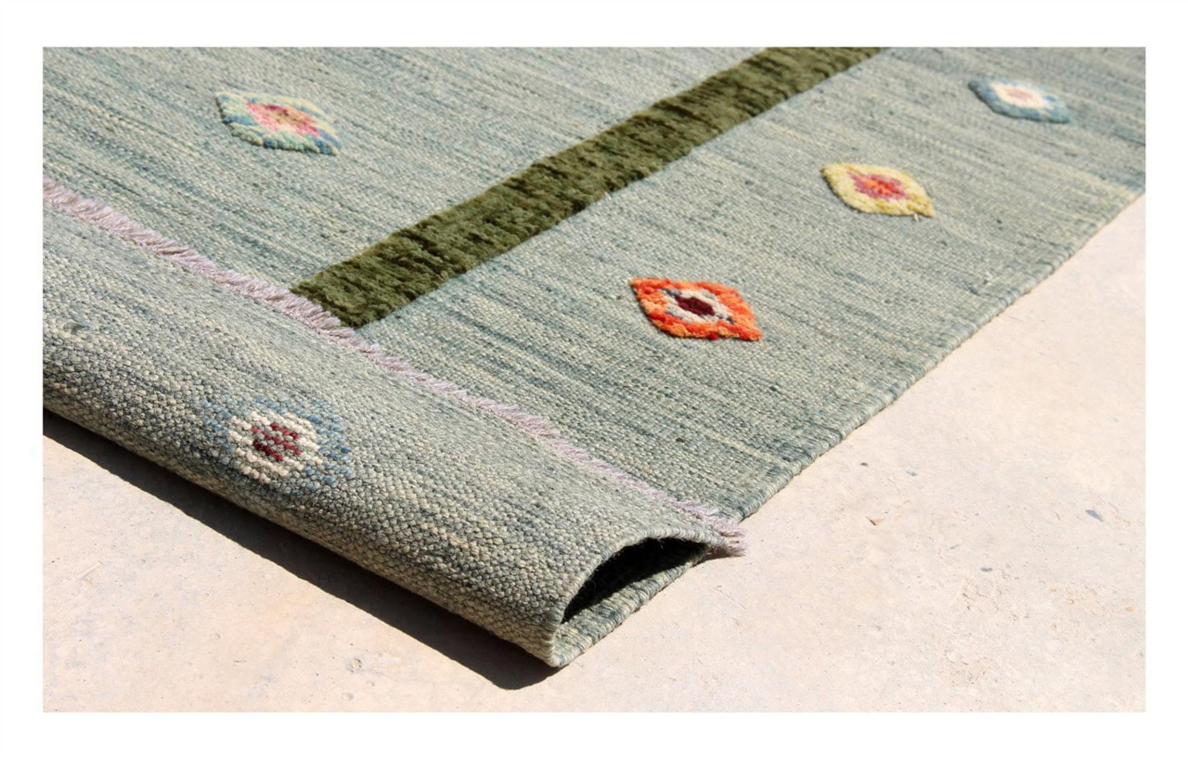 Esta alfombra fue hecha a mano en un telar como un tejido plano. Tejido plano es el término utilizado para describir las alfombras que no tienen pelo. Como el nombre promete, estas alfombras están tejidas y no anudadas. Esto resulta en una alfombra plana con una superficie estructurada. Los tejidos planos no son tan suaves y normalmente más delgados que las alfombras anudadas. Al mismo tiempo, su fabricación es mucho menos compleja y por lo general se pueden disponer por ambos lados (frontal y posterior). Sus patrones suelen ser geométricos, lo cual está determinado por el tejido.