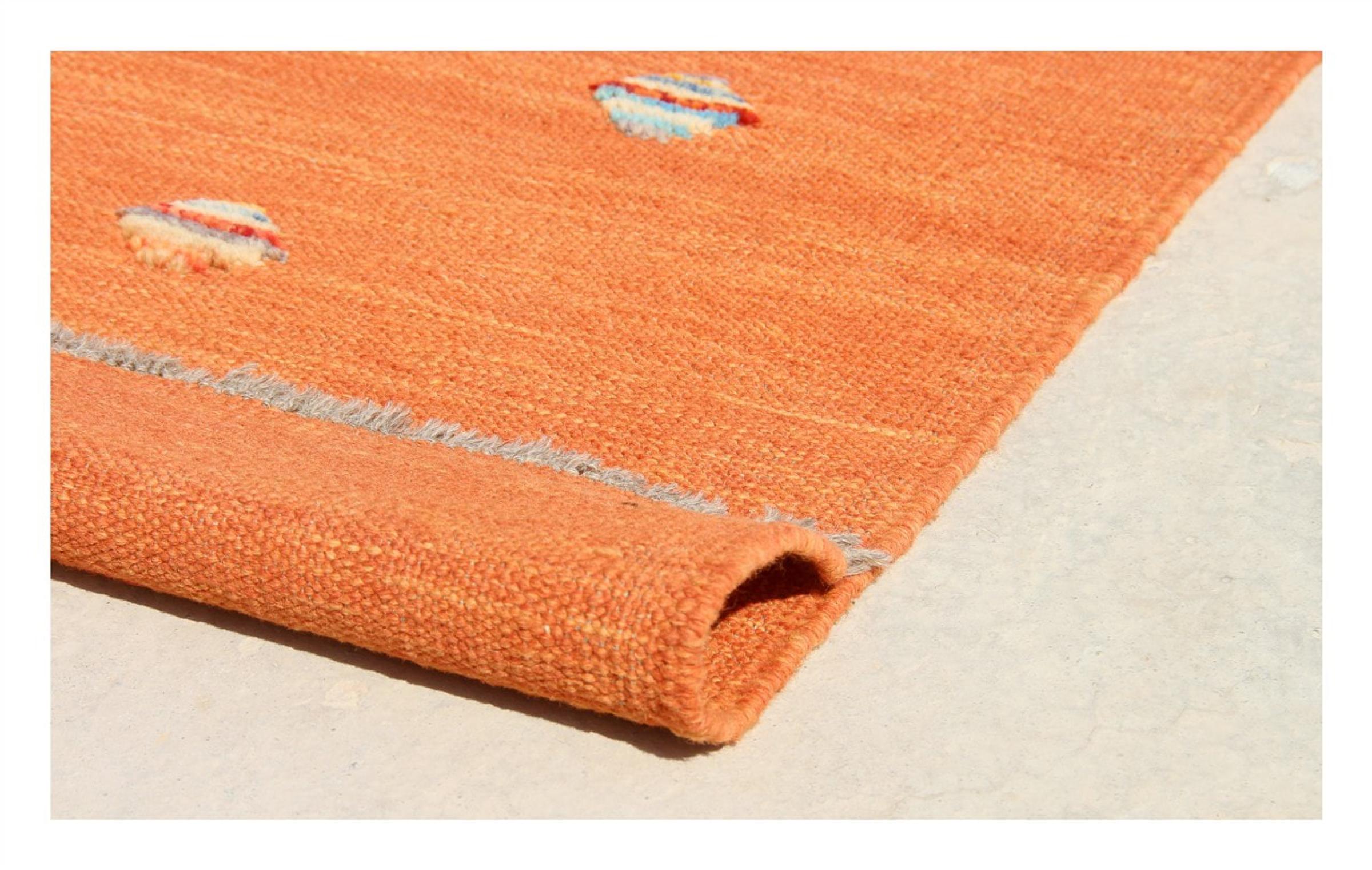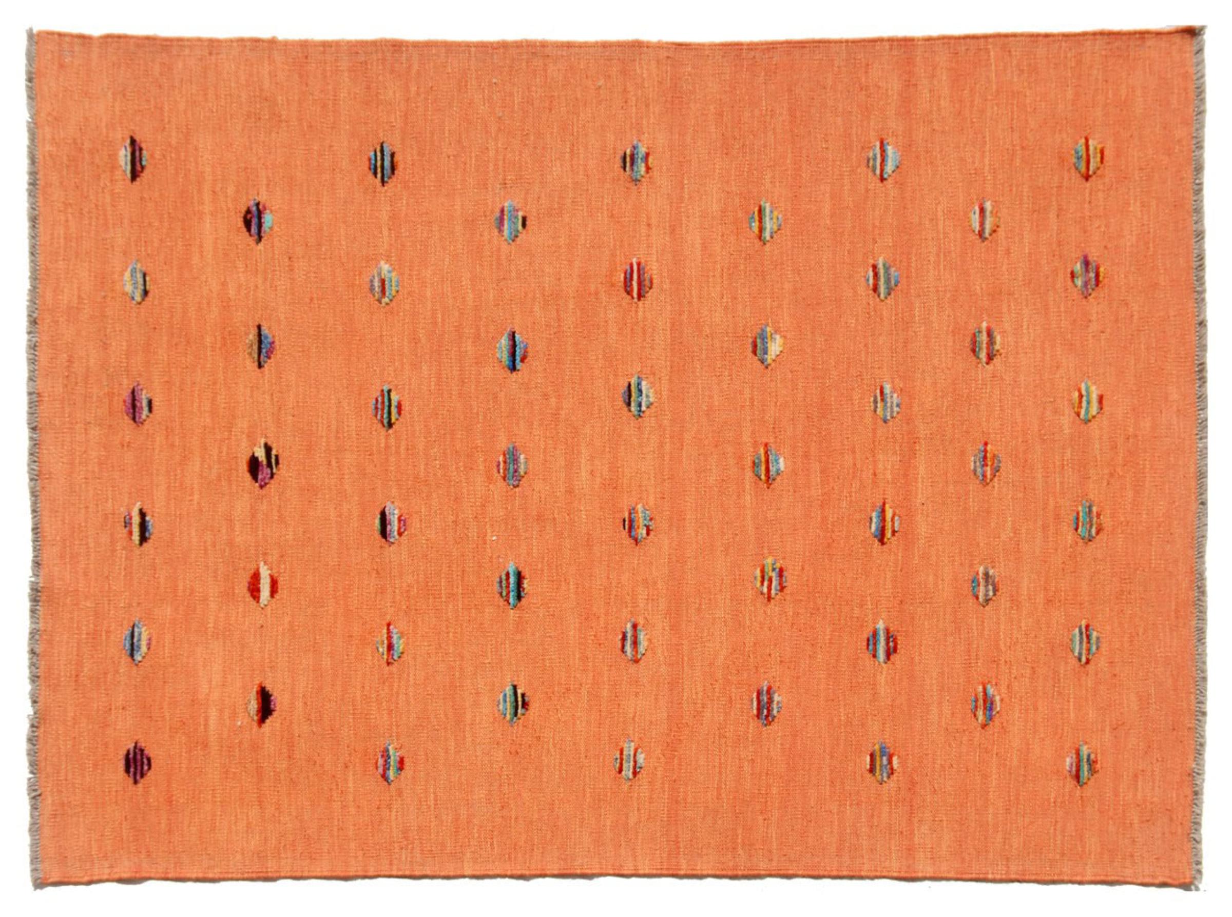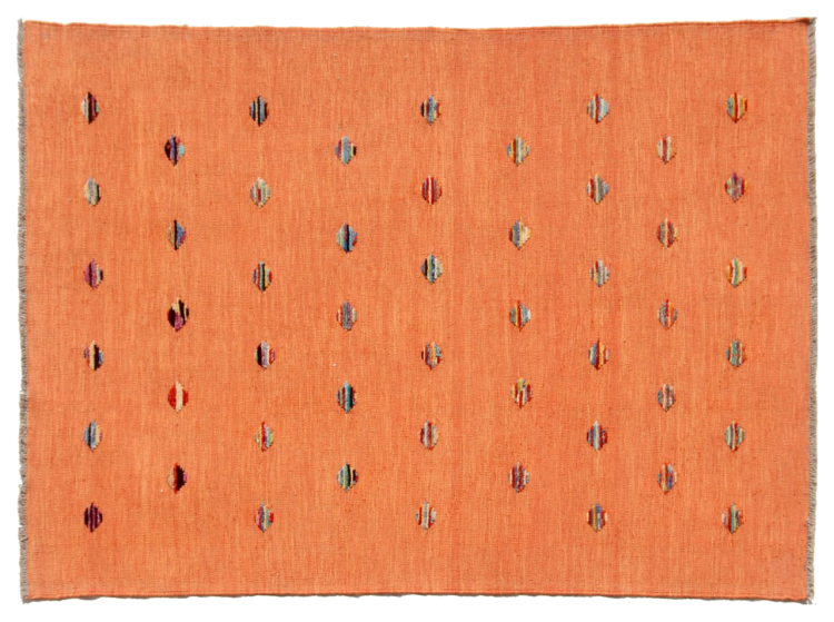 Esta alfombra fue hecha a mano en un telar como un tejido plano. Tejido plano es el término utilizado para describir las alfombras que no tienen pelo. Como el nombre promete, estas alfombras están tejidas y no anudadas. Esto resulta en una alfombra plana con una superficie estructurada. Los tejidos planos no son tan suaves y normalmente más delgados que las alfombras anudadas. Al mismo tiempo, su fabricación es mucho menos compleja y por lo general se pueden disponer por ambos lados (frontal y posterior). Sus patrones suelen ser geométricos, lo cual está determinado por el tejido.