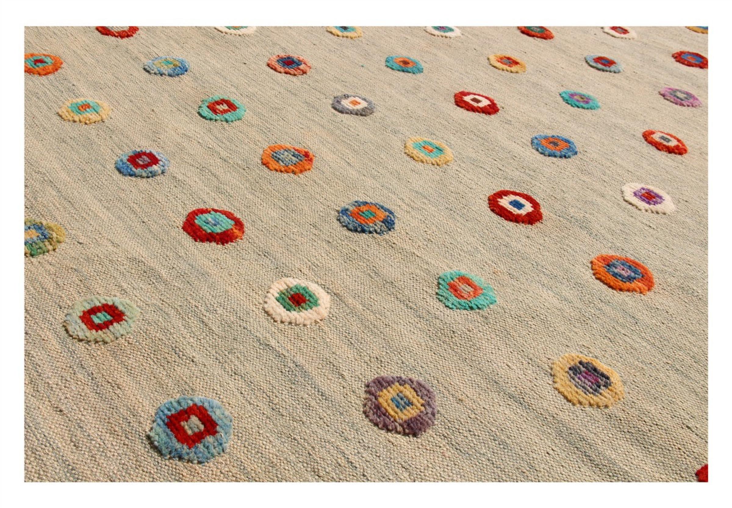 Esta alfombra fue hecha a mano en un telar como un tejido plano. Tejido plano es el término utilizado para describir las alfombras que no tienen pelo. Como el nombre promete, estas alfombras están tejidas y no anudadas. Esto resulta en una alfombra plana con una superficie estructurada. Los tejidos planos no son tan suaves y normalmente más delgados que las alfombras anudadas. Al mismo tiempo, su fabricación es mucho menos compleja y por lo general se pueden disponer por ambos lados (frontal y posterior). Sus patrones suelen ser geométricos, lo cual está determinado por el tejido.