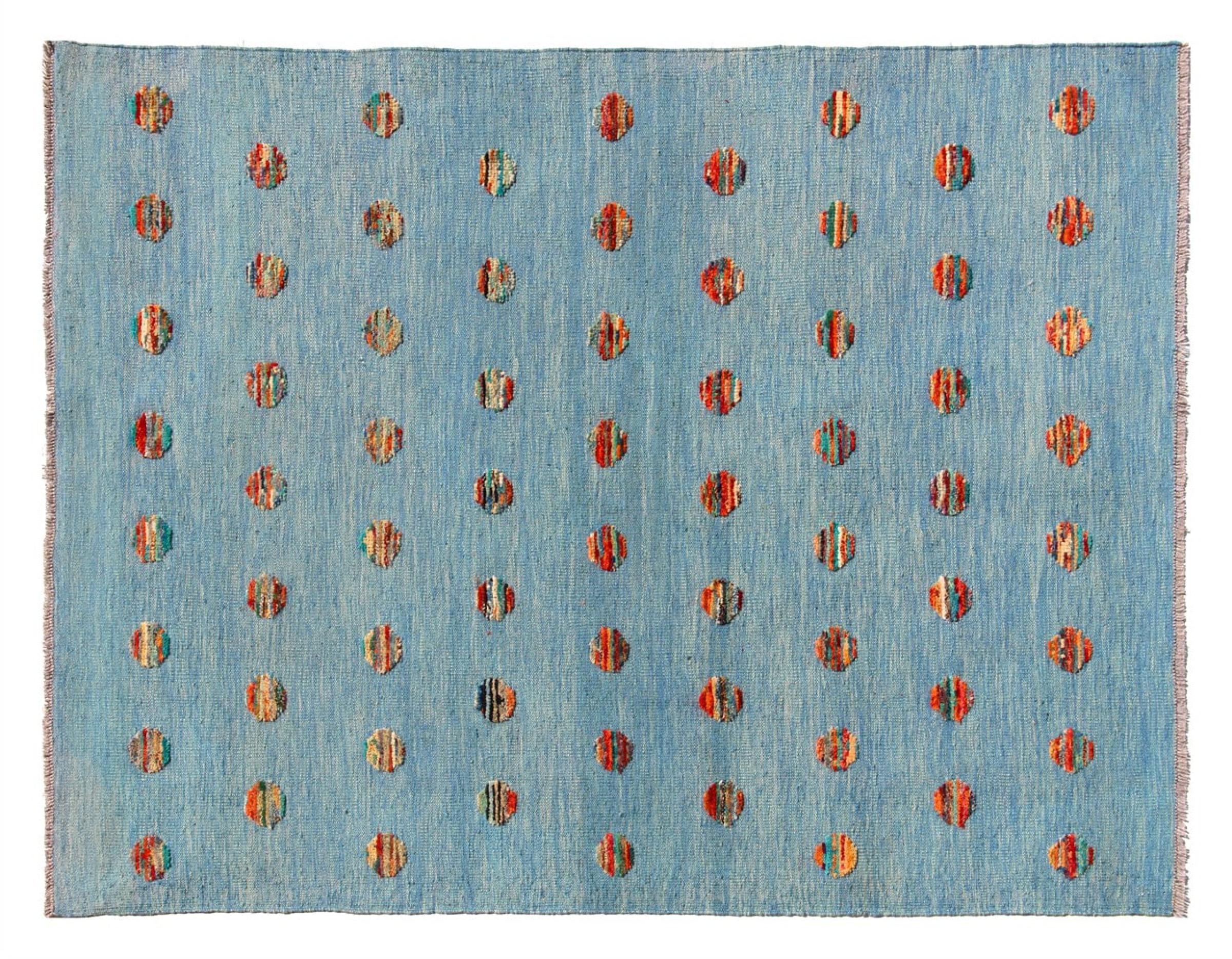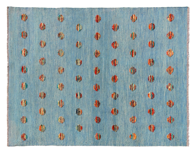 Esta alfombra fue hecha a mano en un telar como un tejido plano. Tejido plano es el término utilizado para describir las alfombras que no tienen pelo. Como el nombre promete, estas alfombras están tejidas y no anudadas. Esto resulta en una alfombra plana con una superficie estructurada. Los tejidos planos no son tan suaves y normalmente más delgados que las alfombras anudadas. Al mismo tiempo, su fabricación es mucho menos compleja y por lo general se pueden disponer por ambos lados (frontal y posterior). Sus patrones suelen ser geométricos, lo cual está determinado por el tejido.