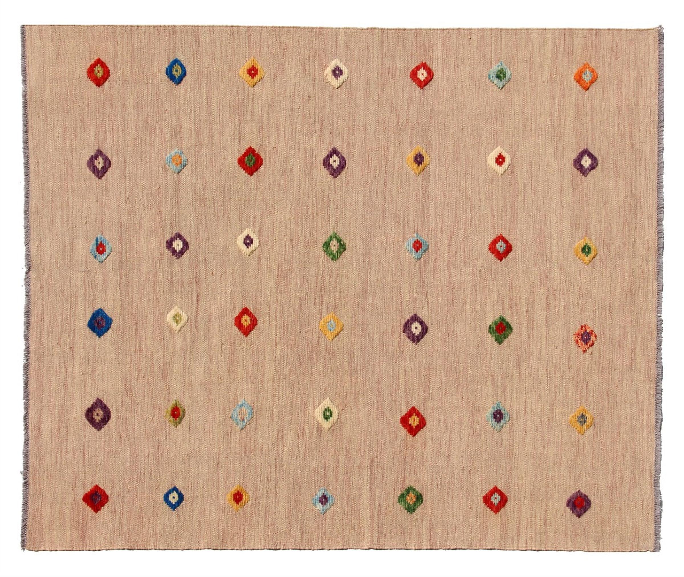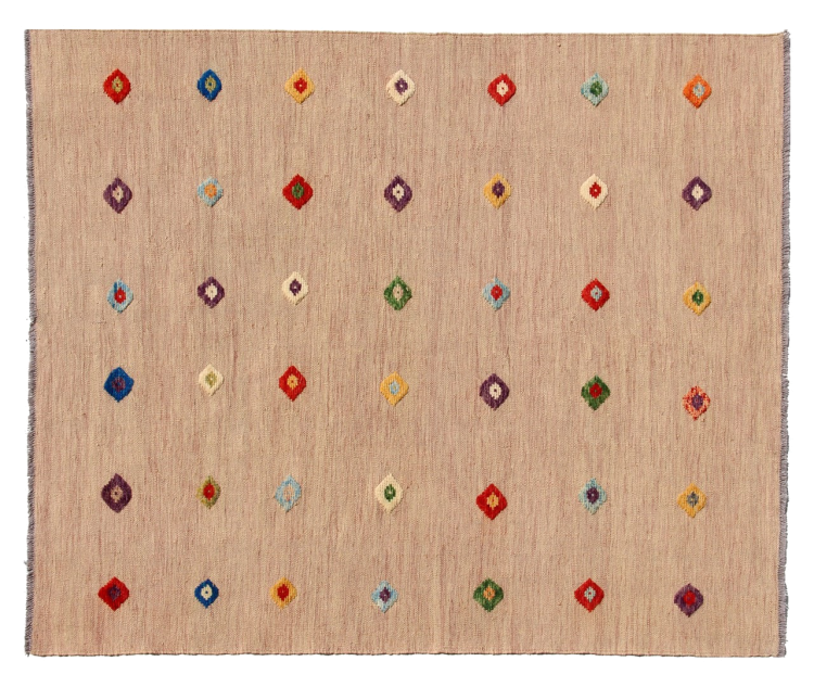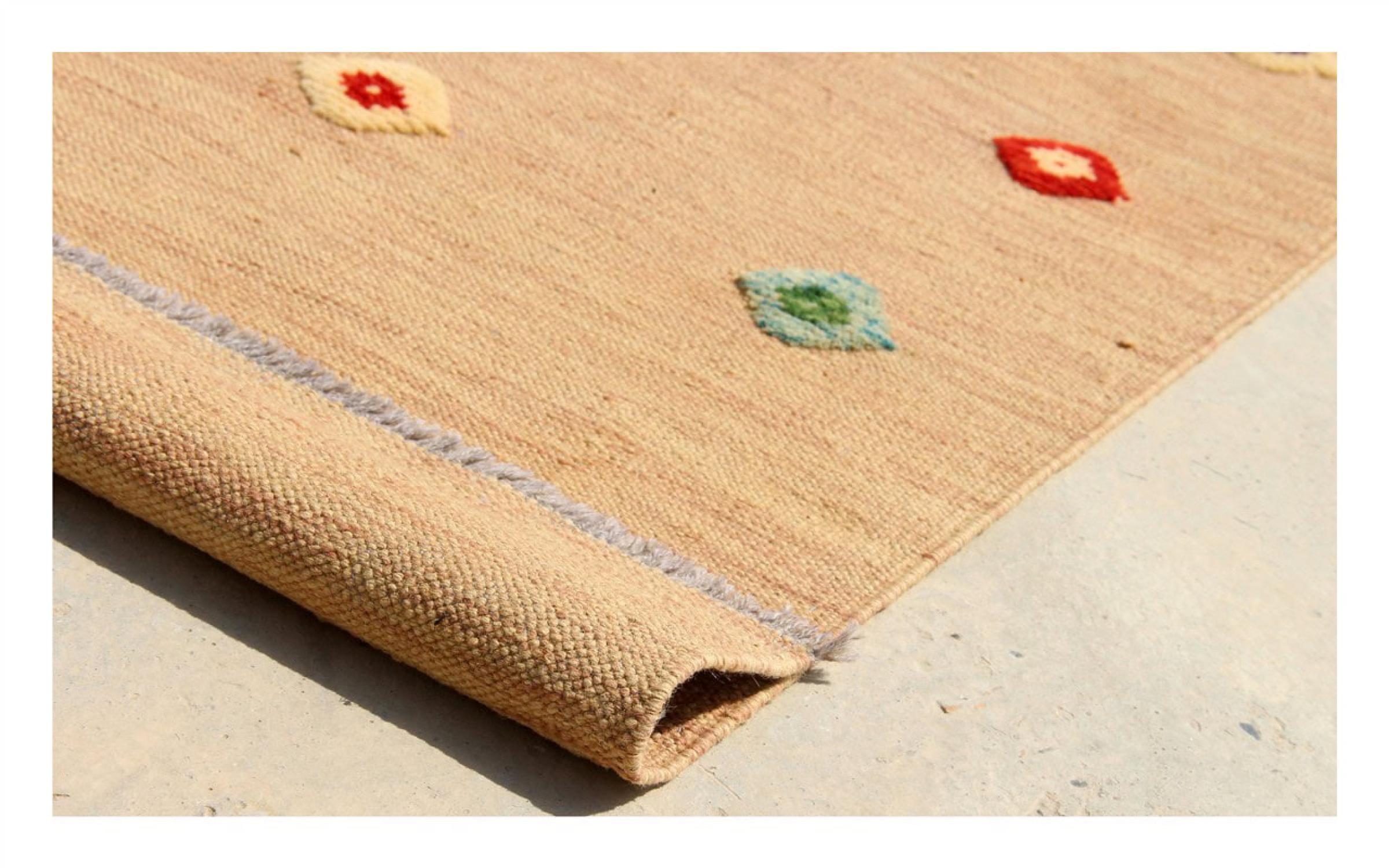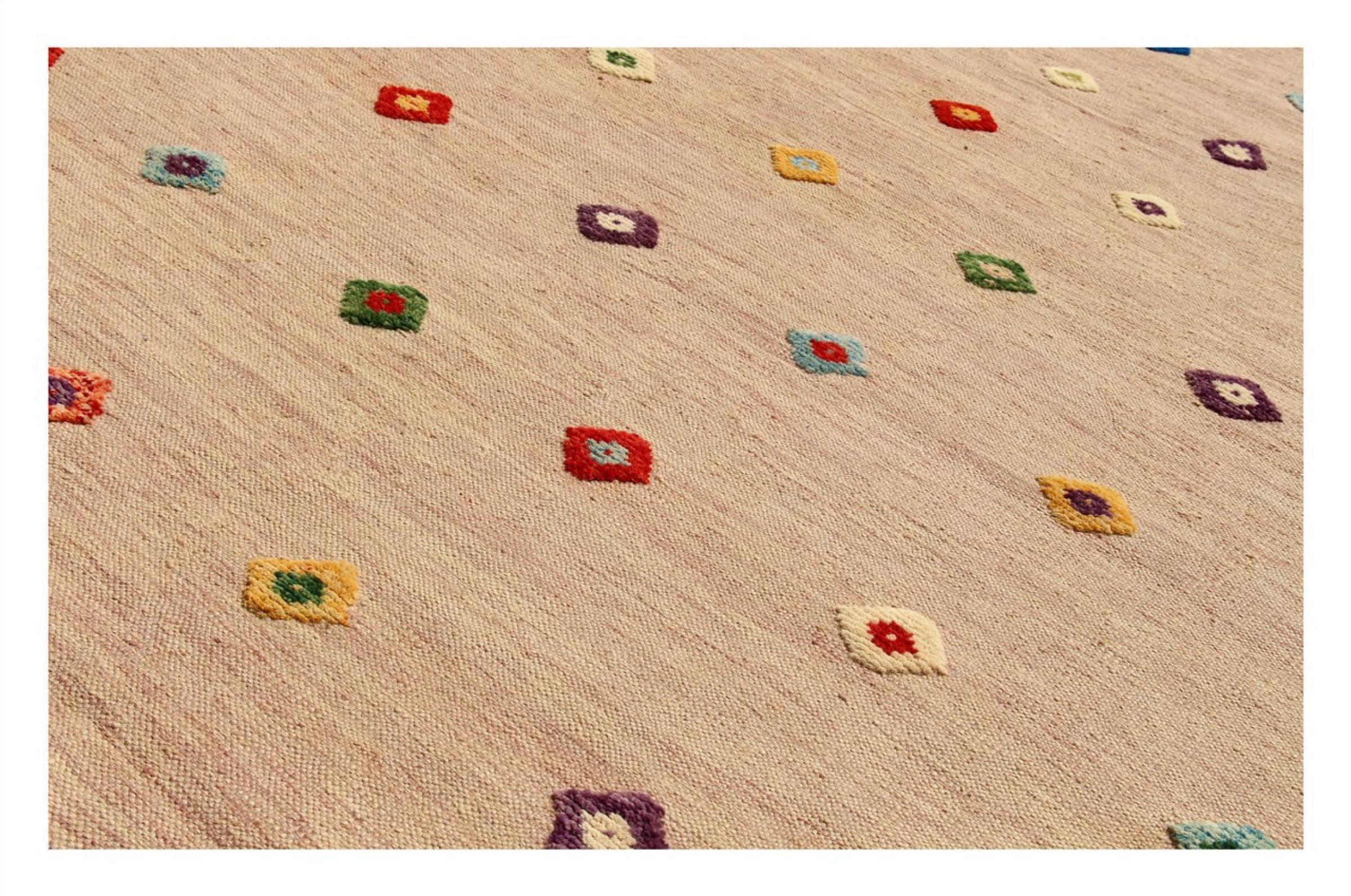 Esta alfombra fue hecha a mano en un telar como un tejido plano. Tejido plano es el término utilizado para describir las alfombras que no tienen pelo. Como el nombre promete, estas alfombras están tejidas y no anudadas. Esto resulta en una alfombra plana con una superficie estructurada. Los tejidos planos no son tan suaves y normalmente más delgados que las alfombras anudadas. Al mismo tiempo, su fabricación es mucho menos compleja y por lo general se pueden disponer por ambos lados (frontal y posterior). Sus patrones suelen ser geométricos, lo cual está determinado por el tejido.