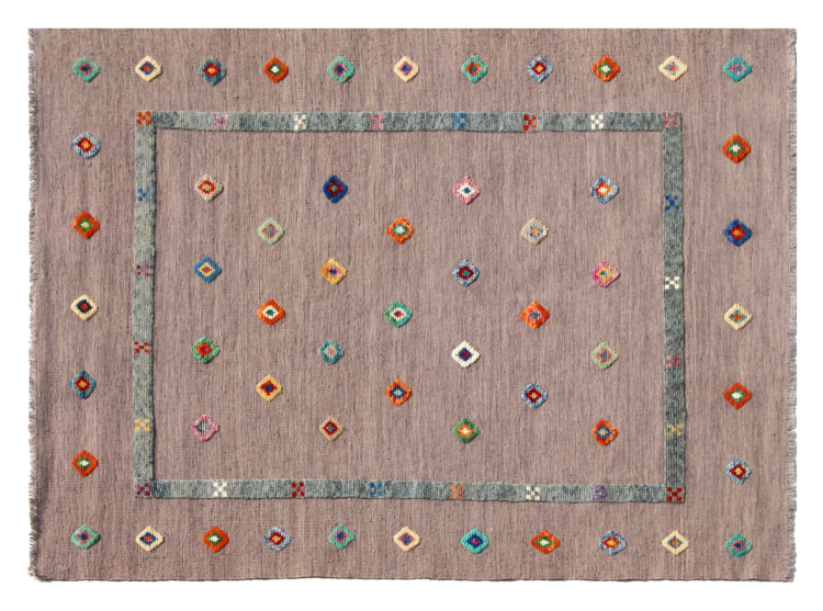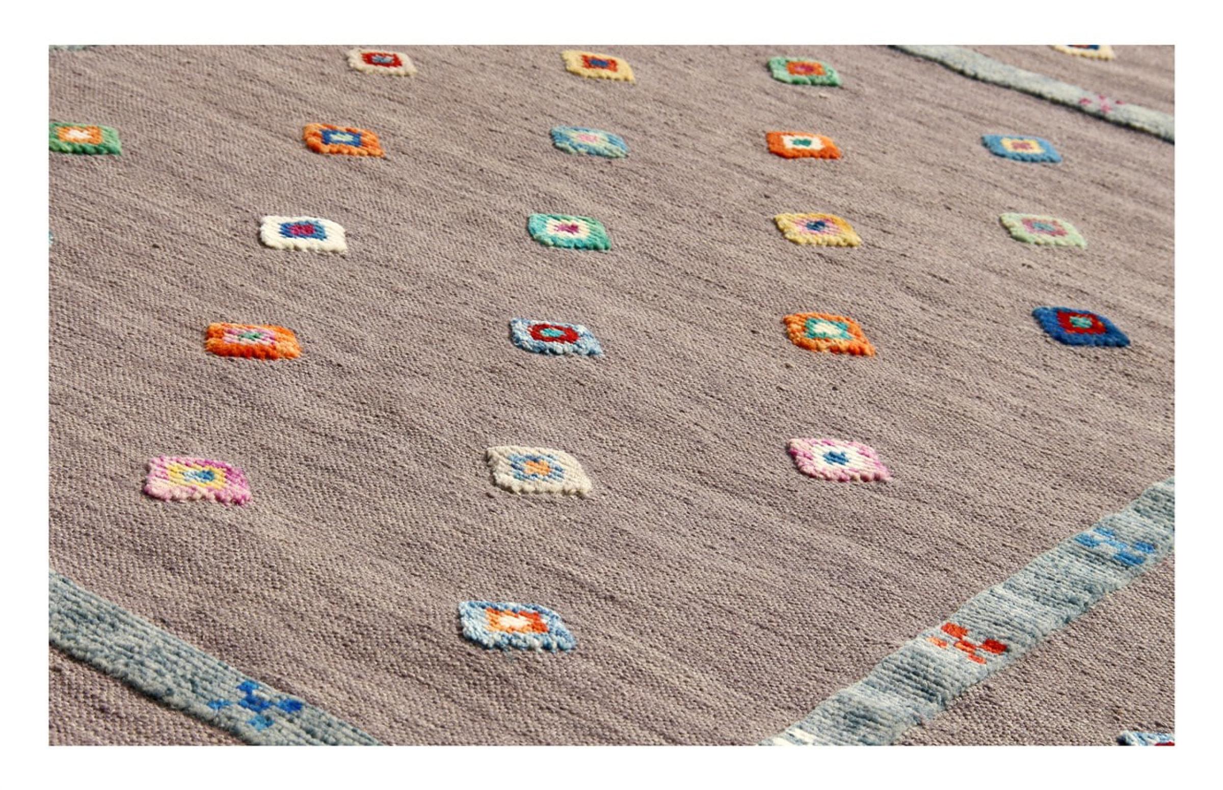 Esta alfombra fue hecha a mano en un telar como un tejido plano. Tejido plano es el término utilizado para describir las alfombras que no tienen pelo. Como el nombre promete, estas alfombras están tejidas y no anudadas. Esto resulta en una alfombra plana con una superficie estructurada. Los tejidos planos no son tan suaves y normalmente más delgados que las alfombras anudadas. Al mismo tiempo, su fabricación es mucho menos compleja y por lo general se pueden disponer por ambos lados (frontal y posterior). Sus patrones suelen ser geométricos, lo cual está determinado por el tejido.