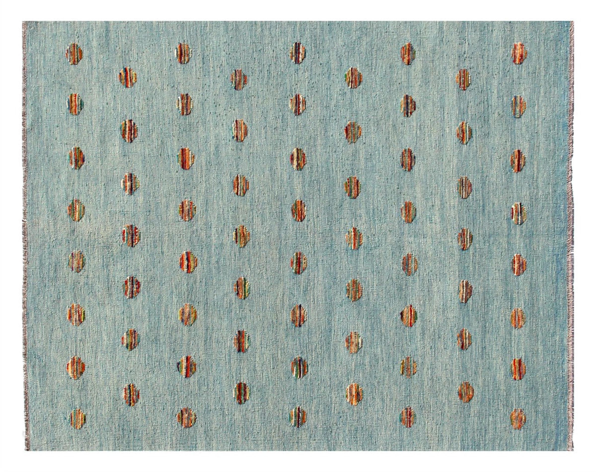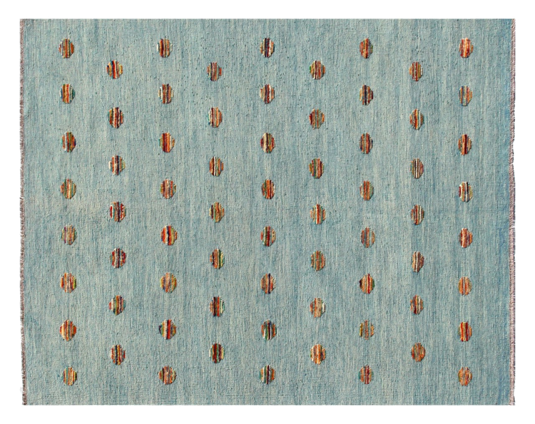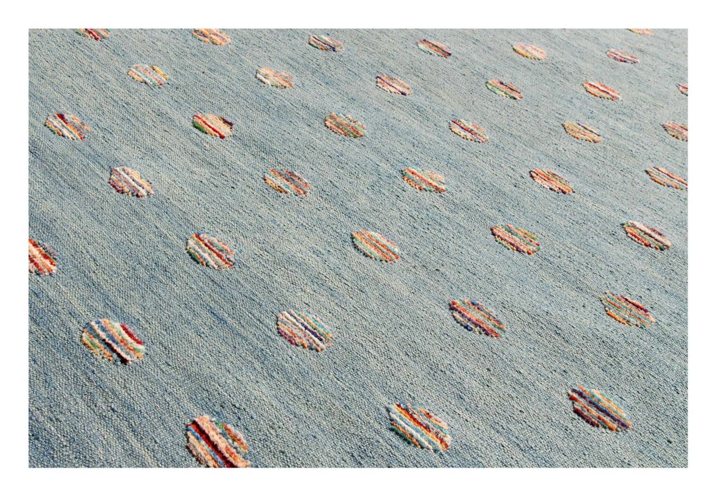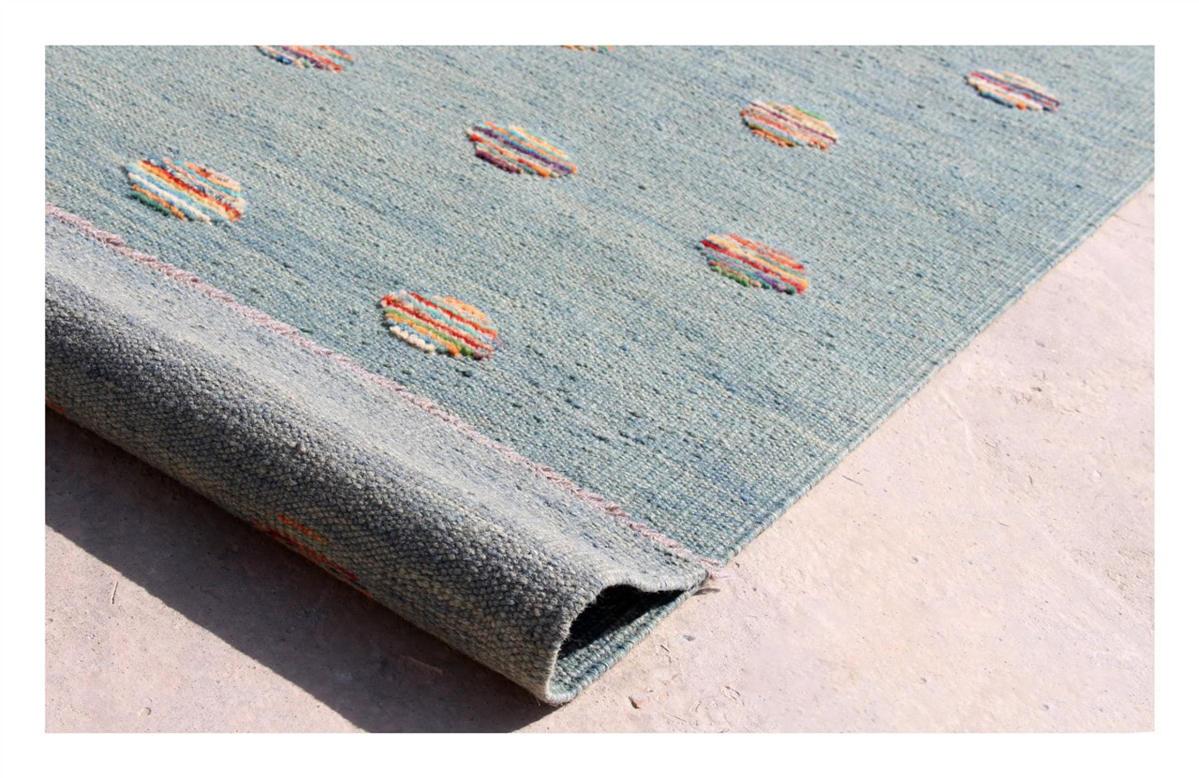 Esta alfombra fue hecha a mano en un telar como un tejido plano. Tejido plano es el término utilizado para describir las alfombras que no tienen pelo. Como el nombre promete, estas alfombras están tejidas y no anudadas. Esto resulta en una alfombra plana con una superficie estructurada. Los tejidos planos no son tan suaves y normalmente más delgados que las alfombras anudadas. Al mismo tiempo, su fabricación es mucho menos compleja y por lo general se pueden disponer por ambos lados (frontal y posterior). Sus patrones suelen ser geométricos, lo cual está determinado por el tejido.