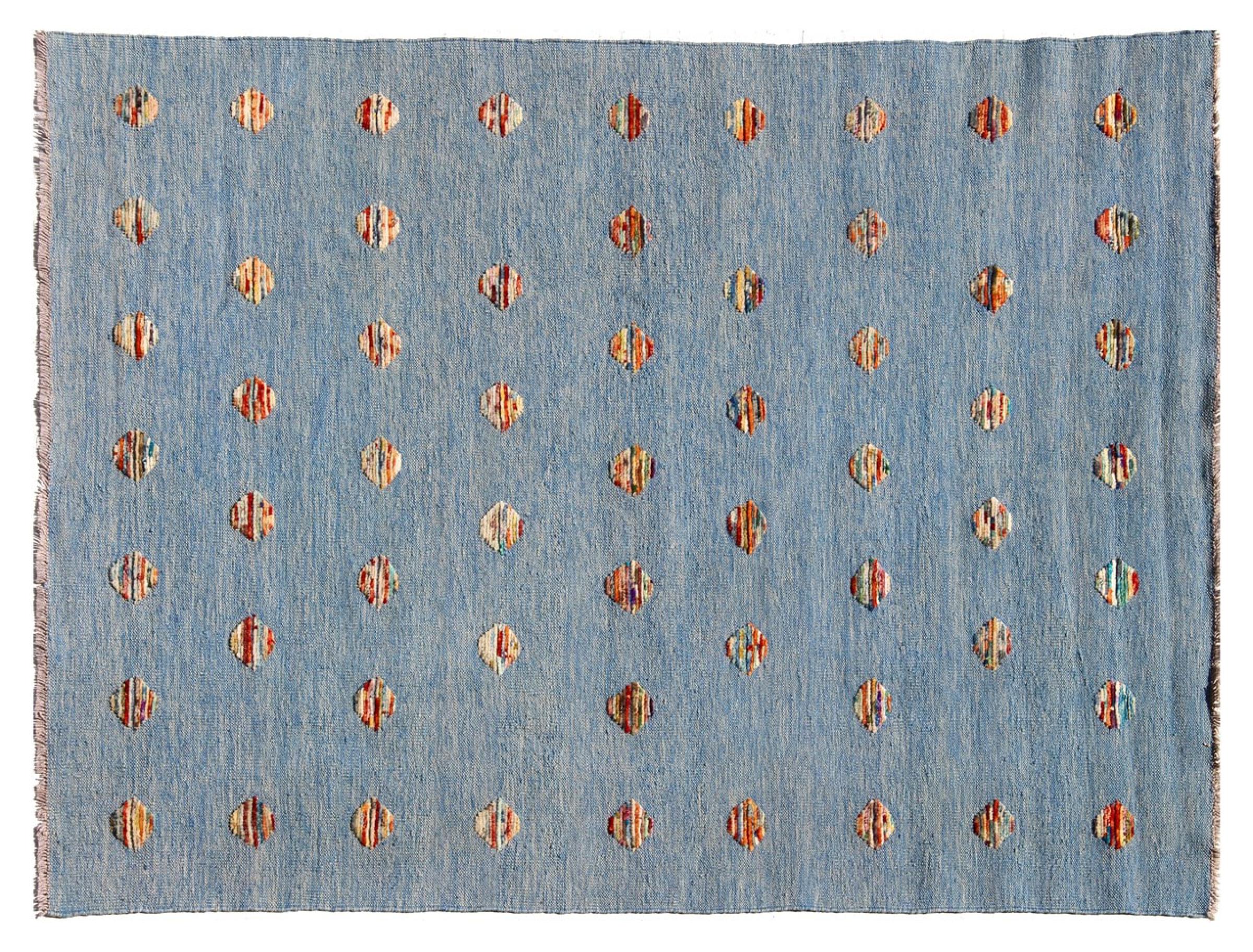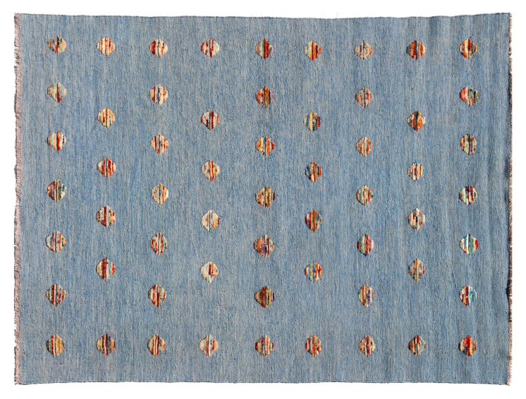 Esta alfombra fue hecha a mano en un telar como un tejido plano. Tejido plano es el término utilizado para describir las alfombras que no tienen pelo. Como el nombre promete, estas alfombras están tejidas y no anudadas. Esto resulta en una alfombra plana con una superficie estructurada. Los tejidos planos no son tan suaves y normalmente más delgados que las alfombras anudadas. Al mismo tiempo, su fabricación es mucho menos compleja y por lo general se pueden disponer por ambos lados (frontal y posterior). Sus patrones suelen ser geométricos, lo cual está determinado por el tejido.