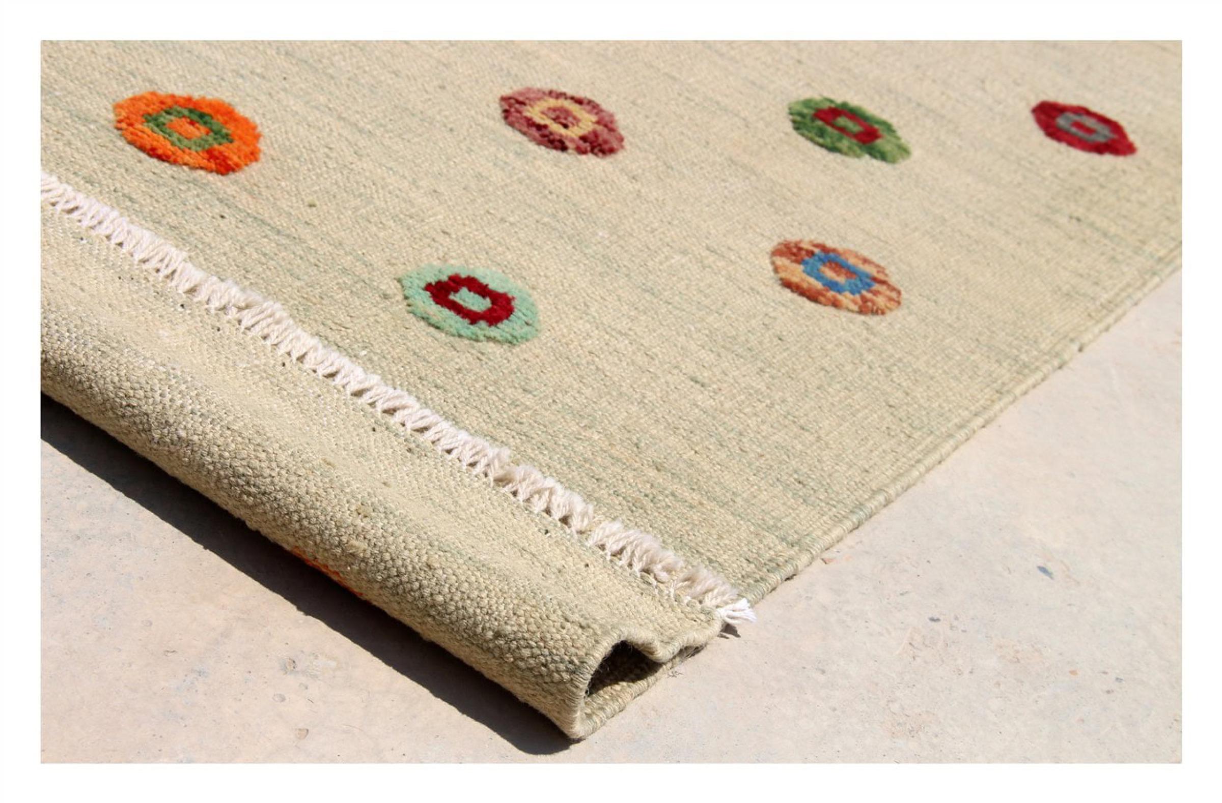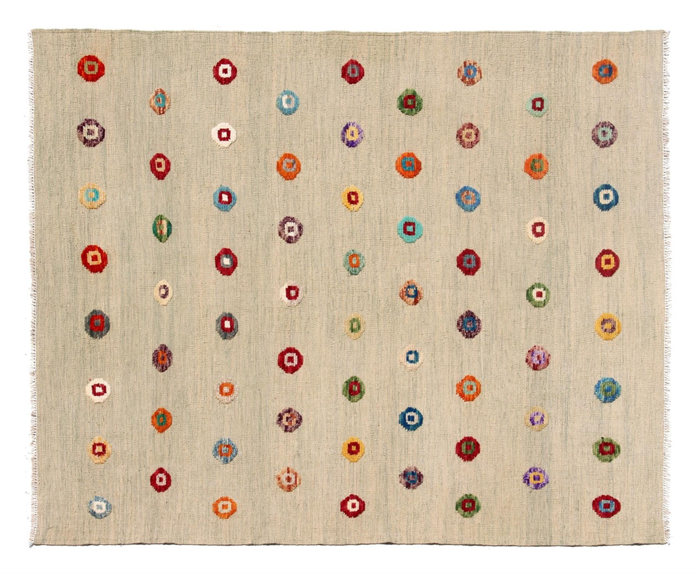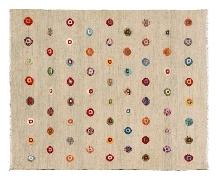 Esta alfombra fue hecha a mano en un telar como un tejido plano. Tejido plano es el término utilizado para describir las alfombras que no tienen pelo. Como el nombre promete, estas alfombras están tejidas y no anudadas. Esto resulta en una alfombra plana con una superficie estructurada. Los tejidos planos no son tan suaves y normalmente más delgados que las alfombras anudadas. Al mismo tiempo, su fabricación es mucho menos compleja y por lo general se pueden disponer por ambos lados (frontal y posterior). Sus patrones suelen ser geométricos, lo cual está determinado por el tejido.