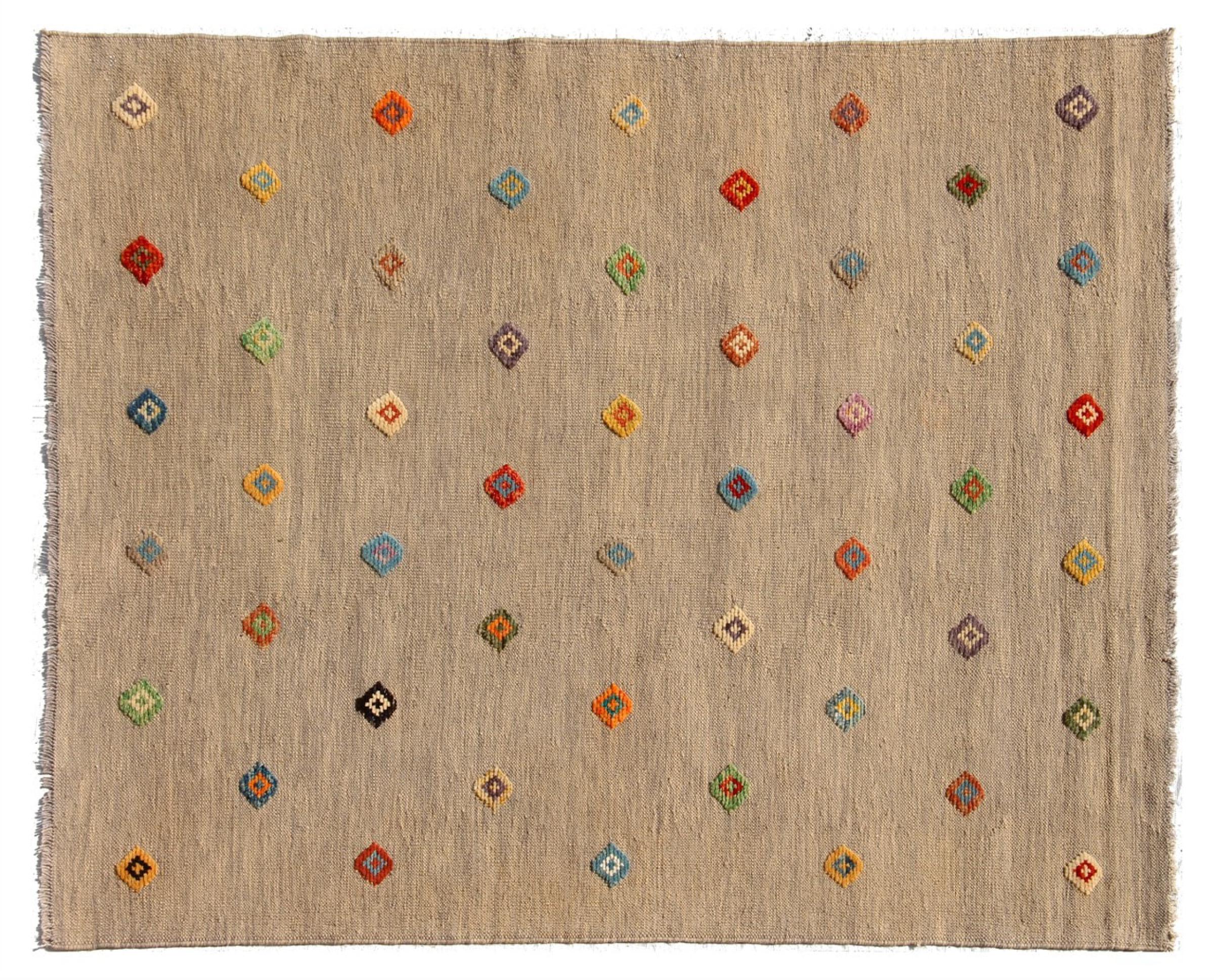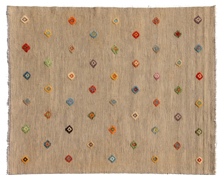 Esta alfombra fue hecha a mano en un telar como un tejido plano. Tejido plano es el término utilizado para describir las alfombras que no tienen pelo. Como el nombre promete, estas alfombras están tejidas y no anudadas. Esto resulta en una alfombra plana con una superficie estructurada. Los tejidos planos no son tan suaves y normalmente más delgados que las alfombras anudadas. Al mismo tiempo, su fabricación es mucho menos compleja y por lo general se pueden disponer por ambos lados (frontal y posterior). Sus patrones suelen ser geométricos, lo cual está determinado por el tejido.