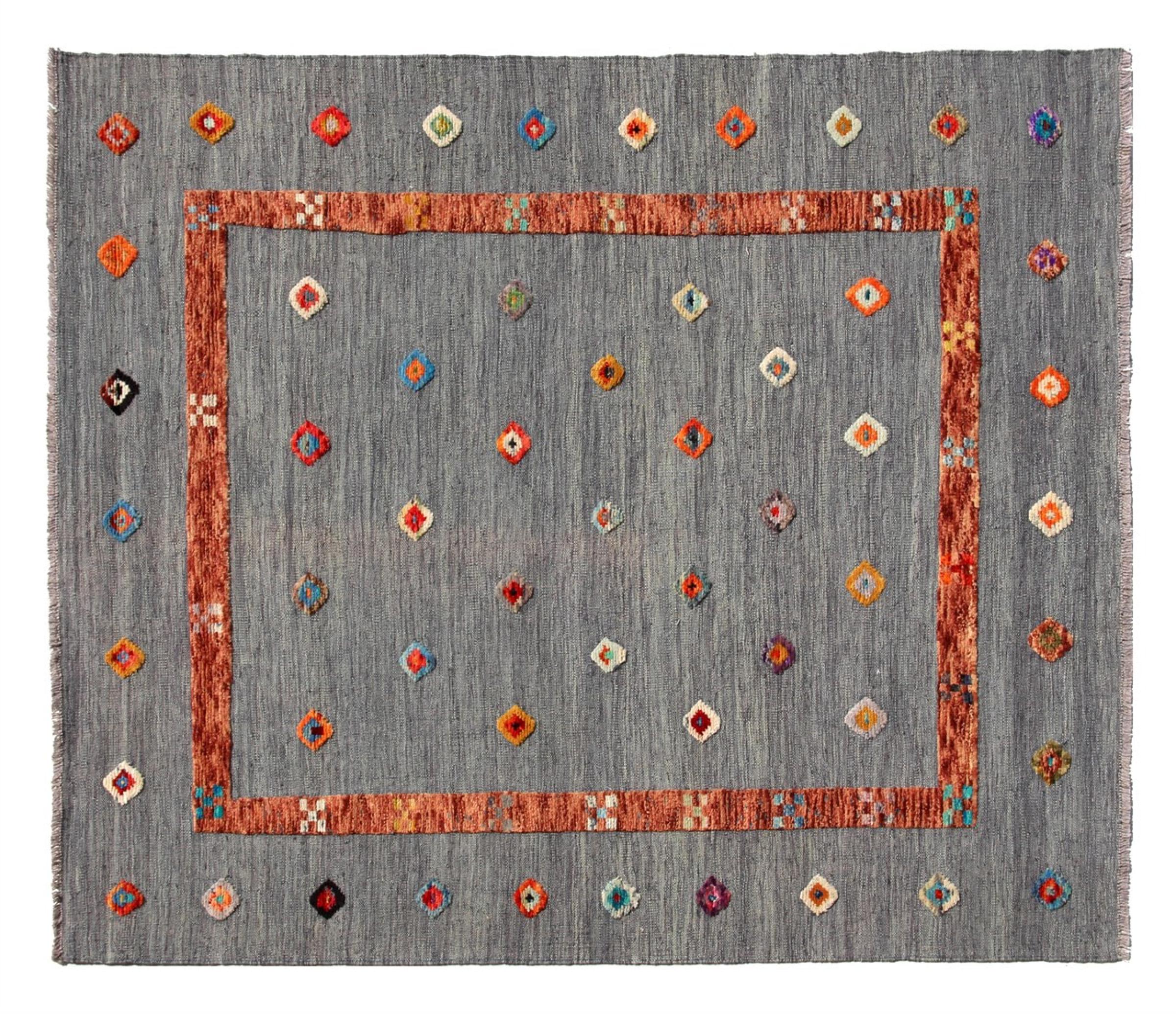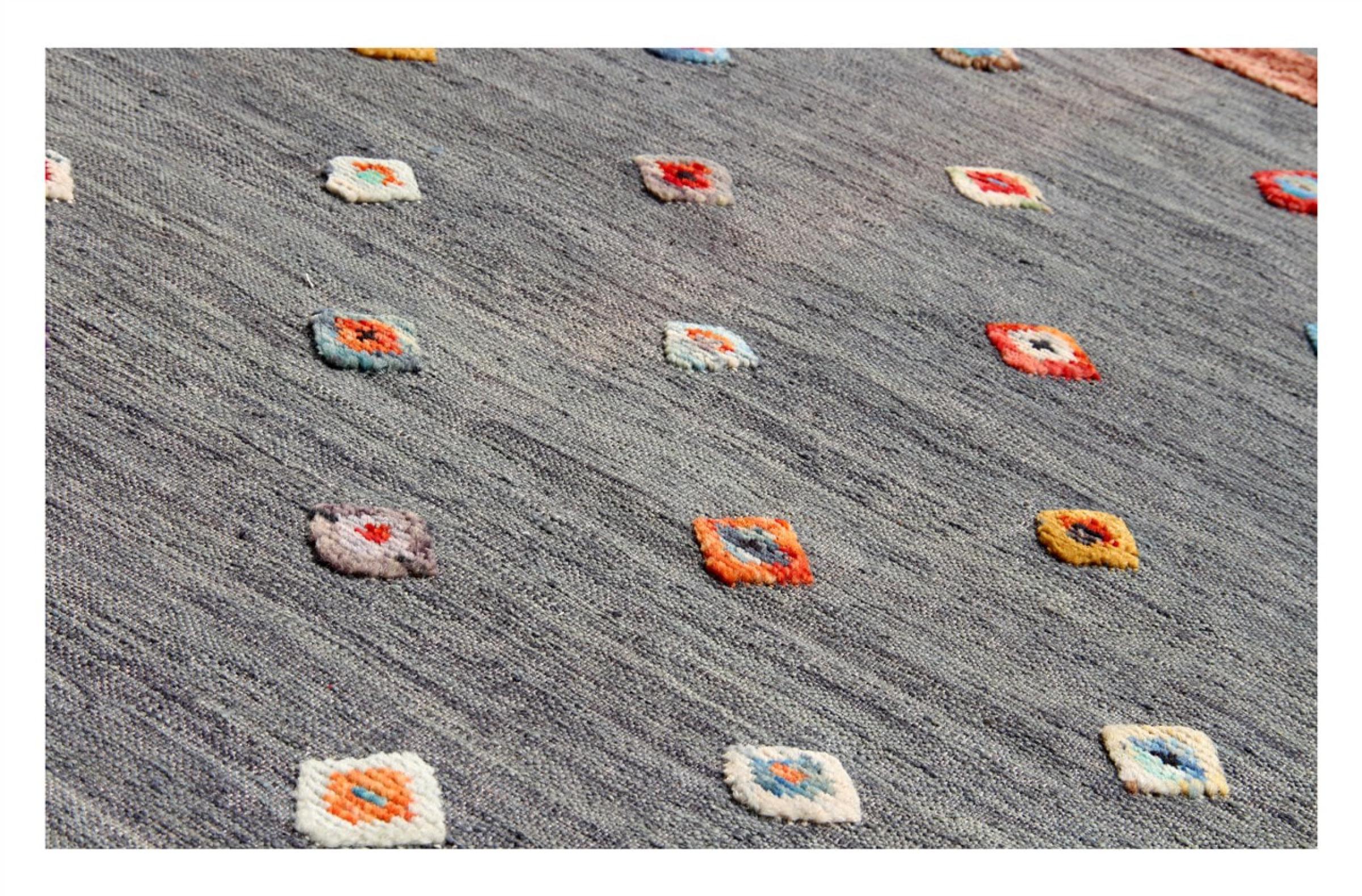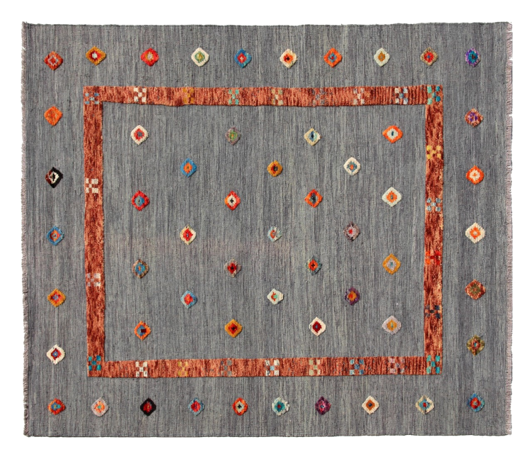 Esta alfombra fue hecha a mano en un telar como un tejido plano. Tejido plano es el término utilizado para describir las alfombras que no tienen pelo. Como el nombre promete, estas alfombras están tejidas y no anudadas. Esto resulta en una alfombra plana con una superficie estructurada. Los tejidos planos no son tan suaves y normalmente más delgados que las alfombras anudadas. Al mismo tiempo, su fabricación es mucho menos compleja y por lo general se pueden disponer por ambos lados (frontal y posterior). Sus patrones suelen ser geométricos, lo cual está determinado por el tejido.