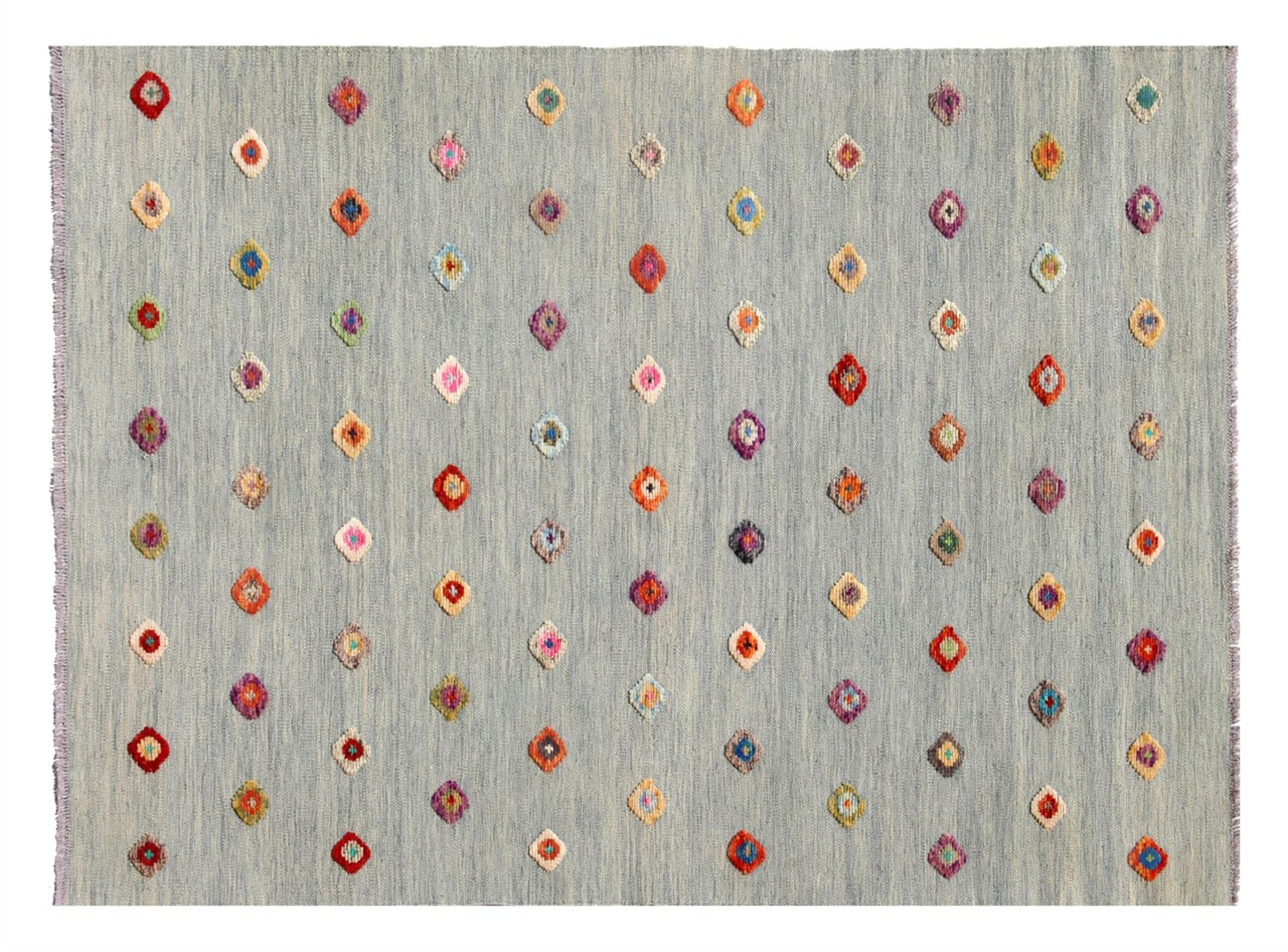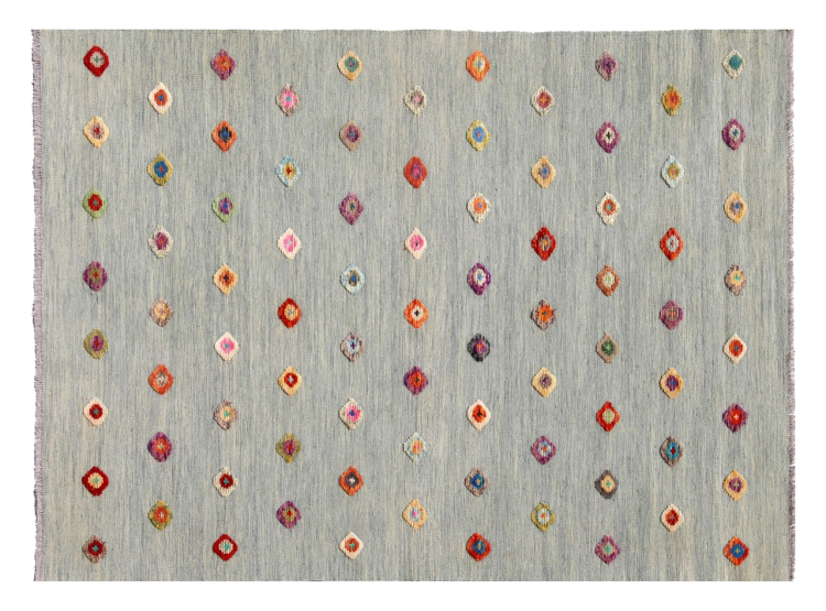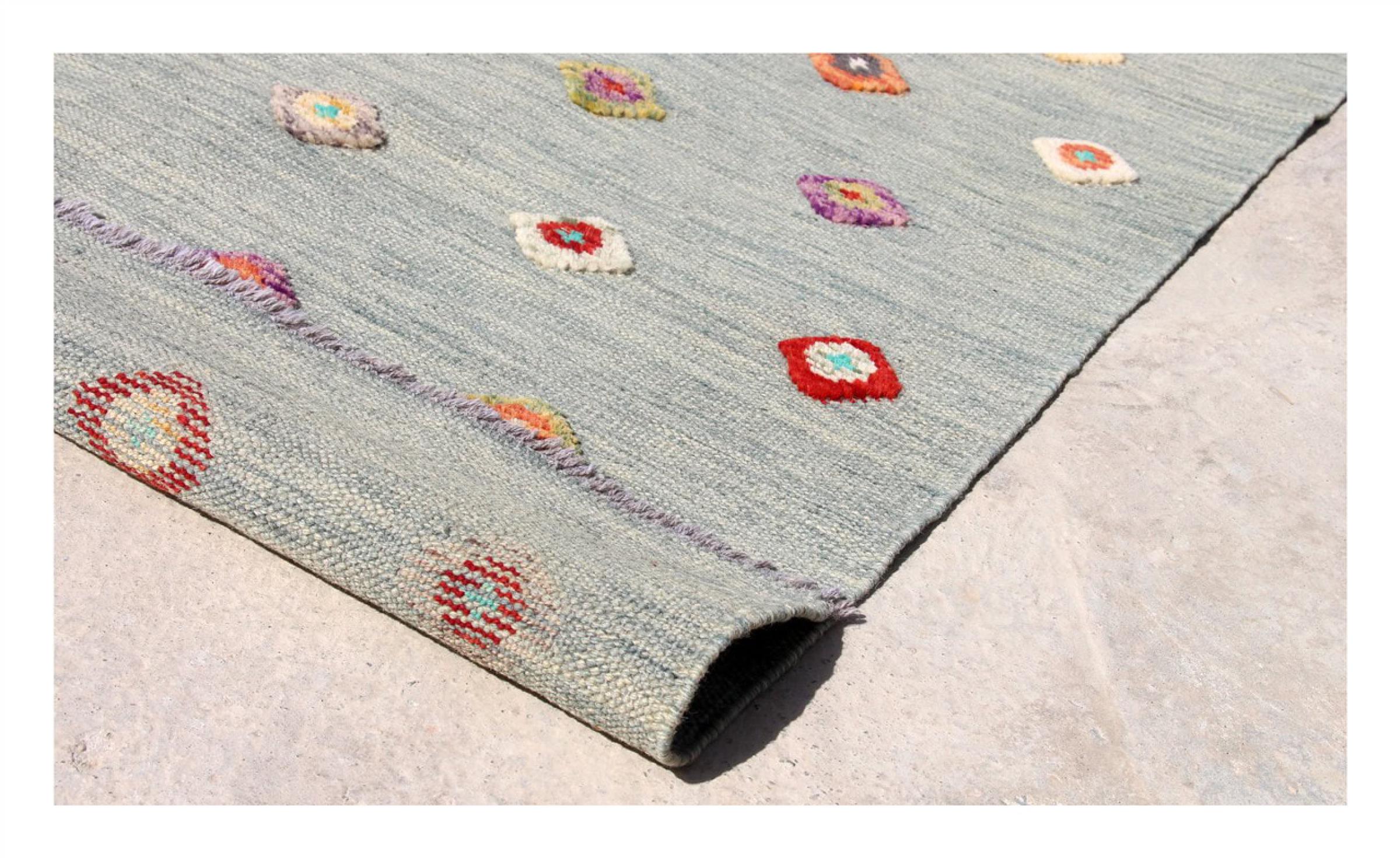 Esta alfombra fue hecha a mano en un telar como un tejido plano. Tejido plano es el término utilizado para describir las alfombras que no tienen pelo. Como el nombre promete, estas alfombras están tejidas y no anudadas. Esto resulta en una alfombra plana con una superficie estructurada. Los tejidos planos no son tan suaves y normalmente más delgados que las alfombras anudadas. Al mismo tiempo, su fabricación es mucho menos compleja y por lo general se pueden disponer por ambos lados (frontal y posterior). Sus patrones suelen ser geométricos, lo cual está determinado por el tejido.
