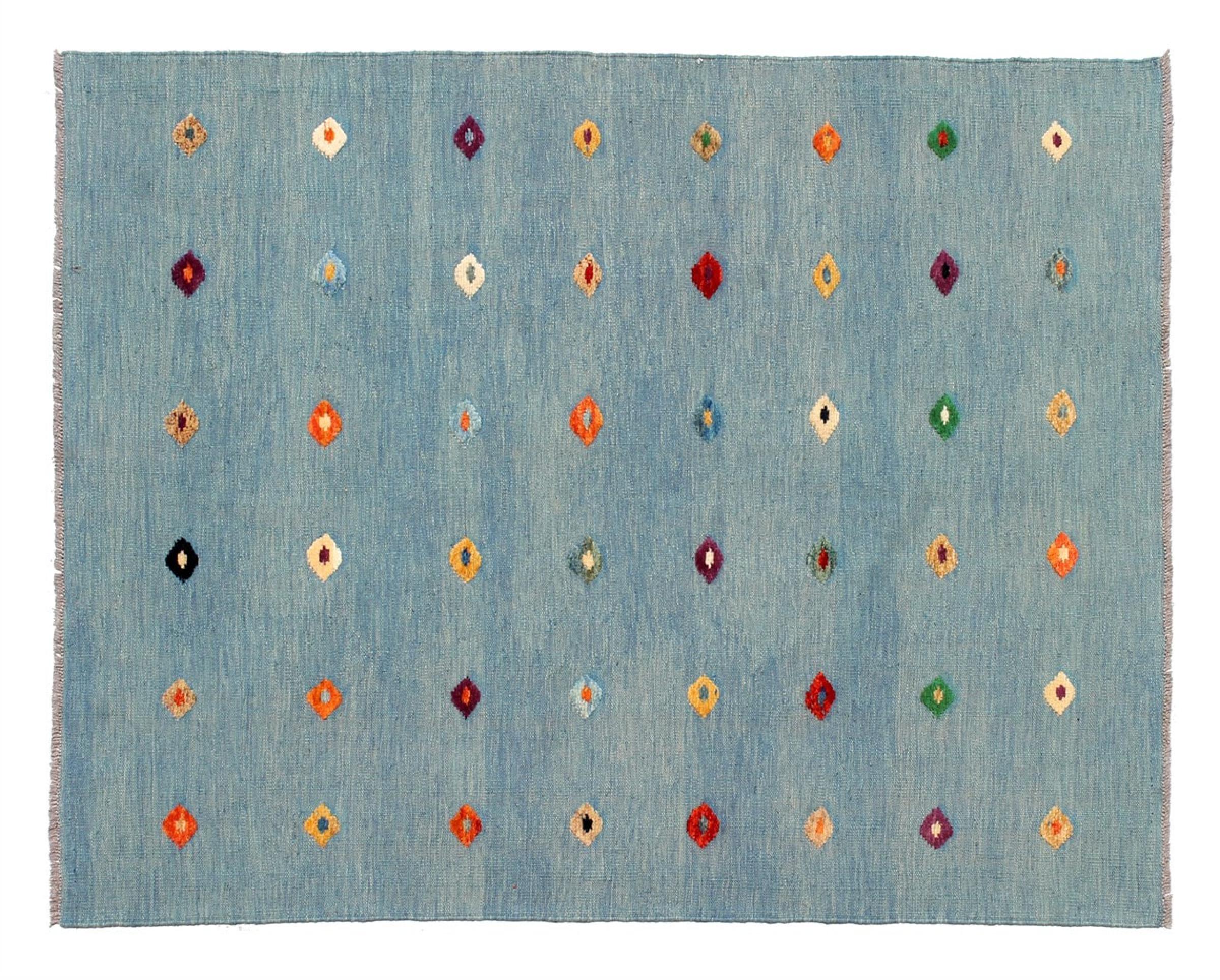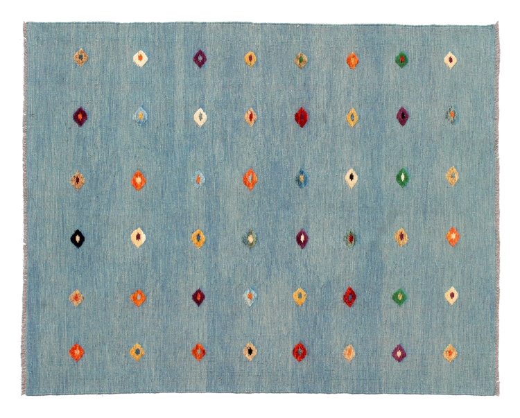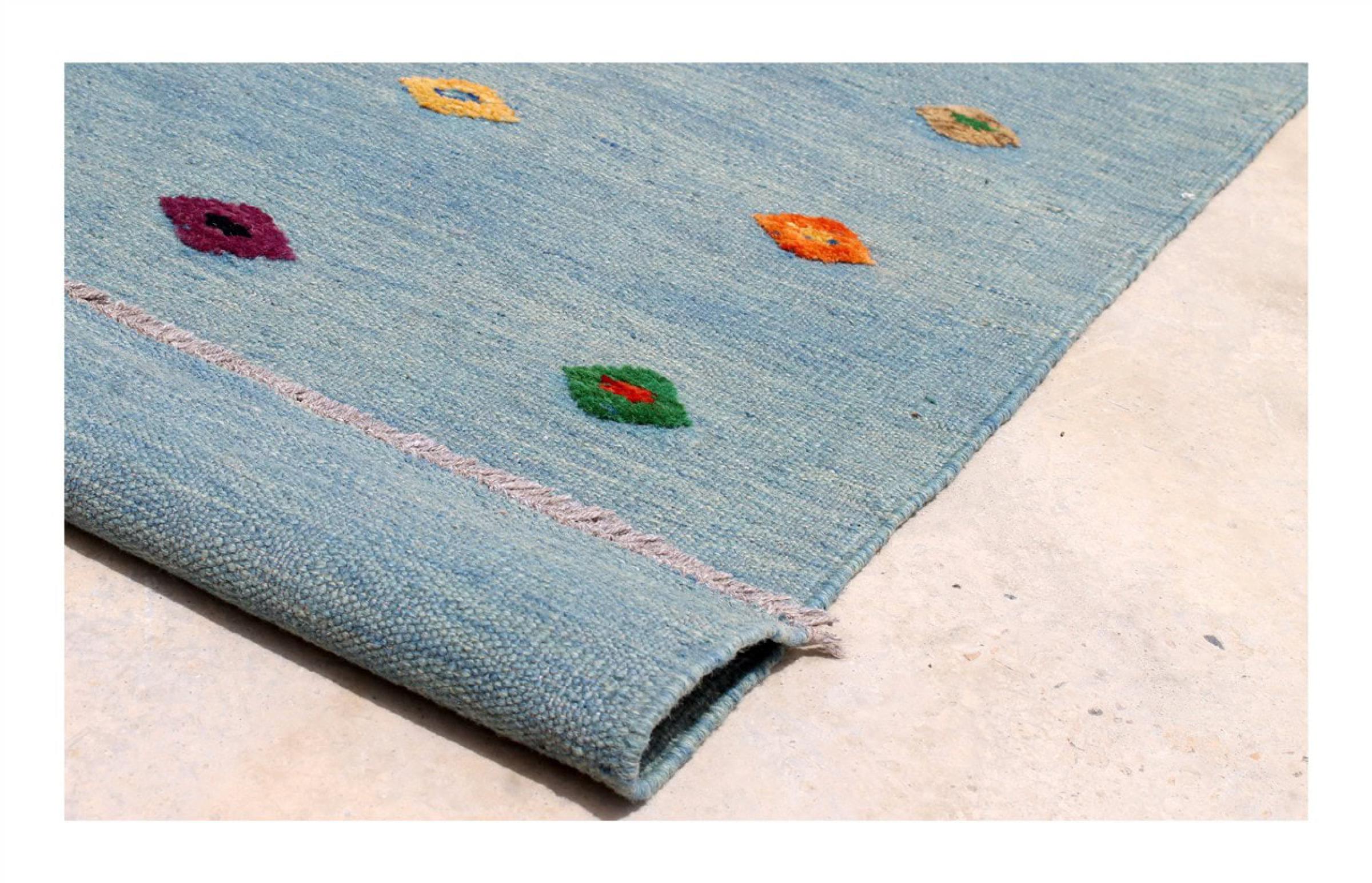 Esta alfombra fue hecha a mano en un telar como un tejido plano. Tejido plano es el término utilizado para describir las alfombras que no tienen pelo. Como el nombre promete, estas alfombras están tejidas y no anudadas. Esto resulta en una alfombra plana con una superficie estructurada. Los tejidos planos no son tan suaves y normalmente más delgados que las alfombras anudadas. Al mismo tiempo, su fabricación es mucho menos compleja y por lo general se pueden disponer por ambos lados (frontal y posterior). Sus patrones suelen ser geométricos, lo cual está determinado por el tejido.