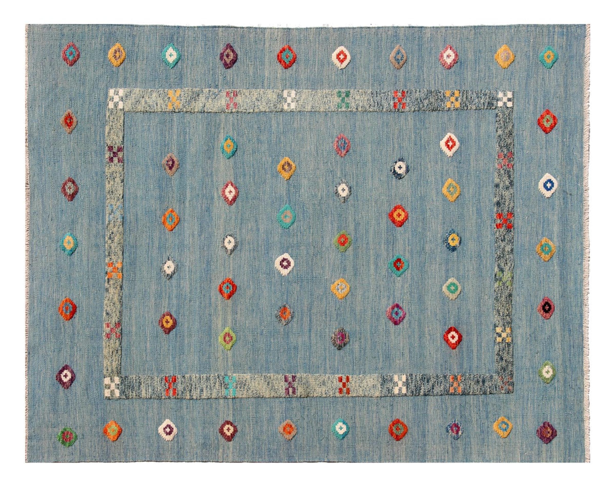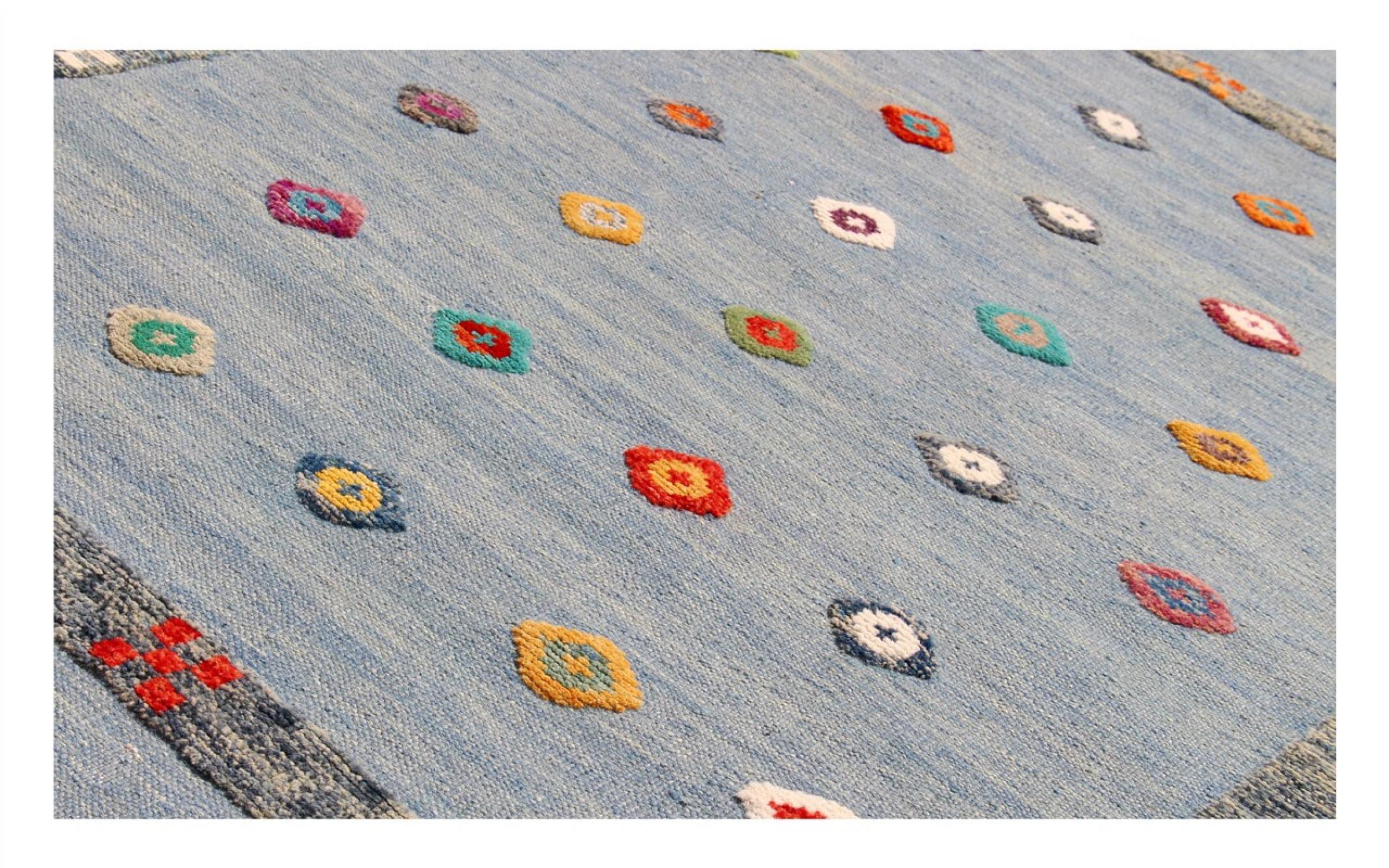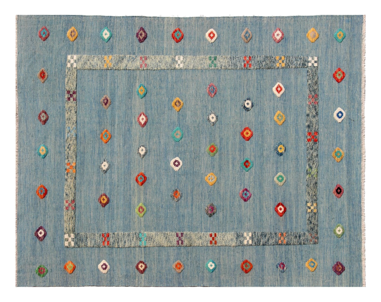Esta alfombra fue hecha a mano en un telar como un tejido plano. Tejido plano es el término utilizado para describir las alfombras que no tienen pelo. Como el nombre promete, estas alfombras están tejidas y no anudadas. Esto resulta en una alfombra plana con una superficie estructurada. Los tejidos planos no son tan suaves y normalmente más delgados que las alfombras anudadas. Al mismo tiempo, su fabricación es mucho menos compleja y por lo general se pueden disponer por ambos lados (frontal y posterior). Sus patrones suelen ser geométricos, lo cual está determinado por el tejido.