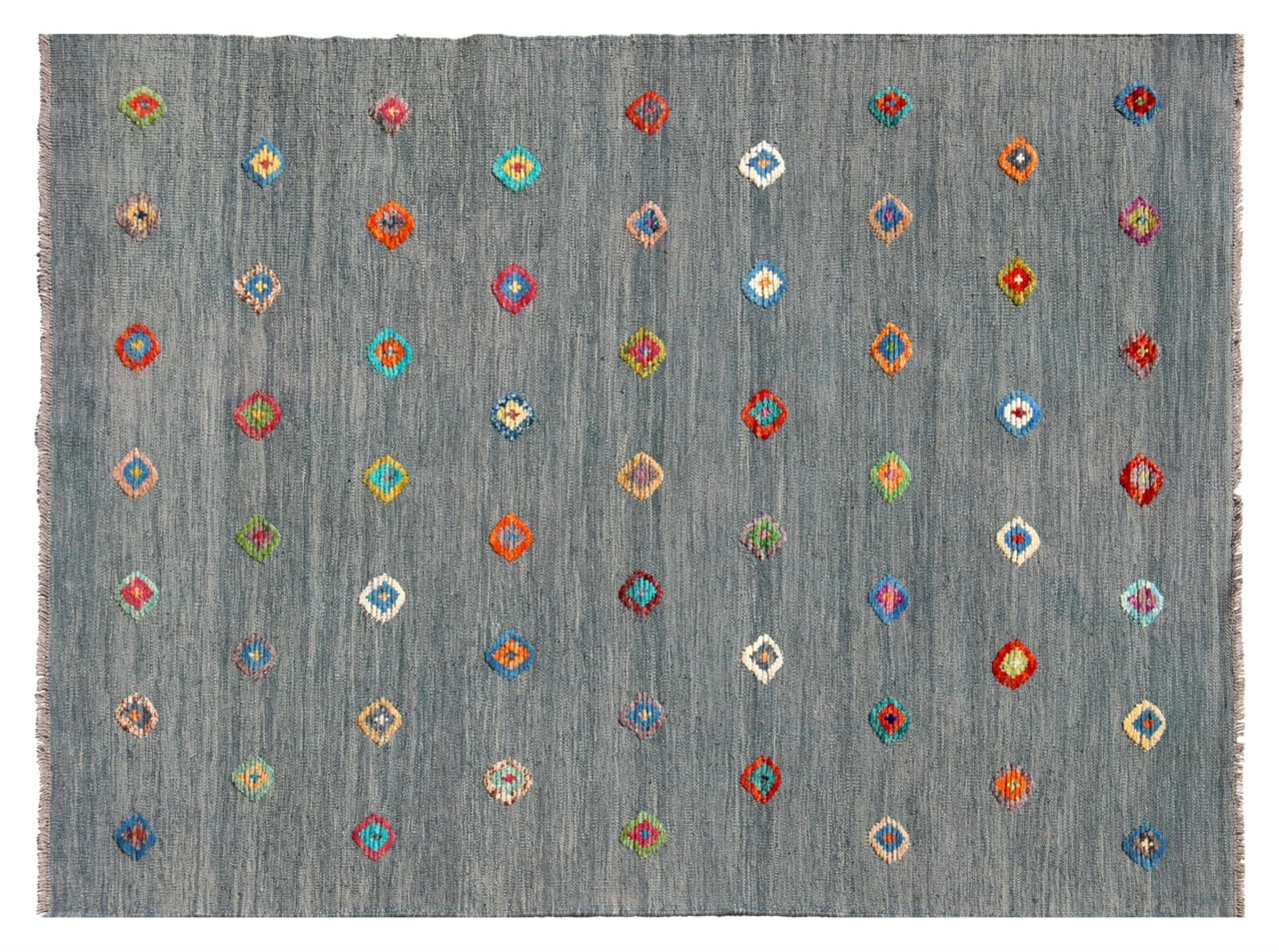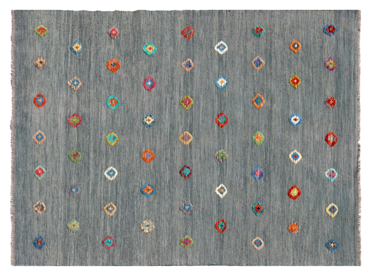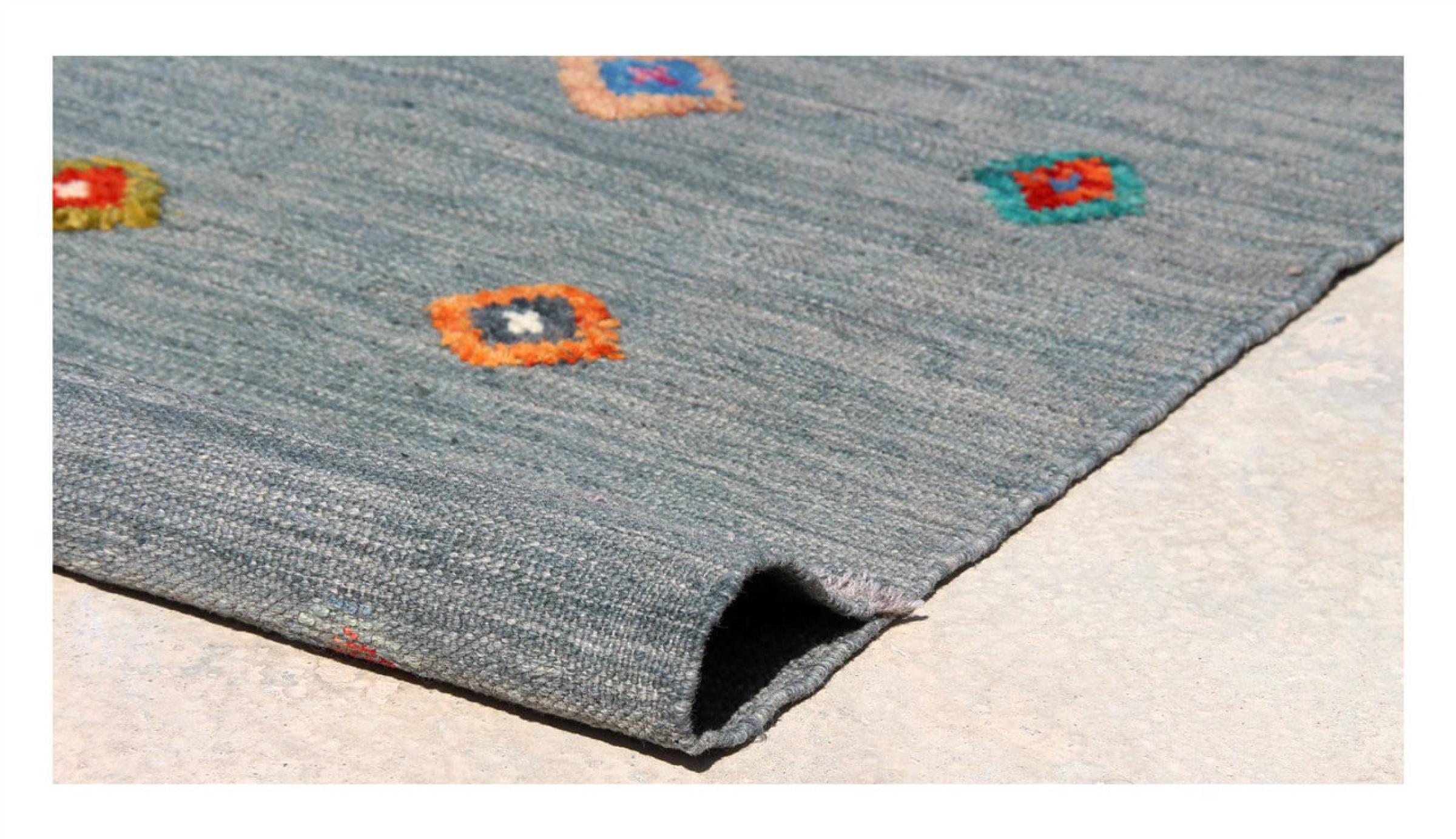 Esta alfombra fue hecha a mano en un telar como un tejido plano. Tejido plano es el término utilizado para describir las alfombras que no tienen pelo. Como el nombre promete, estas alfombras están tejidas y no anudadas. Esto resulta en una alfombra plana con una superficie estructurada. Los tejidos planos no son tan suaves y normalmente más delgados que las alfombras anudadas. Al mismo tiempo, su fabricación es mucho menos compleja y por lo general se pueden disponer por ambos lados (frontal y posterior). Sus patrones suelen ser geométricos, lo cual está determinado por el tejido.