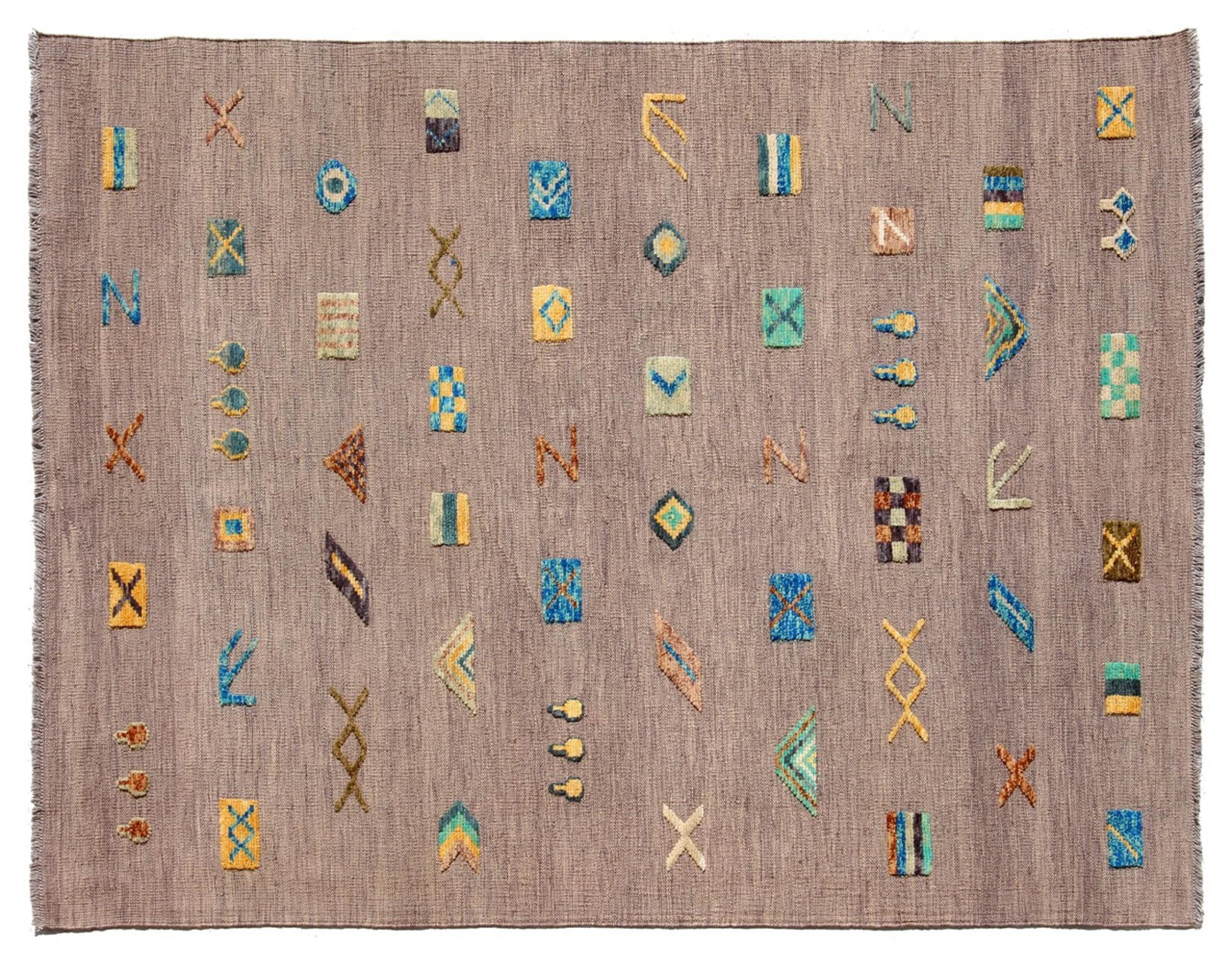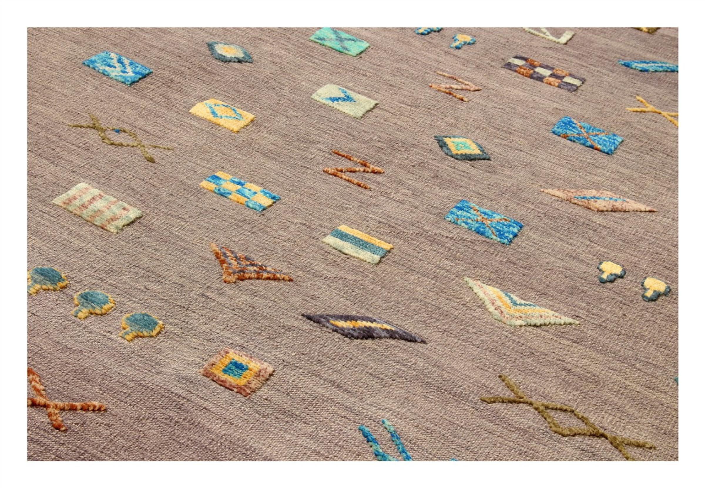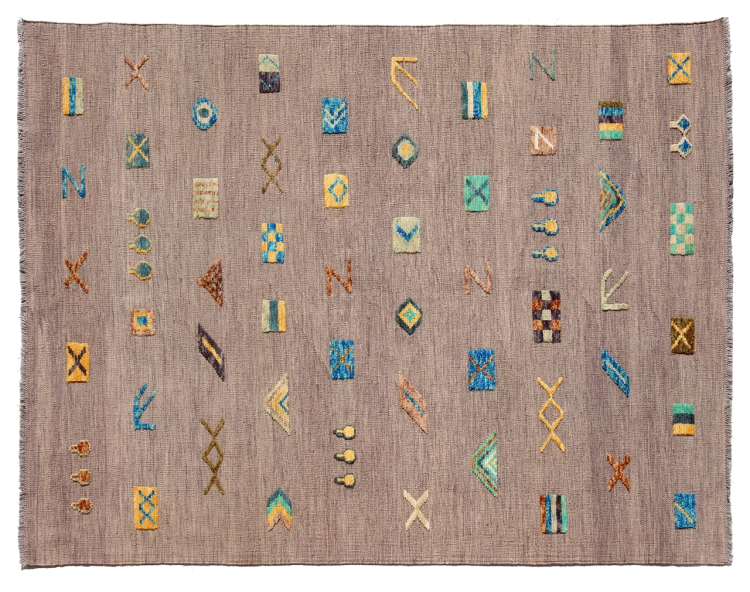 Esta alfombra fue hecha a mano en un telar como un tejido plano. Tejido plano es el término utilizado para describir las alfombras que no tienen pelo. Como el nombre promete, estas alfombras están tejidas y no anudadas. Esto resulta en una alfombra plana con una superficie estructurada. Los tejidos planos no son tan suaves y normalmente más delgados que las alfombras anudadas. Al mismo tiempo, su fabricación es mucho menos compleja y por lo general se pueden disponer por ambos lados (frontal y posterior). Sus patrones suelen ser geométricos, lo cual está determinado por el tejido.
