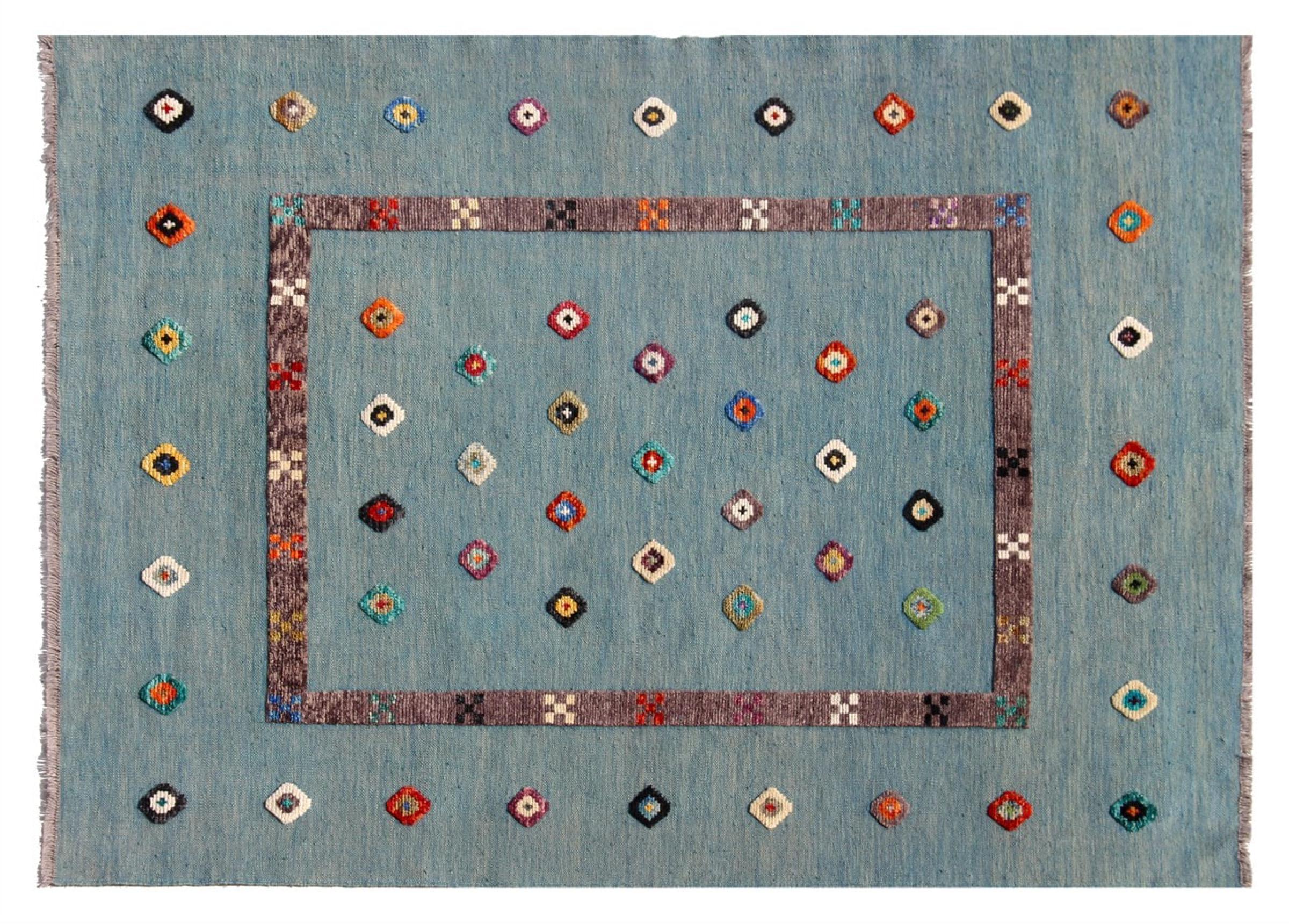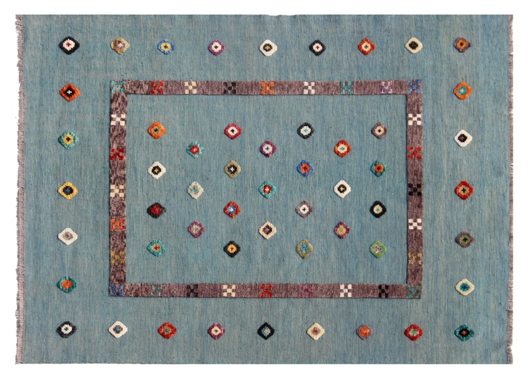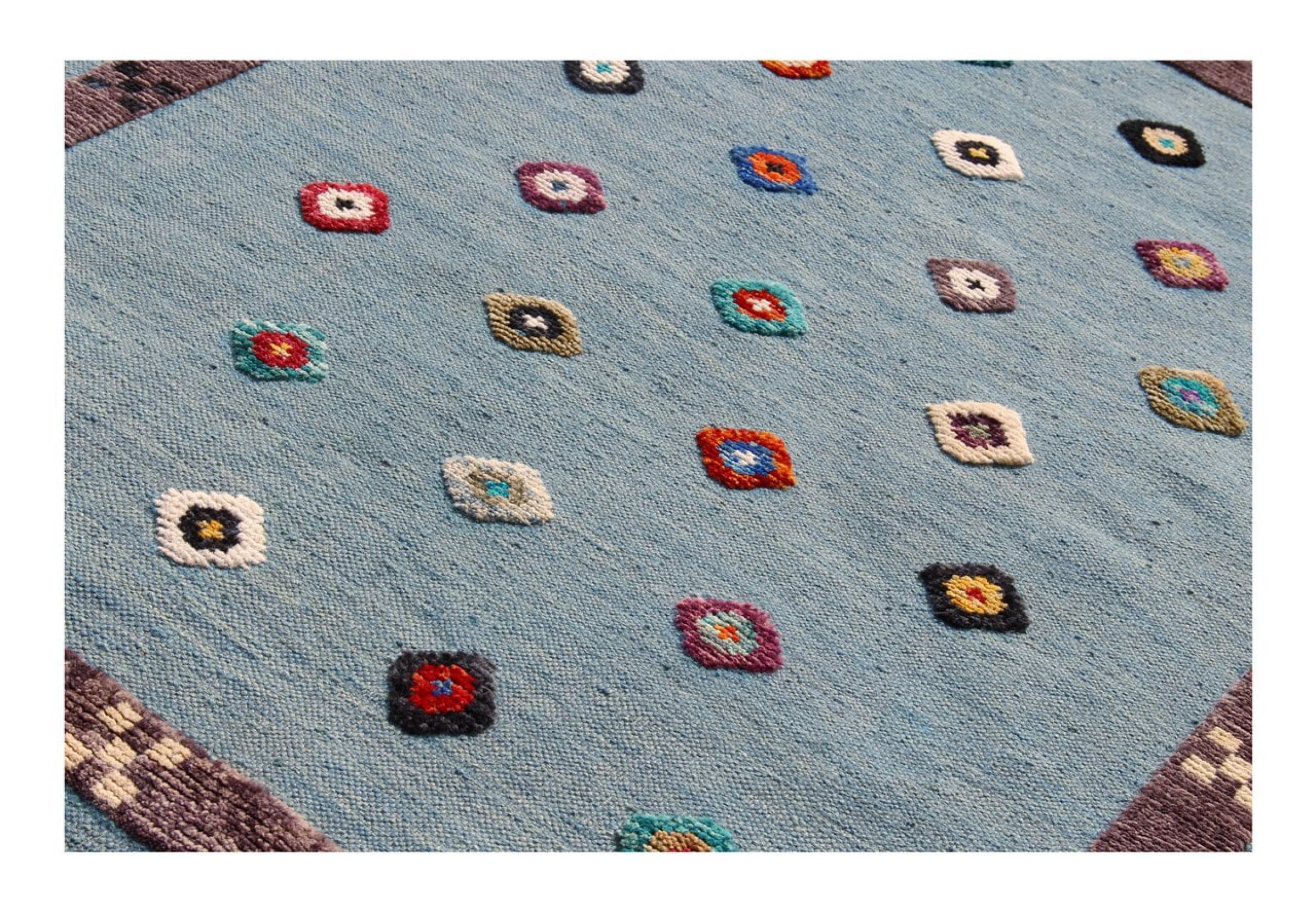Esta alfombra fue hecha a mano en un telar como un tejido plano. Tejido plano es el término utilizado para describir las alfombras que no tienen pelo. Como el nombre promete, estas alfombras están tejidas y no anudadas. Esto resulta en una alfombra plana con una superficie estructurada. Los tejidos planos no son tan suaves y normalmente más delgados que las alfombras anudadas. Al mismo tiempo, su fabricación es mucho menos compleja y por lo general se pueden disponer por ambos lados (frontal y posterior). Sus patrones suelen ser geométricos, lo cual está determinado por el tejido.