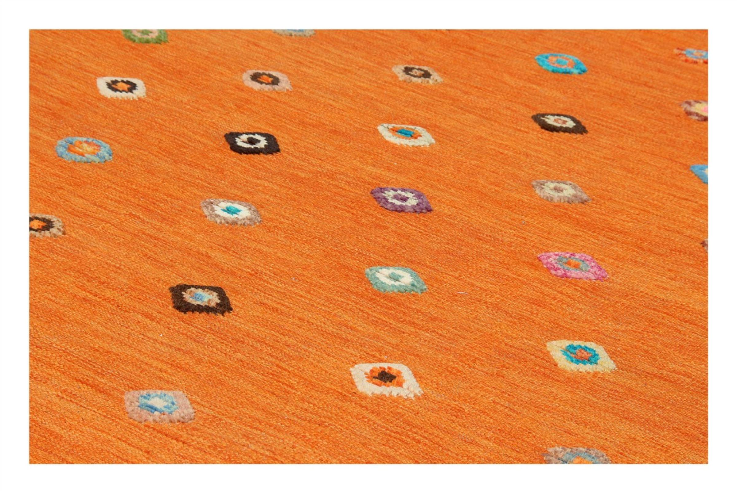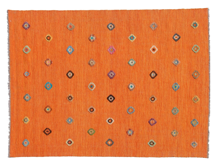 Esta alfombra fue hecha a mano en un telar como un tejido plano. Tejido plano es el término utilizado para describir las alfombras que no tienen pelo. Como el nombre promete, estas alfombras están tejidas y no anudadas. Esto resulta en una alfombra plana con una superficie estructurada. Los tejidos planos no son tan suaves y normalmente más delgados que las alfombras anudadas. Al mismo tiempo, su fabricación es mucho menos compleja y por lo general se pueden disponer por ambos lados (frontal y posterior). Sus patrones suelen ser geométricos, lo cual está determinado por el tejido.