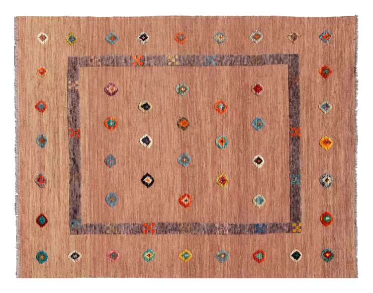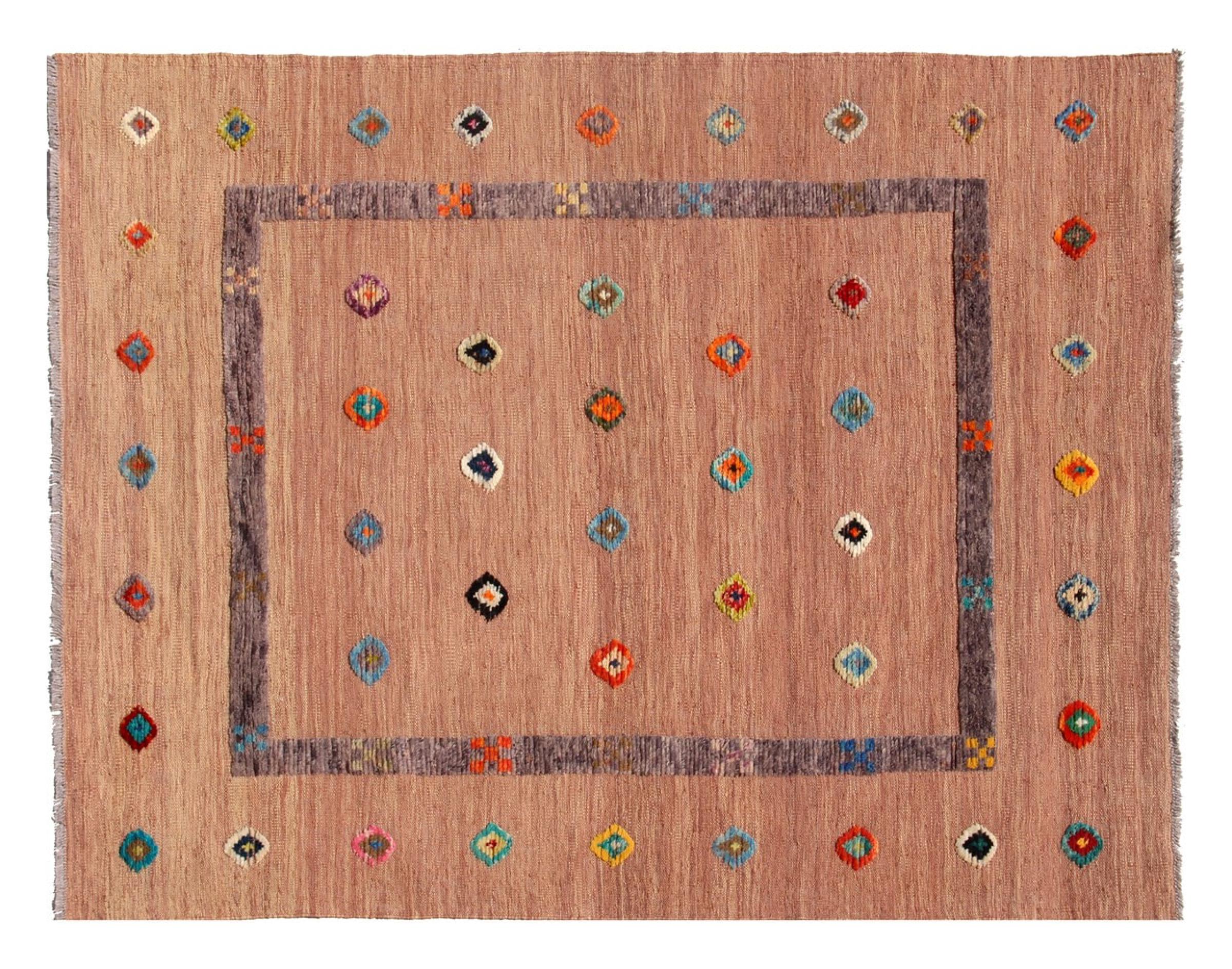 Esta alfombra fue hecha a mano en un telar como un tejido plano. Tejido plano es el término utilizado para describir las alfombras que no tienen pelo. Como el nombre promete, estas alfombras están tejidas y no anudadas. Esto resulta en una alfombra plana con una superficie estructurada. Los tejidos planos no son tan suaves y normalmente más delgados que las alfombras anudadas. Al mismo tiempo, su fabricación es mucho menos compleja y por lo general se pueden disponer por ambos lados (frontal y posterior). Sus patrones suelen ser geométricos, lo cual está determinado por el tejido.