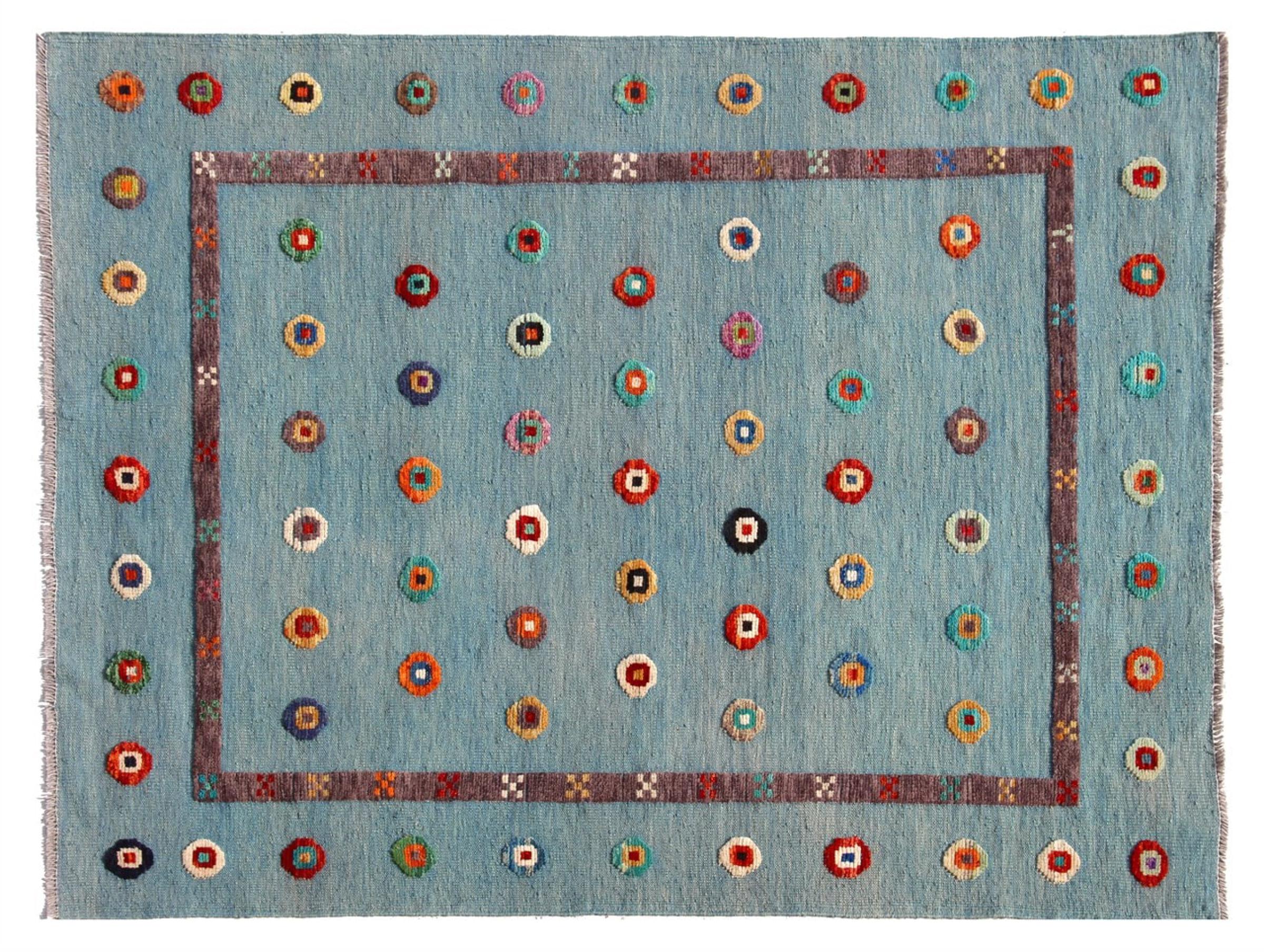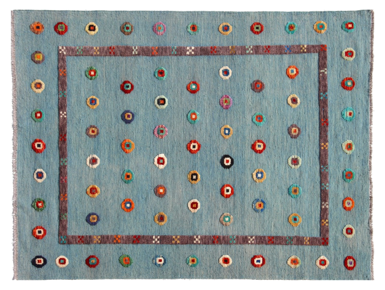 Esta alfombra fue hecha a mano en un telar como un tejido plano. Tejido plano es el término utilizado para describir las alfombras que no tienen pelo. Como el nombre promete, estas alfombras están tejidas y no anudadas. Esto resulta en una alfombra plana con una superficie estructurada. Los tejidos planos no son tan suaves y normalmente más delgados que las alfombras anudadas. Al mismo tiempo, su fabricación es mucho menos compleja y por lo general se pueden disponer por ambos lados (frontal y posterior). Sus patrones suelen ser geométricos, lo cual está determinado por el tejido.