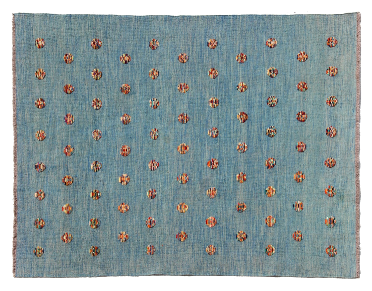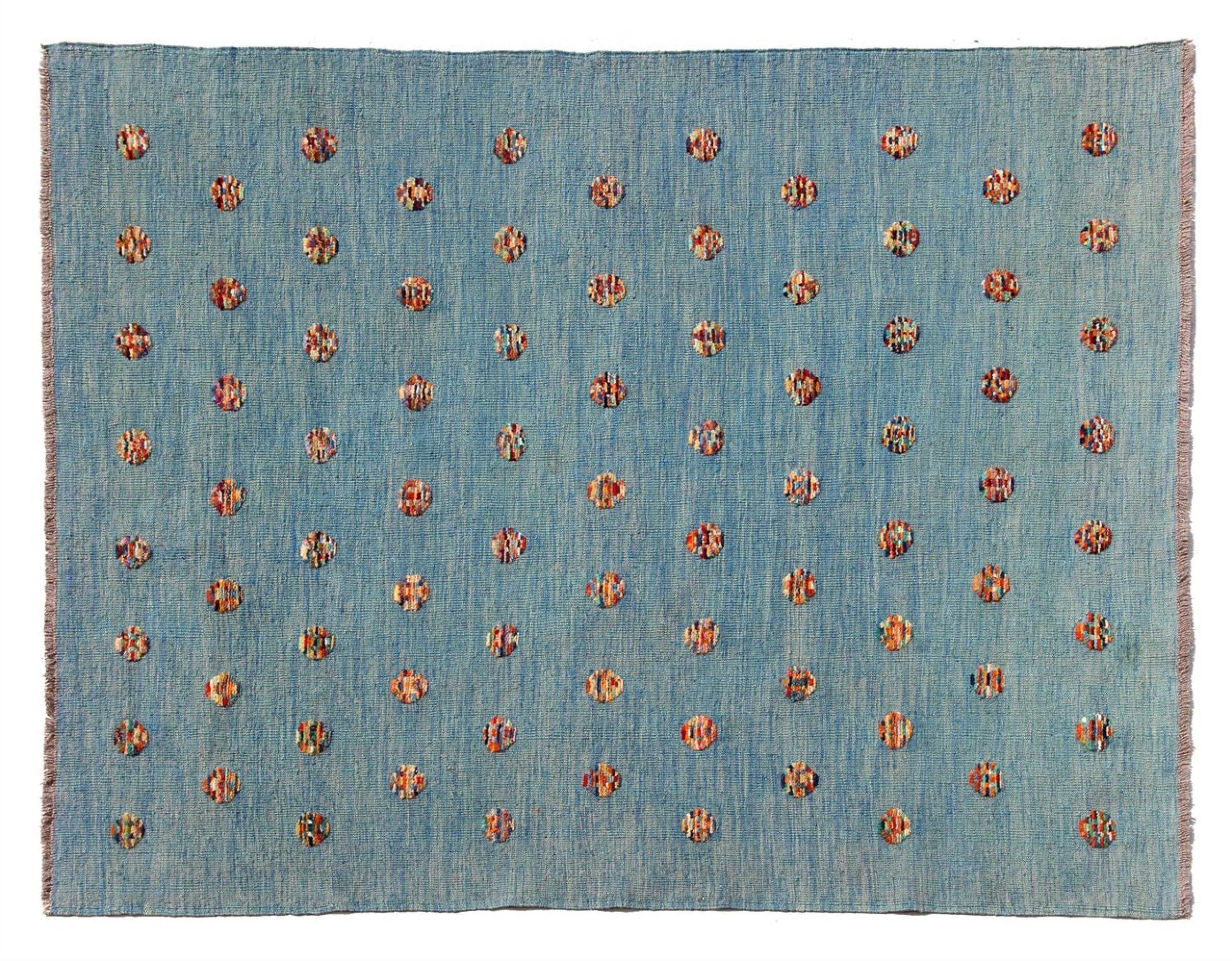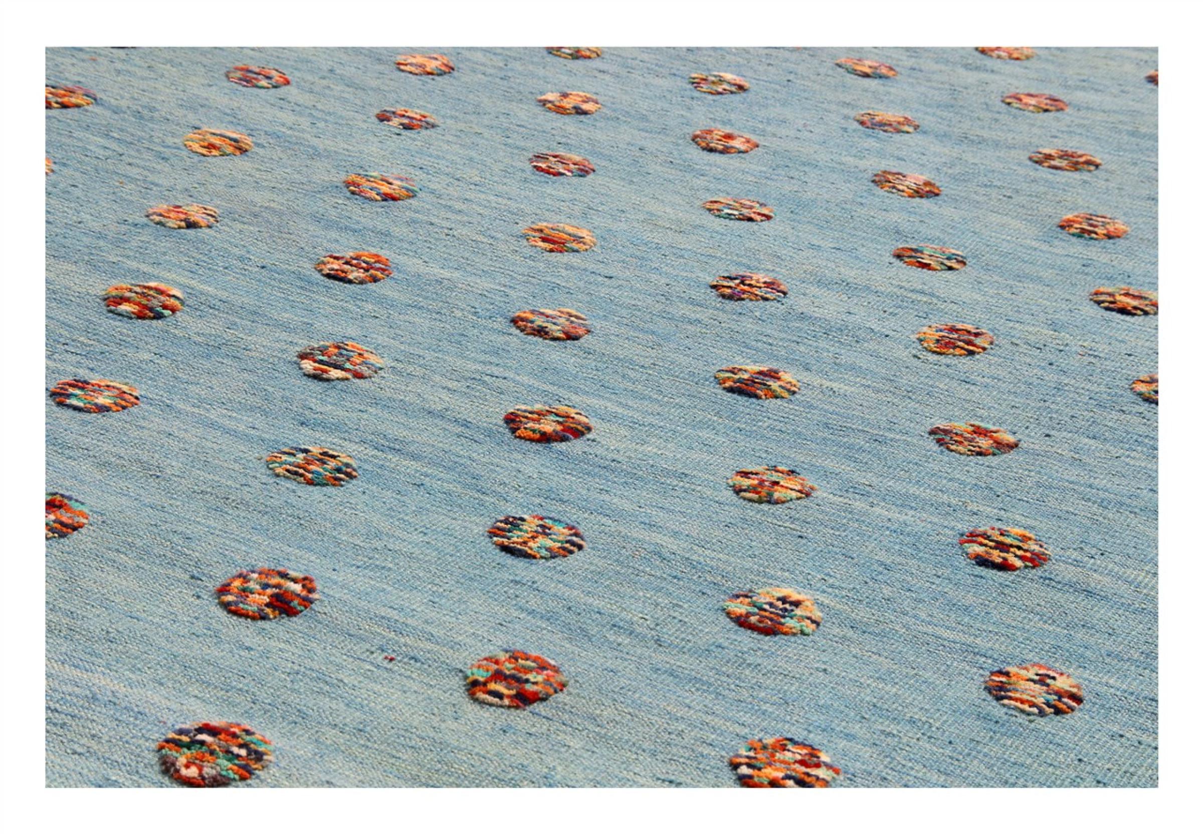 Esta alfombra fue hecha a mano en un telar como un tejido plano. Tejido plano es el término utilizado para describir las alfombras que no tienen pelo. Como el nombre promete, estas alfombras están tejidas y no anudadas. Esto resulta en una alfombra plana con una superficie estructurada. Los tejidos planos no son tan suaves y normalmente más delgados que las alfombras anudadas. Al mismo tiempo, su fabricación es mucho menos compleja y por lo general se pueden disponer por ambos lados (frontal y posterior). Sus patrones suelen ser geométricos, lo cual está determinado por el tejido.