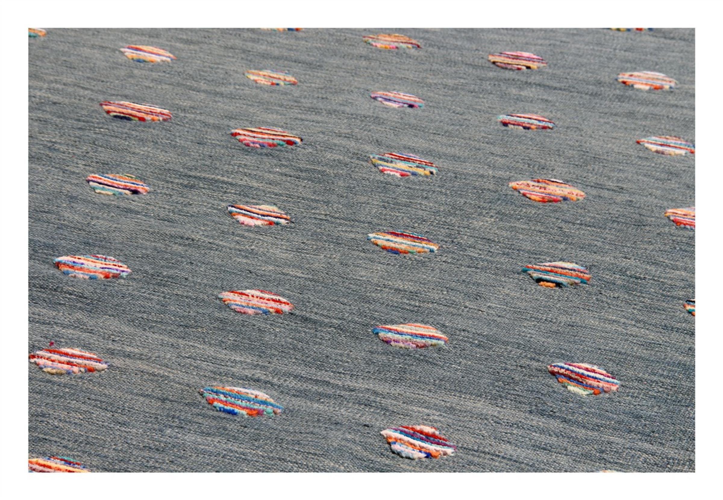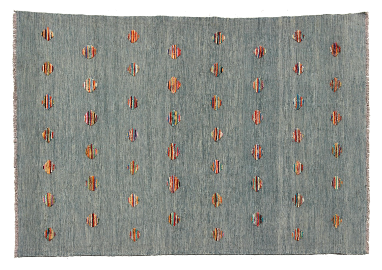 Esta alfombra fue hecha a mano en un telar como un tejido plano. Tejido plano es el término utilizado para describir las alfombras que no tienen pelo. Como el nombre promete, estas alfombras están tejidas y no anudadas. Esto resulta en una alfombra plana con una superficie estructurada. Los tejidos planos no son tan suaves y normalmente más delgados que las alfombras anudadas. Al mismo tiempo, su fabricación es mucho menos compleja y por lo general se pueden disponer por ambos lados (frontal y posterior). Sus patrones suelen ser geométricos, lo cual está determinado por el tejido.