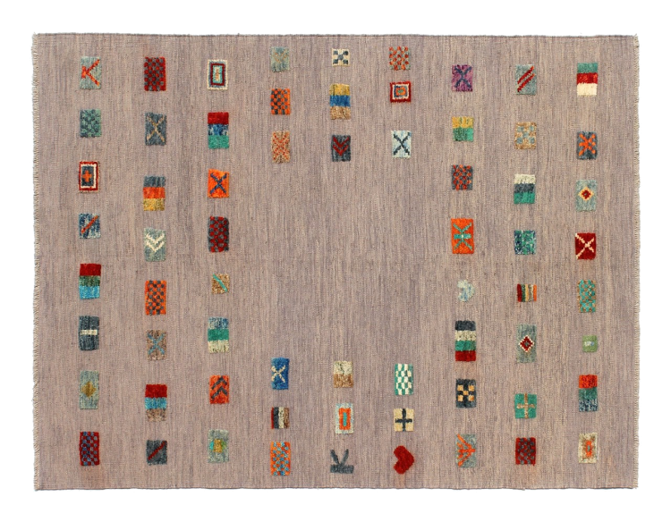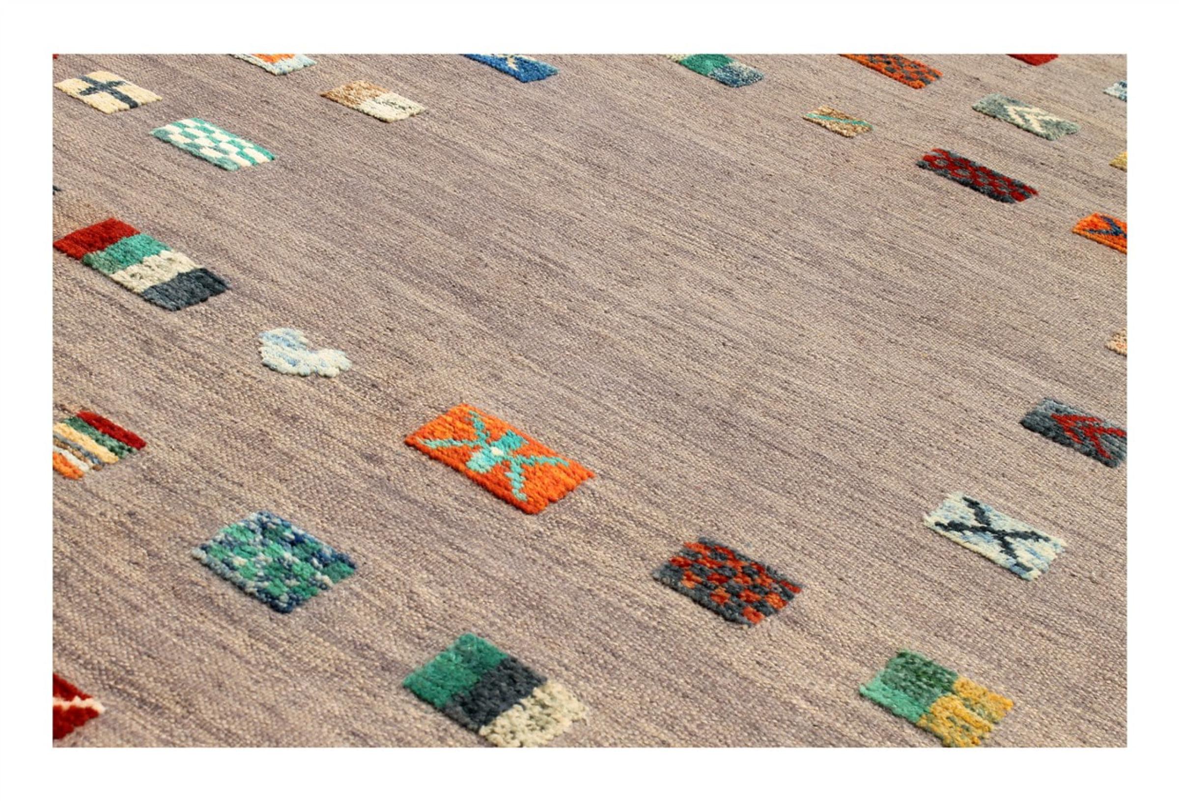 Esta alfombra fue hecha a mano en un telar como un tejido plano. Tejido plano es el término utilizado para describir las alfombras que no tienen pelo. Como el nombre promete, estas alfombras están tejidas y no anudadas. Esto resulta en una alfombra plana con una superficie estructurada. Los tejidos planos no son tan suaves y normalmente más delgados que las alfombras anudadas. Al mismo tiempo, su fabricación es mucho menos compleja y por lo general se pueden disponer por ambos lados (frontal y posterior). Sus patrones suelen ser geométricos, lo cual está determinado por el tejido.