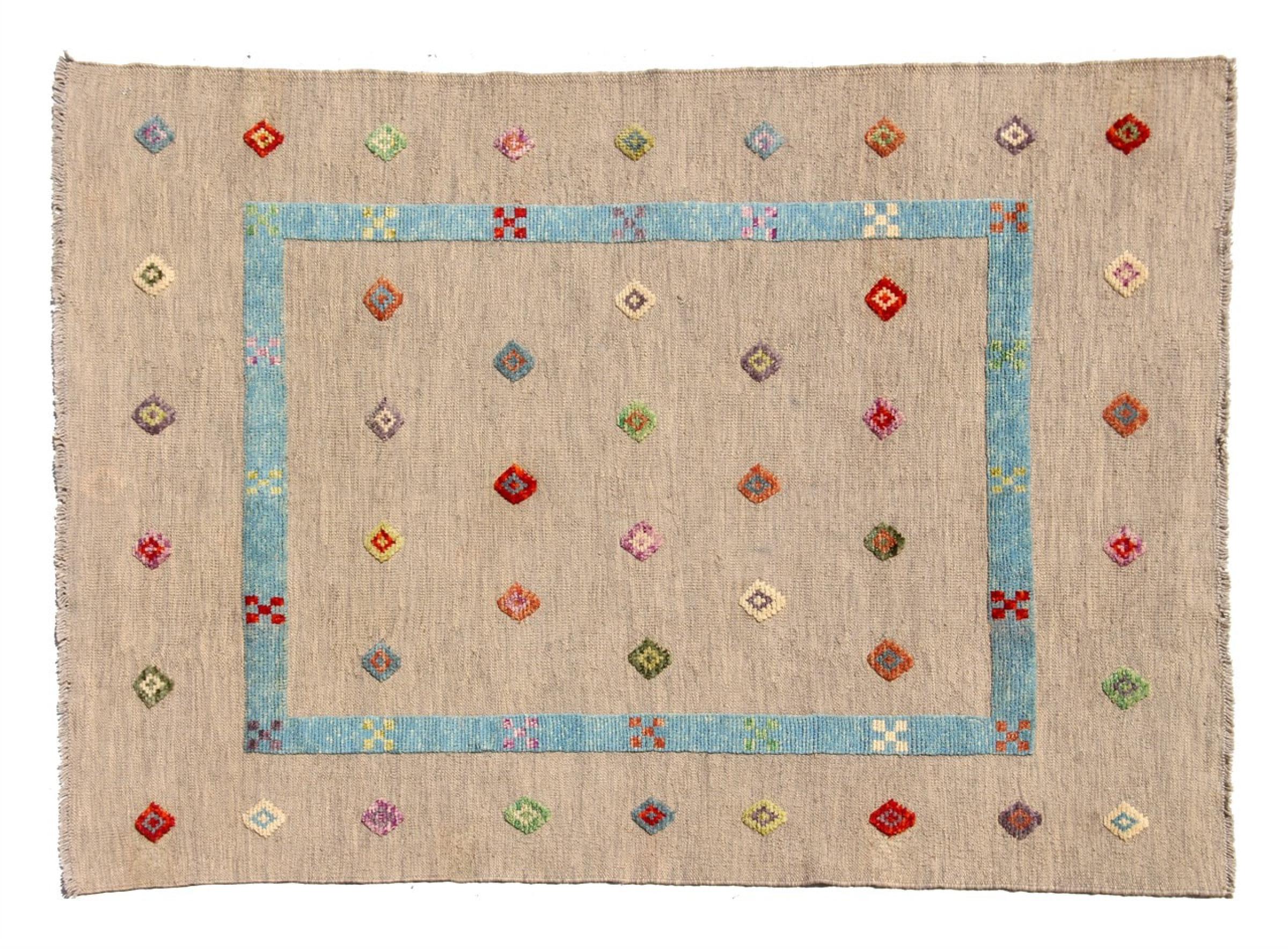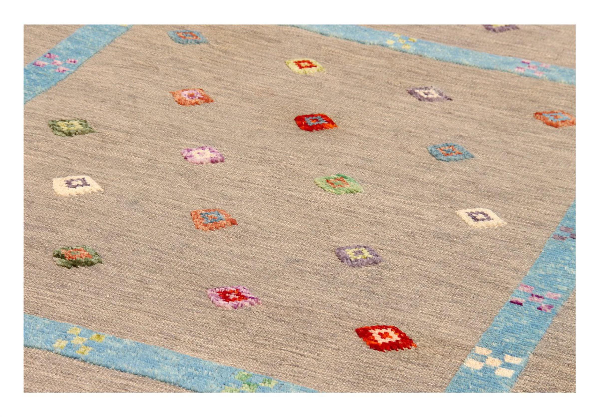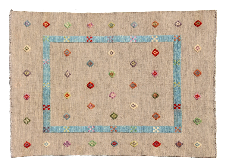Esta alfombra fue hecha a mano en un telar como un tejido plano. Tejido plano es el término utilizado para describir las alfombras que no tienen pelo. Como el nombre promete, estas alfombras están tejidas y no anudadas. Esto resulta en una alfombra plana con una superficie estructurada. Los tejidos planos no son tan suaves y normalmente más delgados que las alfombras anudadas. Al mismo tiempo, su fabricación es mucho menos compleja y por lo general se pueden disponer por ambos lados (frontal y posterior). Sus patrones suelen ser geométricos, lo cual está determinado por el tejido.