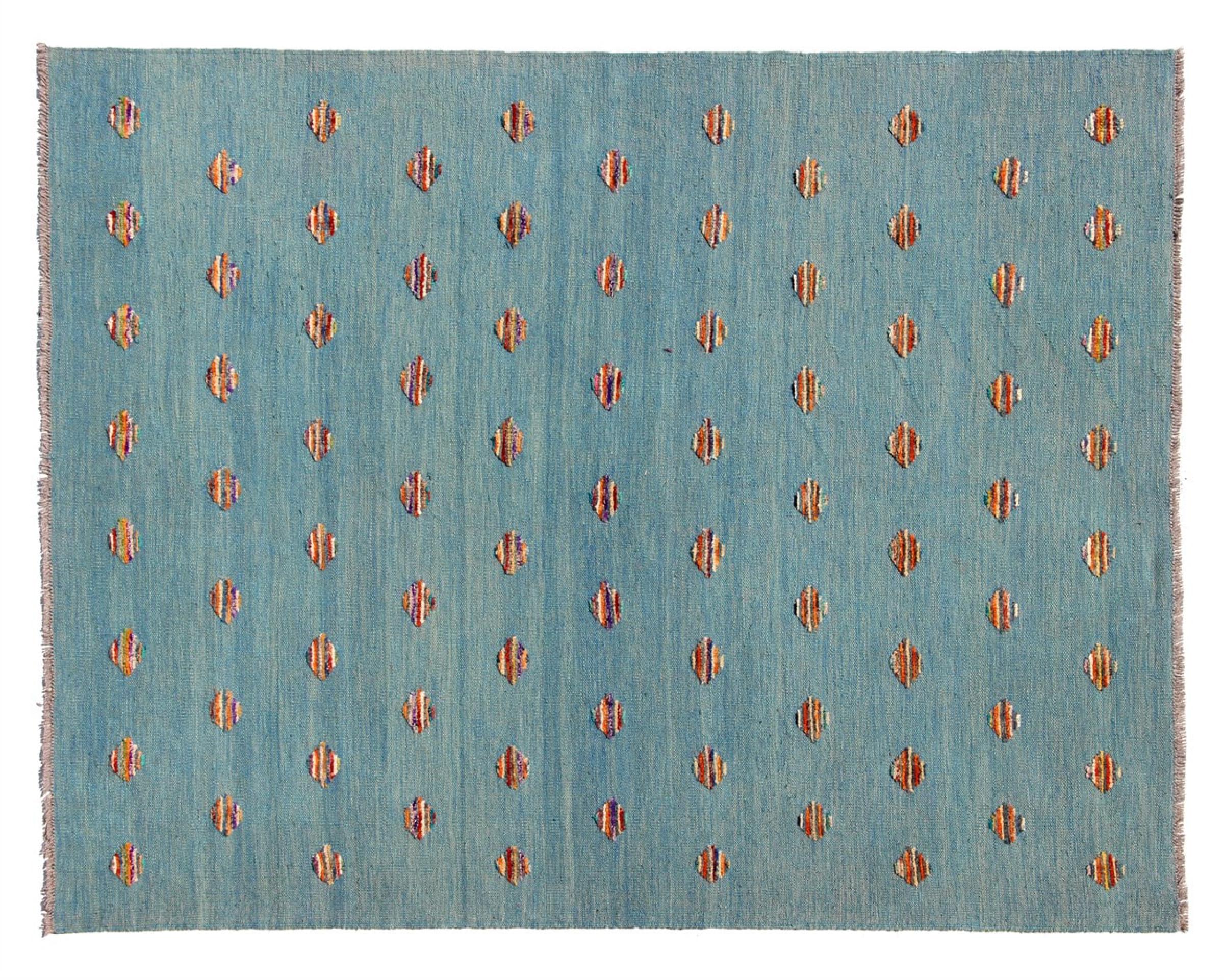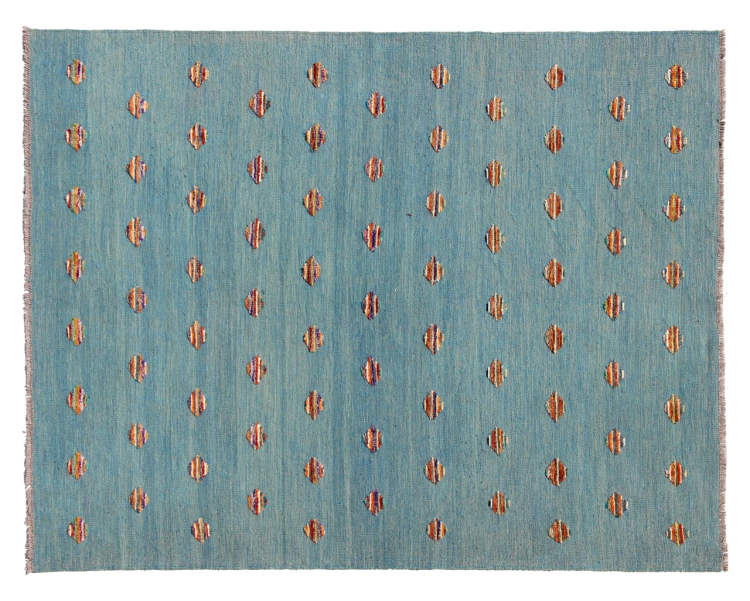 Esta alfombra fue hecha a mano en un telar como un tejido plano. Tejido plano es el término utilizado para describir las alfombras que no tienen pelo. Como el nombre promete, estas alfombras están tejidas y no anudadas. Esto resulta en una alfombra plana con una superficie estructurada. Los tejidos planos no son tan suaves y normalmente más delgados que las alfombras anudadas. Al mismo tiempo, su fabricación es mucho menos compleja y por lo general se pueden disponer por ambos lados (frontal y posterior). Sus patrones suelen ser geométricos, lo cual está determinado por el tejido.
