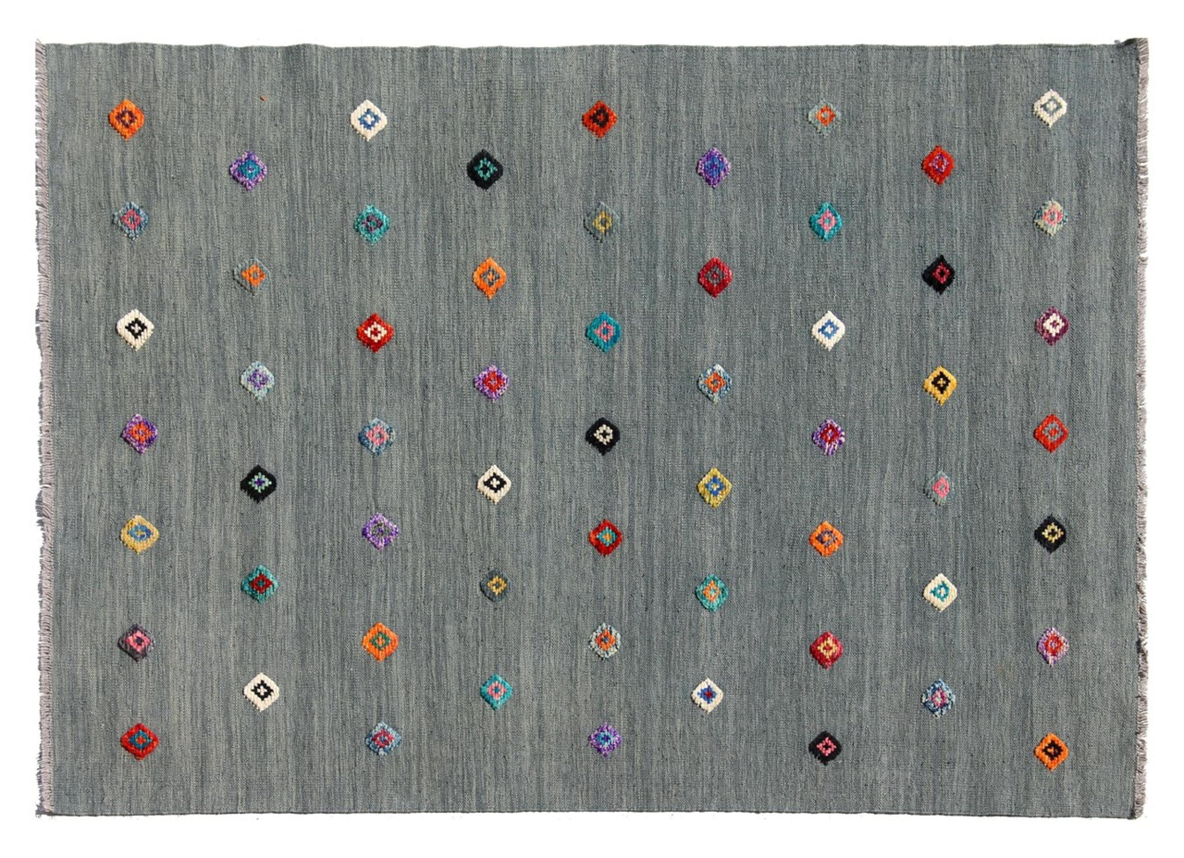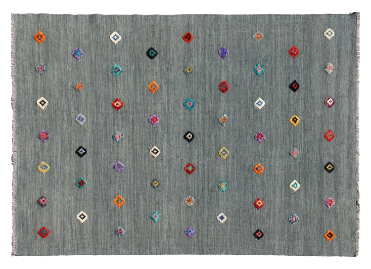 Esta alfombra fue hecha a mano en un telar como un tejido plano. Tejido plano es el término utilizado para describir las alfombras que no tienen pelo. Como el nombre promete, estas alfombras están tejidas y no anudadas. Esto resulta en una alfombra plana con una superficie estructurada. Los tejidos planos no son tan suaves y normalmente más delgados que las alfombras anudadas. Al mismo tiempo, su fabricación es mucho menos compleja y por lo general se pueden disponer por ambos lados (frontal y posterior). Sus patrones suelen ser geométricos, lo cual está determinado por el tejido.