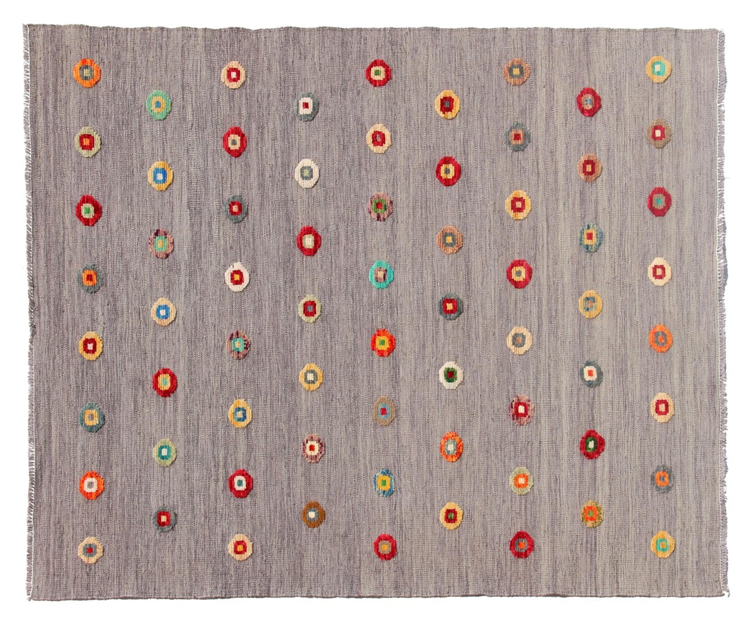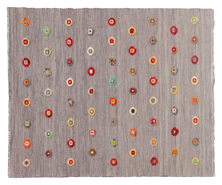 Esta alfombra fue hecha a mano en un telar como un tejido plano. Tejido plano es el término utilizado para describir las alfombras que no tienen pelo. Como el nombre promete, estas alfombras están tejidas y no anudadas. Esto resulta en una alfombra plana con una superficie estructurada. Los tejidos planos no son tan suaves y normalmente más delgados que las alfombras anudadas. Al mismo tiempo, su fabricación es mucho menos compleja y por lo general se pueden disponer por ambos lados (frontal y posterior). Sus patrones suelen ser geométricos, lo cual está determinado por el tejido.