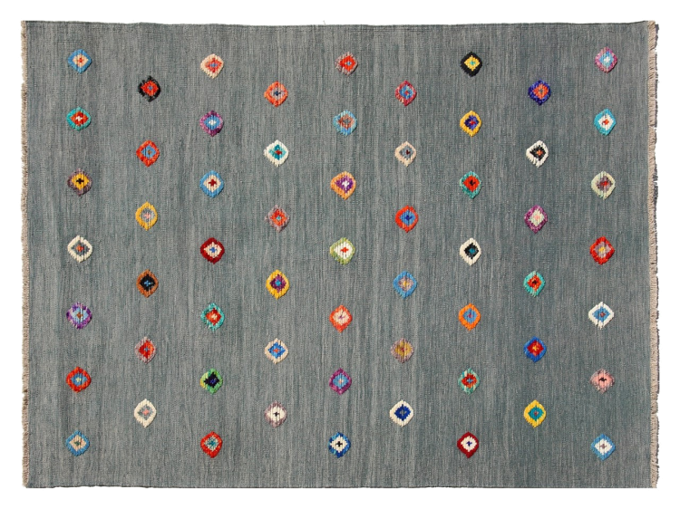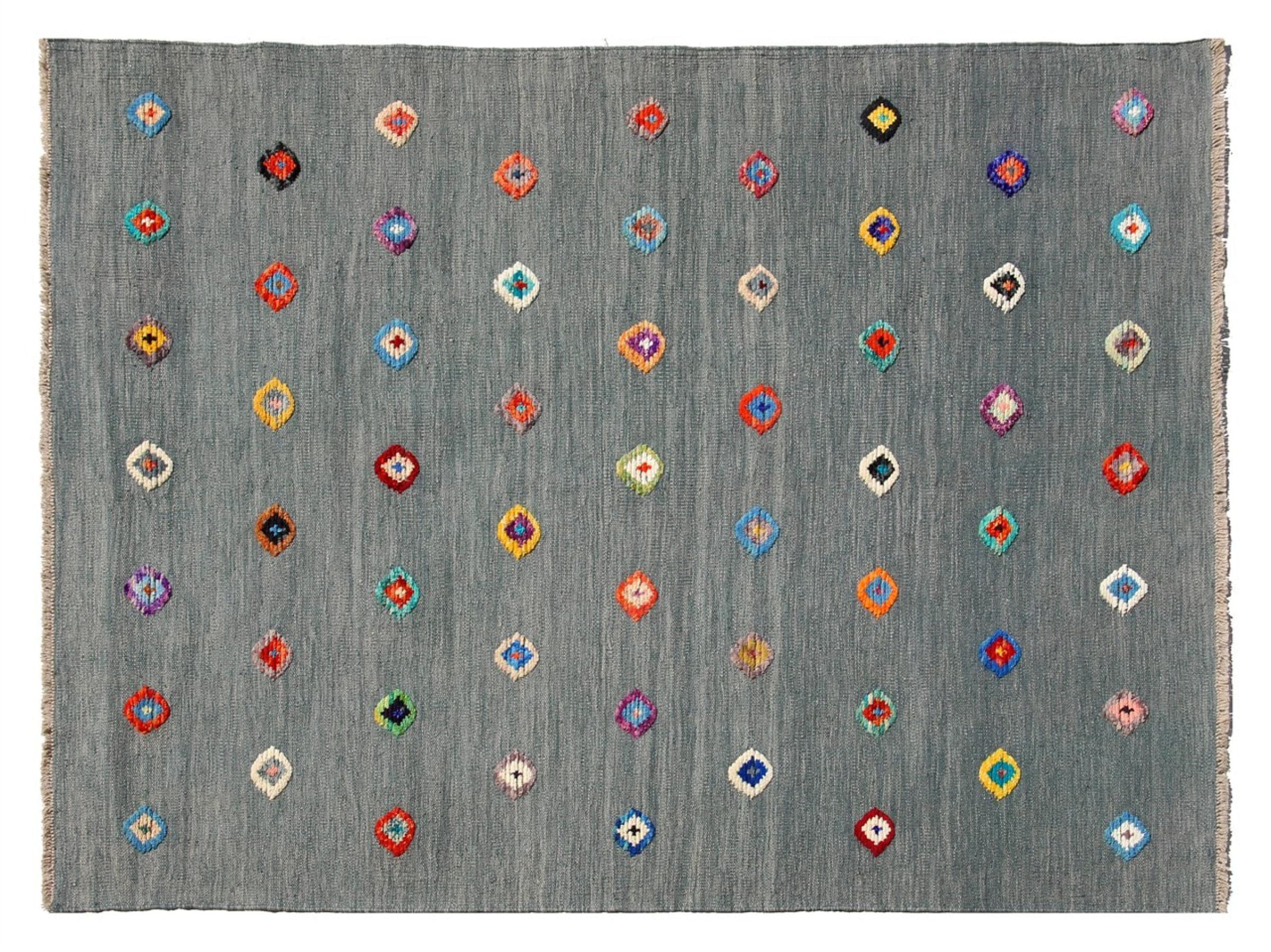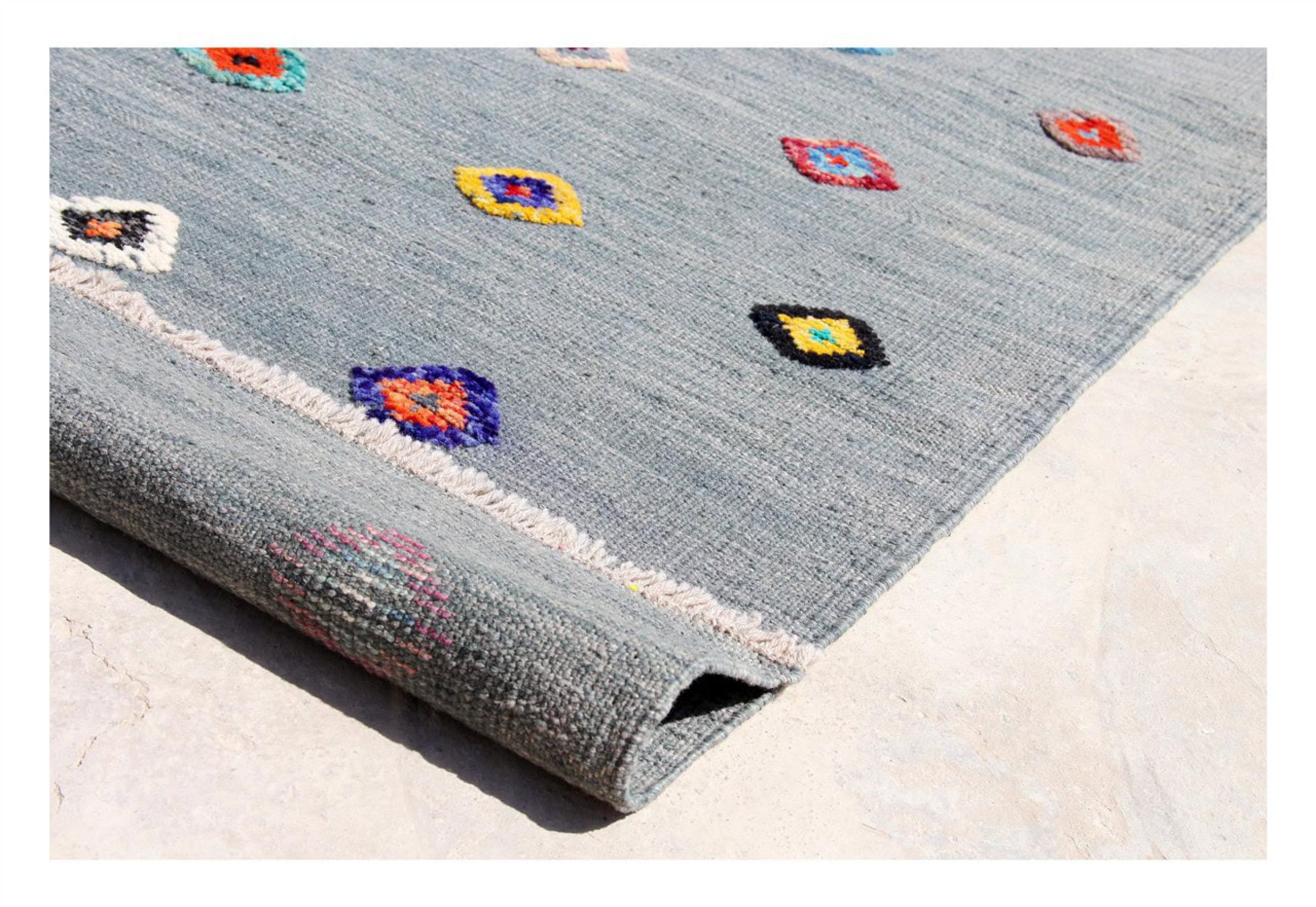 Esta alfombra fue hecha a mano en un telar como un tejido plano. Tejido plano es el término utilizado para describir las alfombras que no tienen pelo. Como el nombre promete, estas alfombras están tejidas y no anudadas. Esto resulta en una alfombra plana con una superficie estructurada. Los tejidos planos no son tan suaves y normalmente más delgados que las alfombras anudadas. Al mismo tiempo, su fabricación es mucho menos compleja y por lo general se pueden disponer por ambos lados (frontal y posterior). Sus patrones suelen ser geométricos, lo cual está determinado por el tejido.