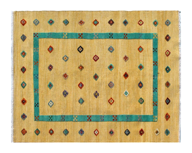 Esta alfombra fue hecha a mano en un telar como un tejido plano. Tejido plano es el término utilizado para describir las alfombras que no tienen pelo. Como el nombre promete, estas alfombras están tejidas y no anudadas. Esto resulta en una alfombra plana con una superficie estructurada. Los tejidos planos no son tan suaves y normalmente más delgados que las alfombras anudadas. Al mismo tiempo, su fabricación es mucho menos compleja y por lo general se pueden disponer por ambos lados (frontal y posterior). Sus patrones suelen ser geométricos, lo cual está determinado por el tejido.