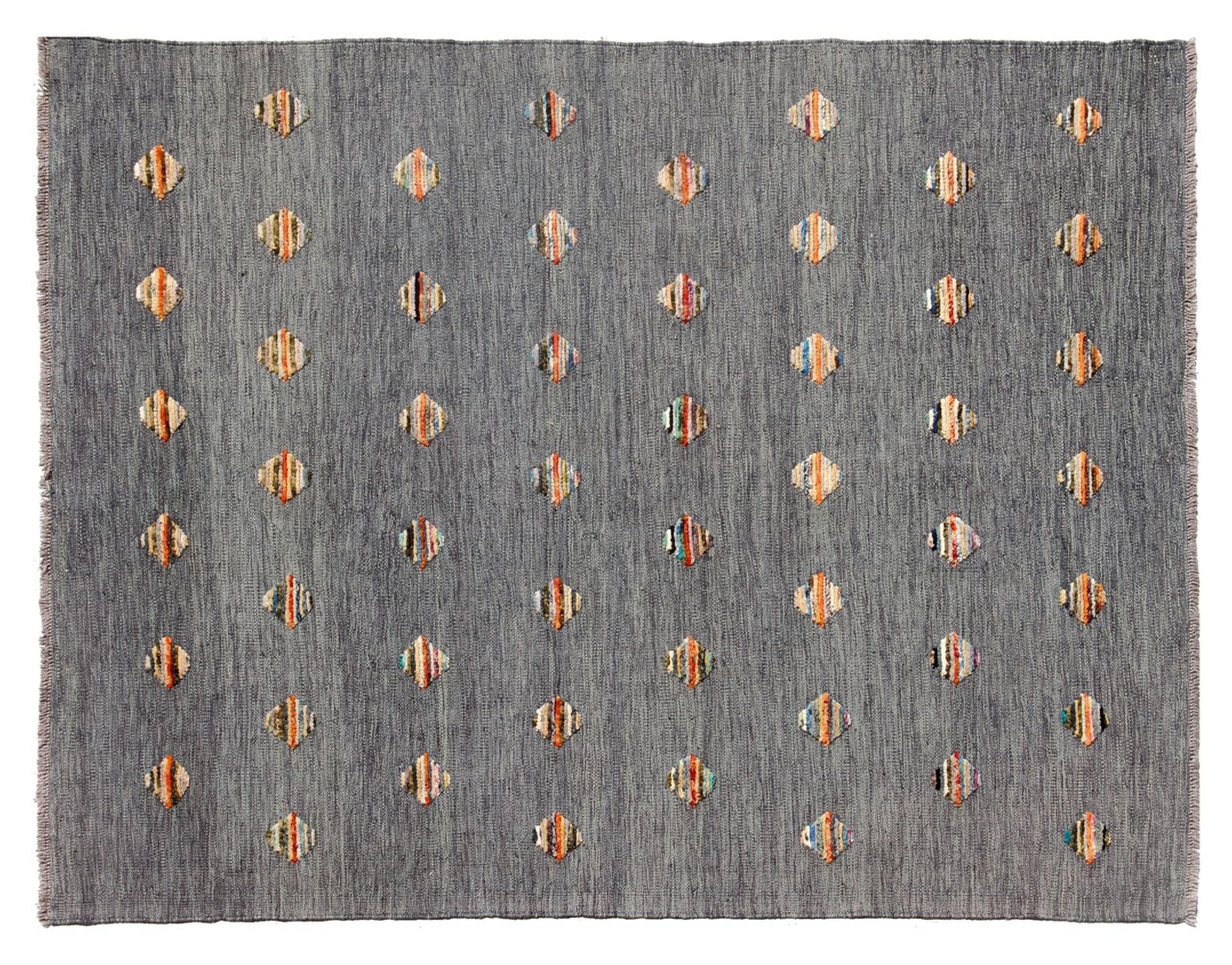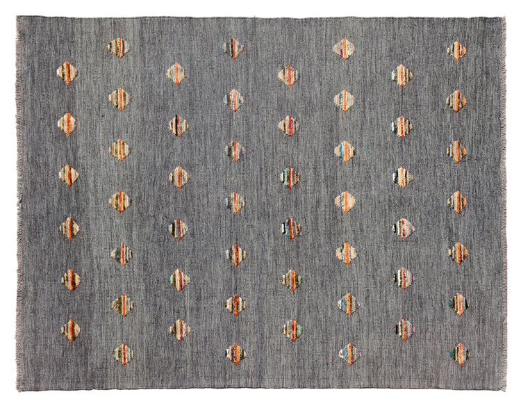 Esta alfombra fue hecha a mano en un telar como un tejido plano. Tejido plano es el término utilizado para describir las alfombras que no tienen pelo. Como el nombre promete, estas alfombras están tejidas y no anudadas. Esto resulta en una alfombra plana con una superficie estructurada. Los tejidos planos no son tan suaves y normalmente más delgados que las alfombras anudadas. Al mismo tiempo, su fabricación es mucho menos compleja y por lo general se pueden disponer por ambos lados (frontal y posterior). Sus patrones suelen ser geométricos, lo cual está determinado por el tejido.