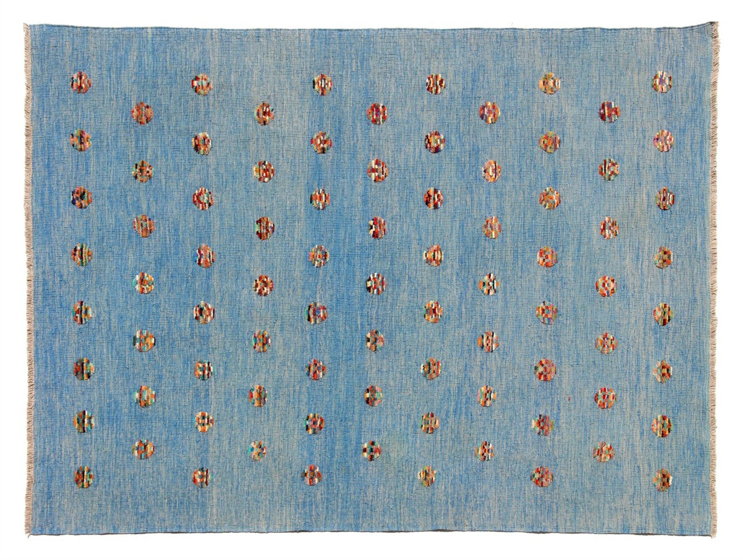 Esta alfombra fue hecha a mano en un telar como un tejido plano. Tejido plano es el término utilizado para describir las alfombras que no tienen pelo. Como el nombre promete, estas alfombras están tejidas y no anudadas. Esto resulta en una alfombra plana con una superficie estructurada. Los tejidos planos no son tan suaves y normalmente más delgados que las alfombras anudadas. Al mismo tiempo, su fabricación es mucho menos compleja y por lo general se pueden disponer por ambos lados (frontal y posterior). Sus patrones suelen ser geométricos, lo cual está determinado por el tejido.