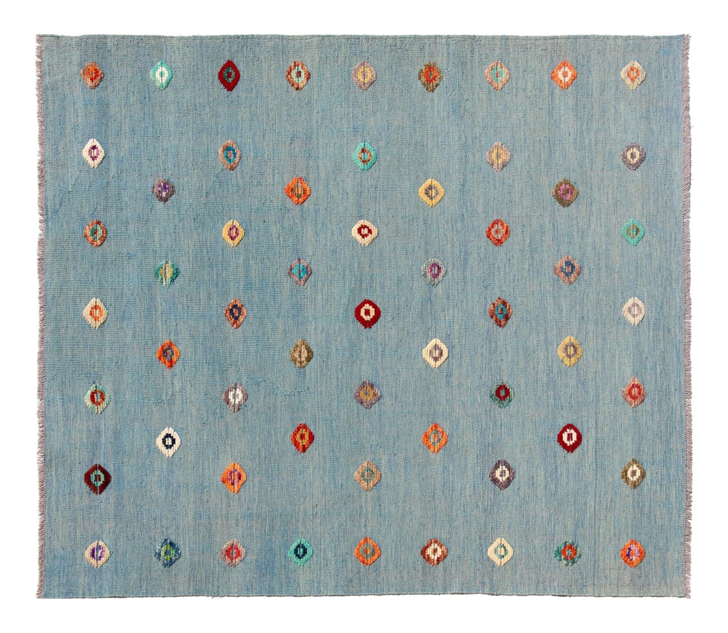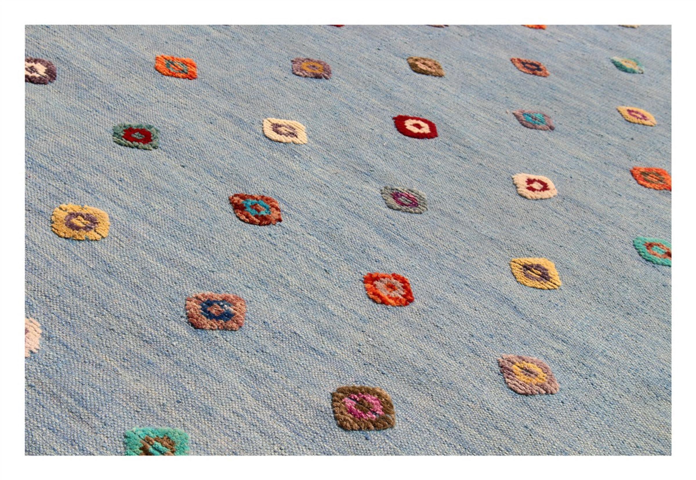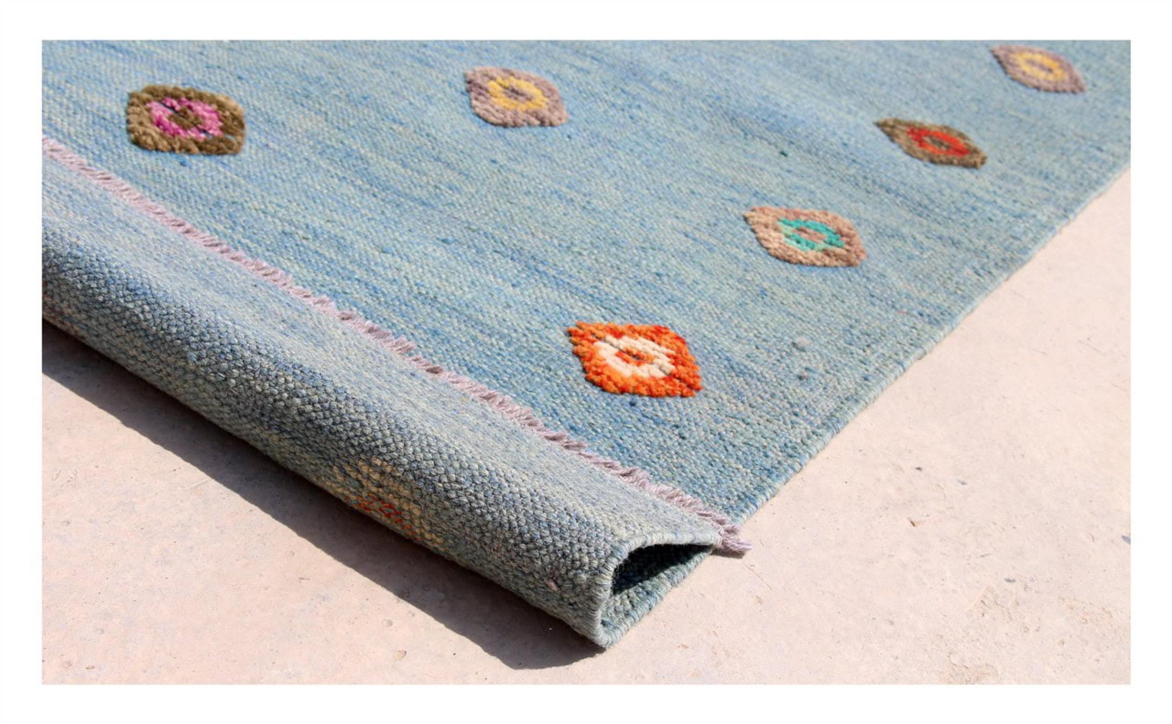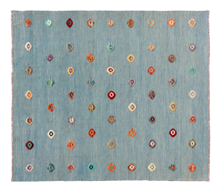 Esta alfombra fue hecha a mano en un telar como un tejido plano. Tejido plano es el término utilizado para describir las alfombras que no tienen pelo. Como el nombre promete, estas alfombras están tejidas y no anudadas. Esto resulta en una alfombra plana con una superficie estructurada. Los tejidos planos no son tan suaves y normalmente más delgados que las alfombras anudadas. Al mismo tiempo, su fabricación es mucho menos compleja y por lo general se pueden disponer por ambos lados (frontal y posterior). Sus patrones suelen ser geométricos, lo cual está determinado por el tejido.