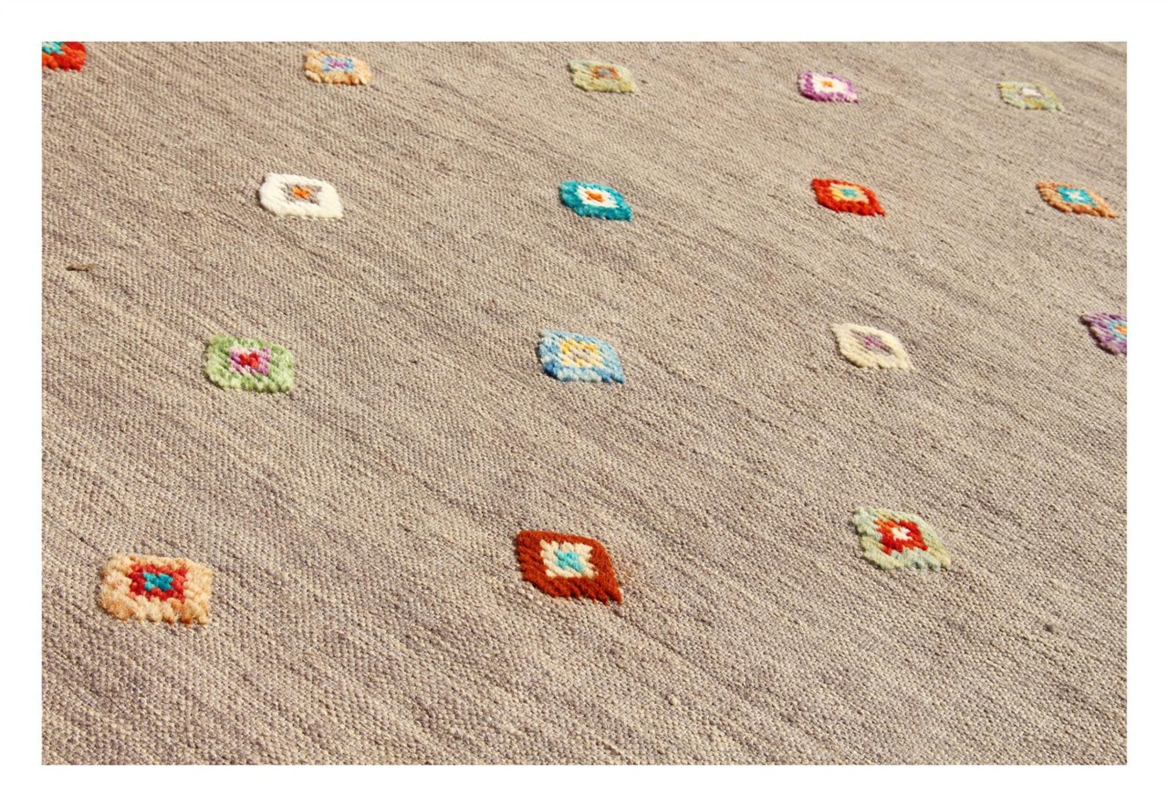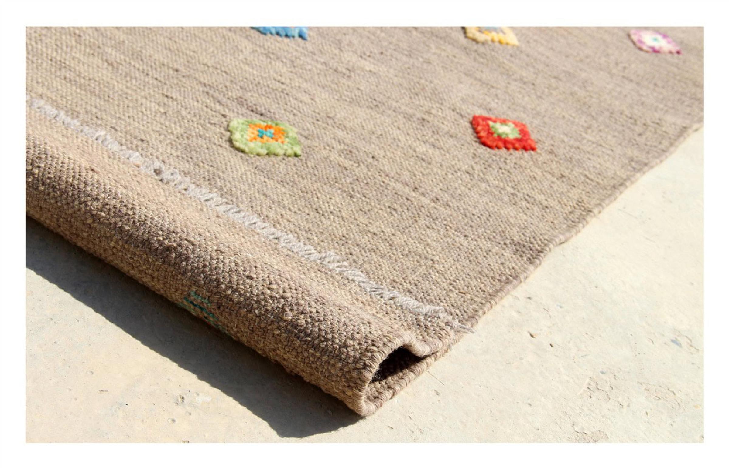 Esta alfombra fue hecha a mano en un telar como un tejido plano. Tejido plano es el término utilizado para describir las alfombras que no tienen pelo. Como el nombre promete, estas alfombras están tejidas y no anudadas. Esto resulta en una alfombra plana con una superficie estructurada. Los tejidos planos no son tan suaves y normalmente más delgados que las alfombras anudadas. Al mismo tiempo, su fabricación es mucho menos compleja y por lo general se pueden disponer por ambos lados (frontal y posterior). Sus patrones suelen ser geométricos, lo cual está determinado por el tejido.