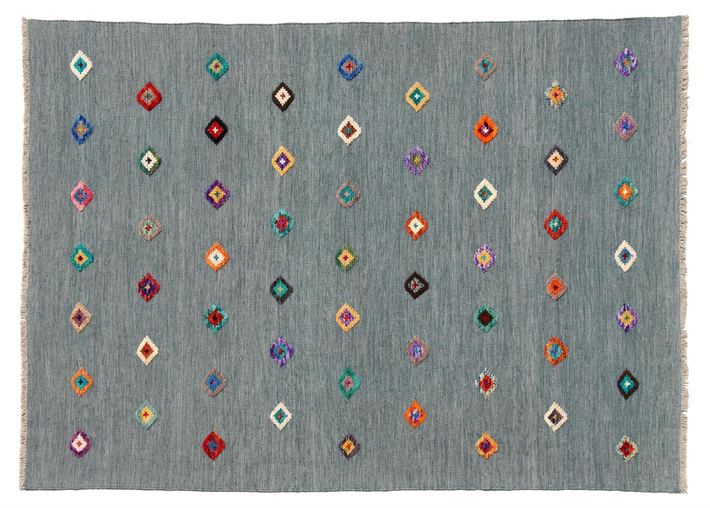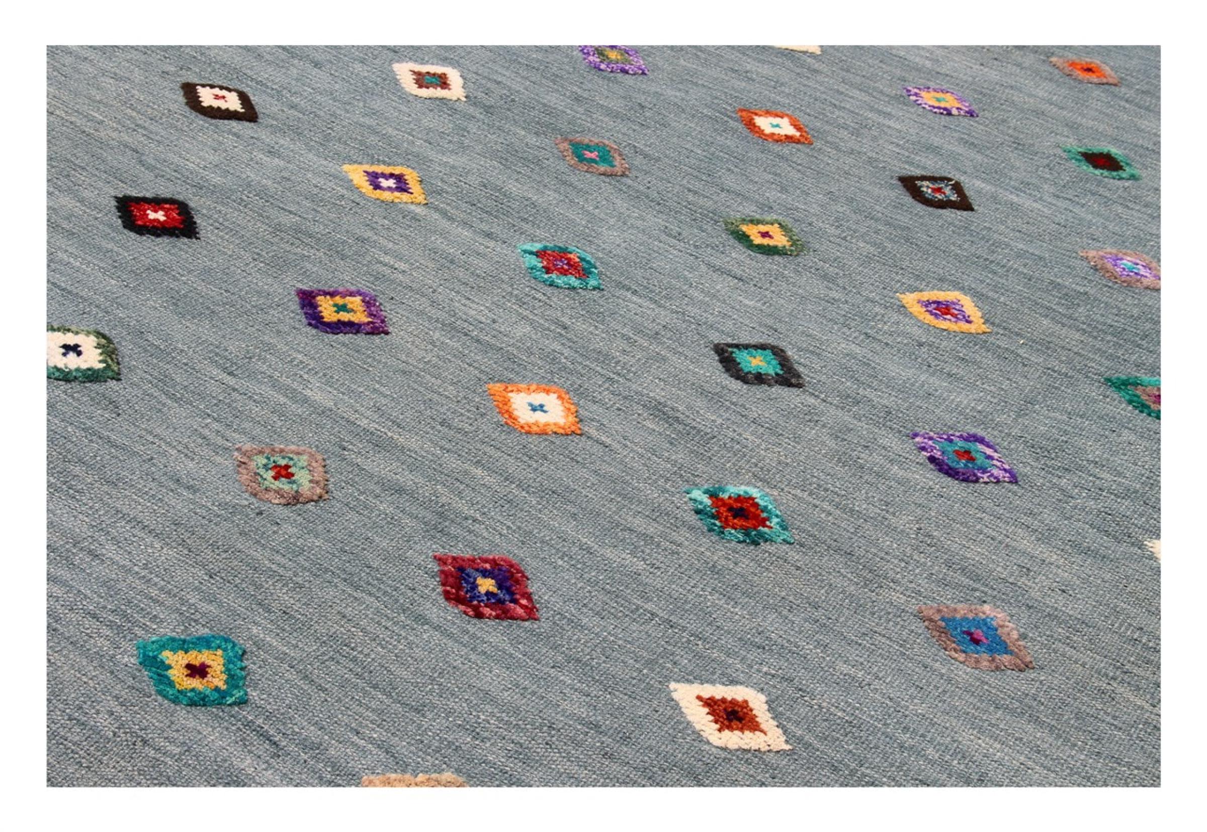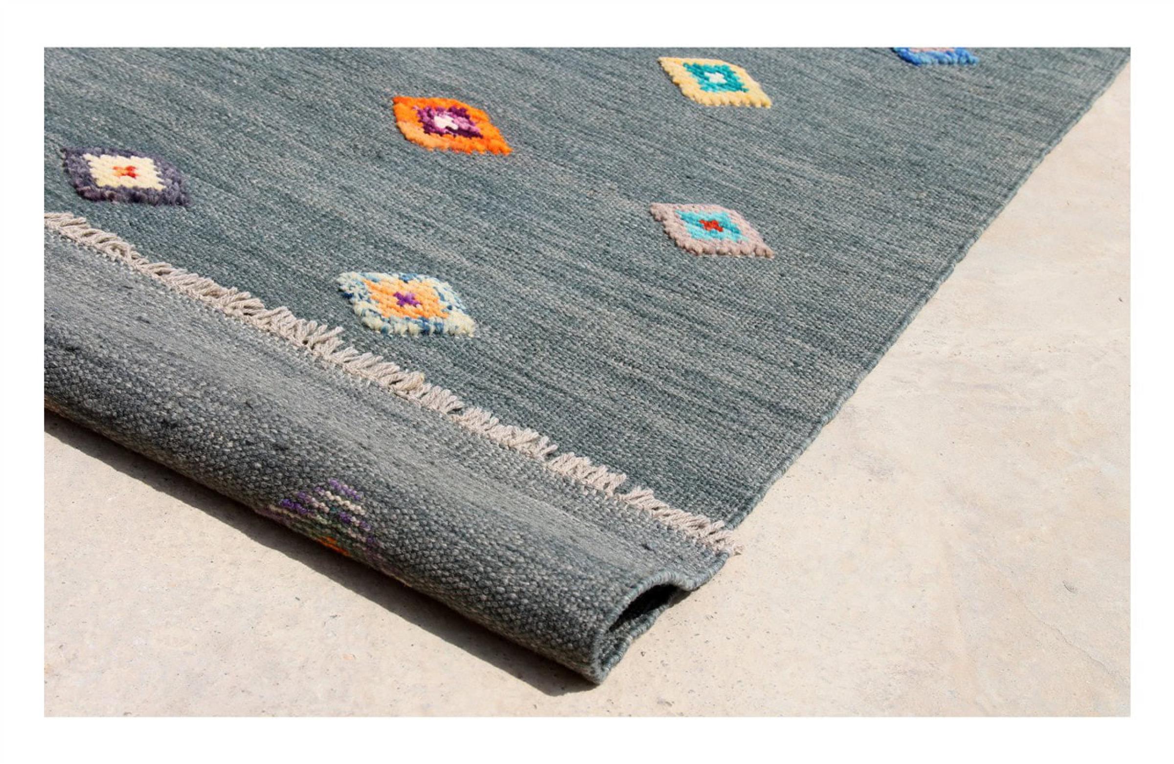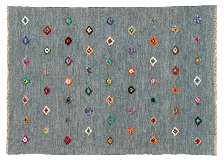 Esta alfombra fue hecha a mano en un telar como un tejido plano. Tejido plano es el término utilizado para describir las alfombras que no tienen pelo. Como el nombre promete, estas alfombras están tejidas y no anudadas. Esto resulta en una alfombra plana con una superficie estructurada. Los tejidos planos no son tan suaves y normalmente más delgados que las alfombras anudadas. Al mismo tiempo, su fabricación es mucho menos compleja y por lo general se pueden disponer por ambos lados (frontal y posterior). Sus patrones suelen ser geométricos, lo cual está determinado por el tejido.