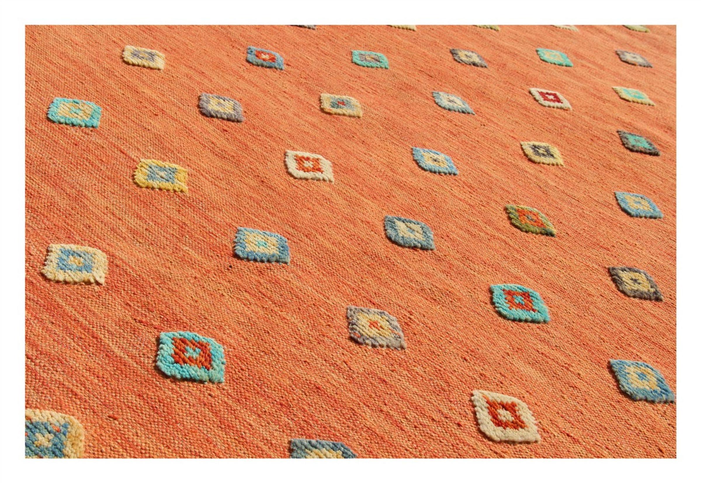 Esta alfombra fue hecha a mano en un telar como un tejido plano. Tejido plano es el término utilizado para describir las alfombras que no tienen pelo. Como el nombre promete, estas alfombras están tejidas y no anudadas. Esto resulta en una alfombra plana con una superficie estructurada. Los tejidos planos no son tan suaves y normalmente más delgados que las alfombras anudadas. Al mismo tiempo, su fabricación es mucho menos compleja y por lo general se pueden disponer por ambos lados (frontal y posterior). Sus patrones suelen ser geométricos, lo cual está determinado por el tejido.