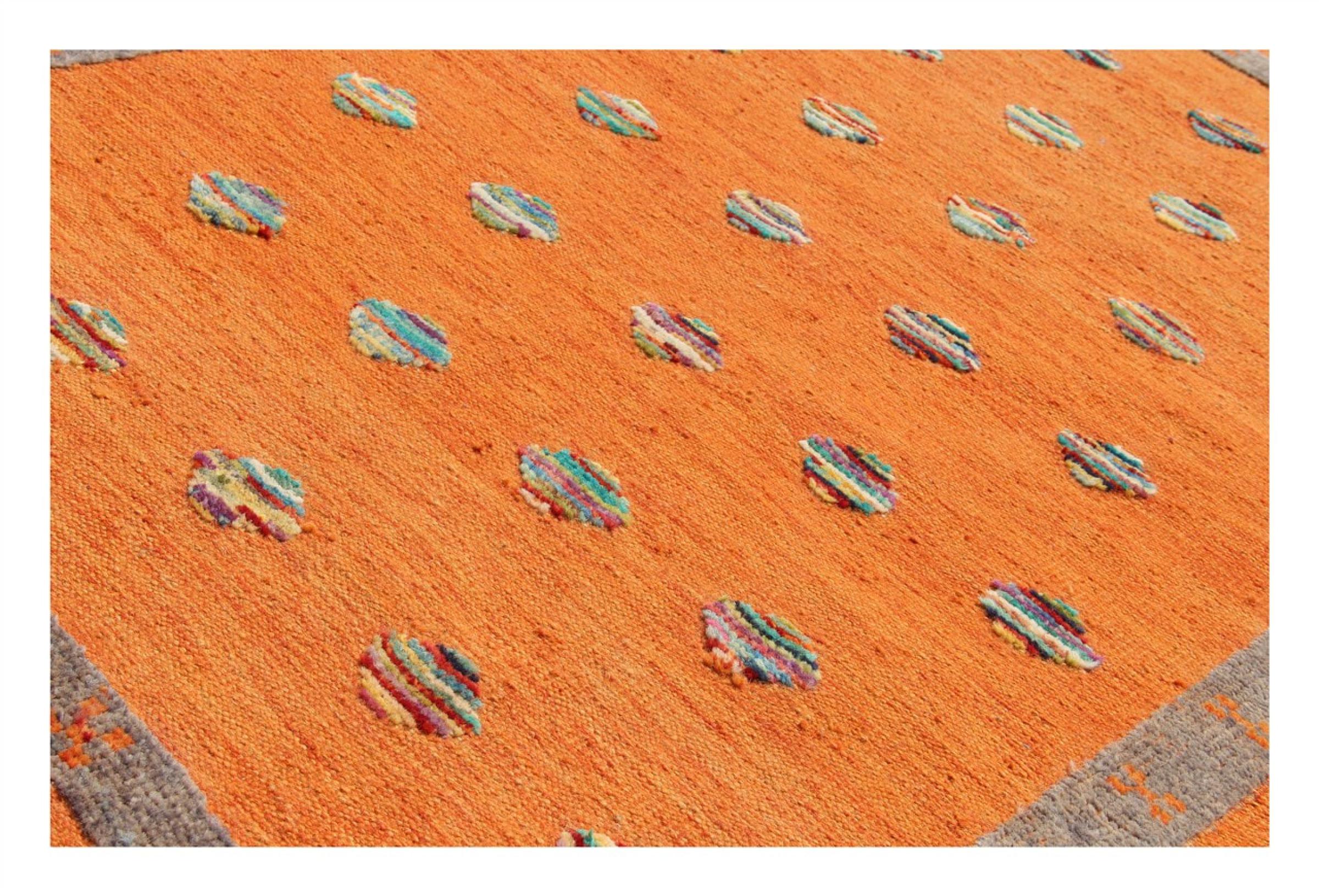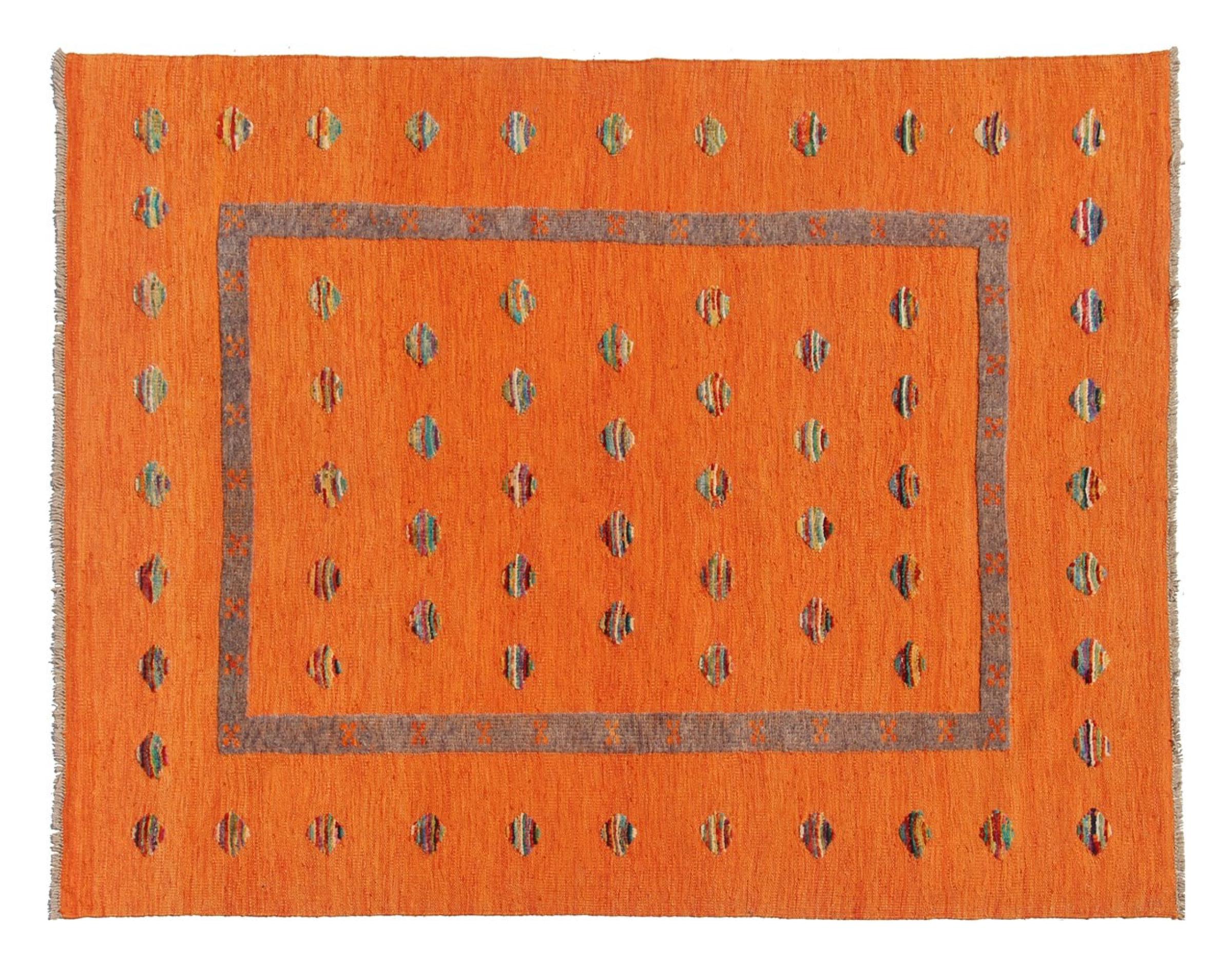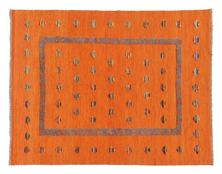 Esta alfombra fue hecha a mano en un telar como un tejido plano. Tejido plano es el término utilizado para describir las alfombras que no tienen pelo. Como el nombre promete, estas alfombras están tejidas y no anudadas. Esto resulta en una alfombra plana con una superficie estructurada. Los tejidos planos no son tan suaves y normalmente más delgados que las alfombras anudadas. Al mismo tiempo, su fabricación es mucho menos compleja y por lo general se pueden disponer por ambos lados (frontal y posterior). Sus patrones suelen ser geométricos, lo cual está determinado por el tejido.
