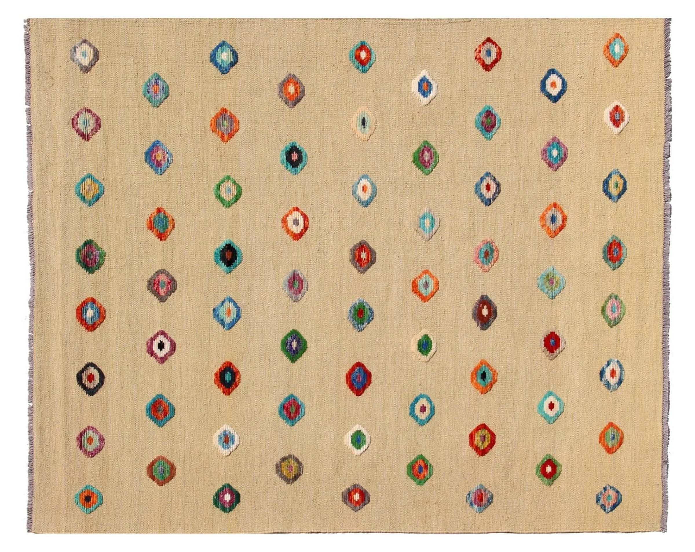 Esta alfombra fue hecha a mano en un telar como un tejido plano. Tejido plano es el término utilizado para describir las alfombras que no tienen pelo. Como el nombre promete, estas alfombras están tejidas y no anudadas. Esto resulta en una alfombra plana con una superficie estructurada. Los tejidos planos no son tan suaves y normalmente más delgados que las alfombras anudadas. Al mismo tiempo, su fabricación es mucho menos compleja y por lo general se pueden disponer por ambos lados (frontal y posterior). Sus patrones suelen ser geométricos, lo cual está determinado por el tejido.