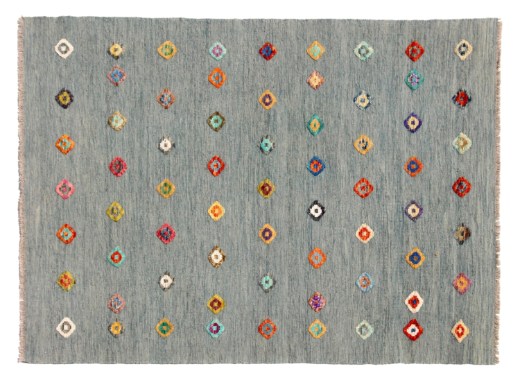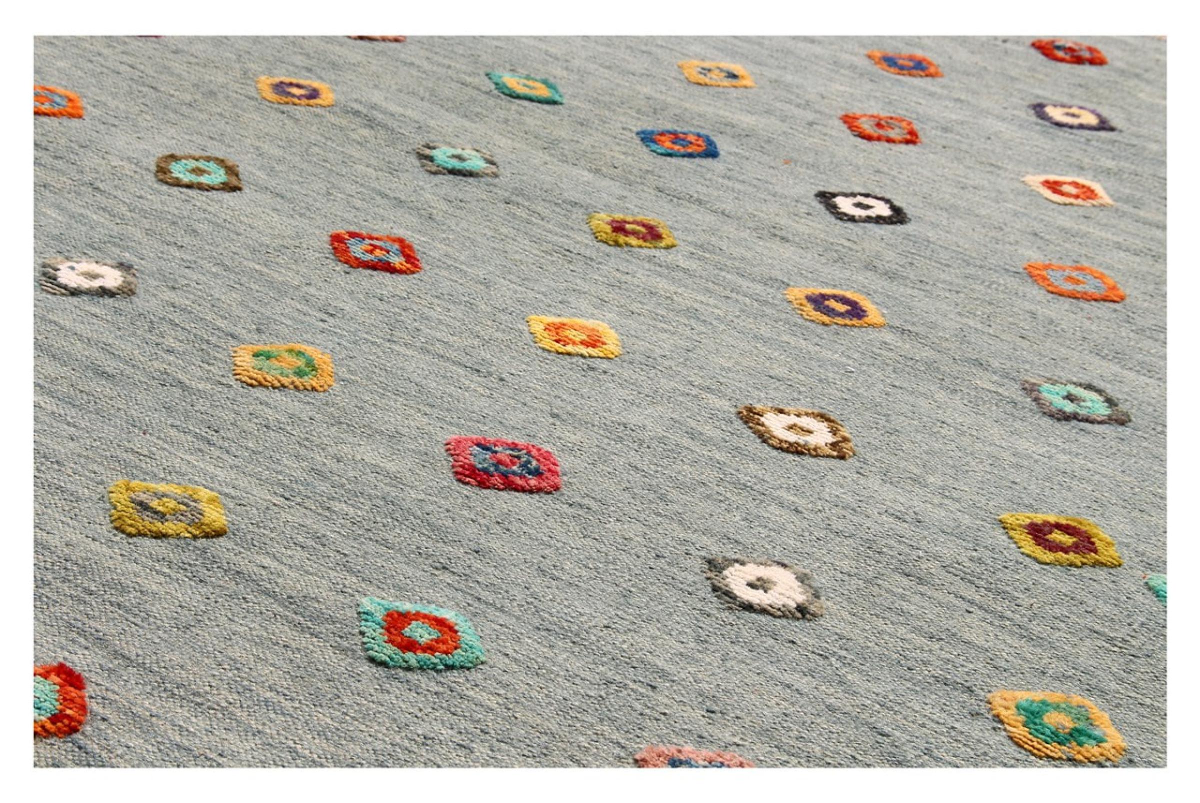 Esta alfombra fue hecha a mano en un telar como un tejido plano. Tejido plano es el término utilizado para describir las alfombras que no tienen pelo. Como el nombre promete, estas alfombras están tejidas y no anudadas. Esto resulta en una alfombra plana con una superficie estructurada. Los tejidos planos no son tan suaves y normalmente más delgados que las alfombras anudadas. Al mismo tiempo, su fabricación es mucho menos compleja y por lo general se pueden disponer por ambos lados (frontal y posterior). Sus patrones suelen ser geométricos, lo cual está determinado por el tejido.