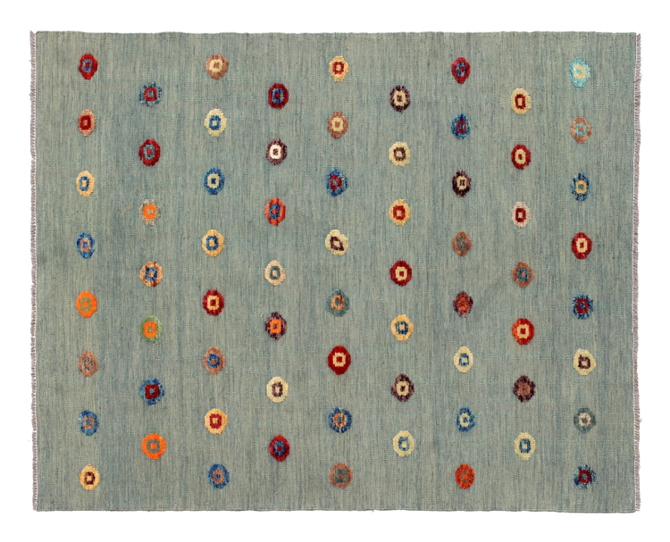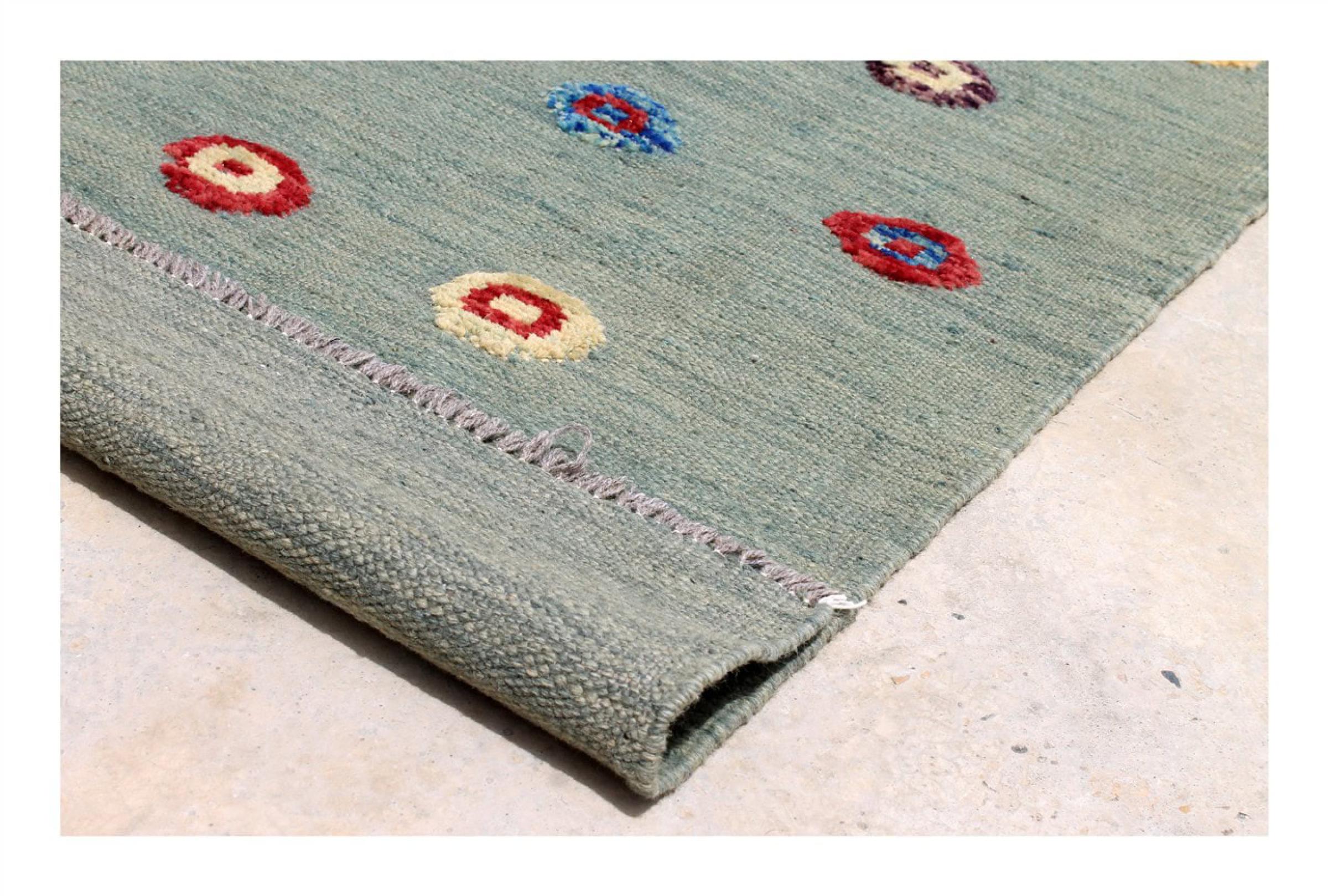 Esta alfombra fue hecha a mano en un telar como un tejido plano. Tejido plano es el término utilizado para describir las alfombras que no tienen pelo. Como el nombre promete, estas alfombras están tejidas y no anudadas. Esto resulta en una alfombra plana con una superficie estructurada. Los tejidos planos no son tan suaves y normalmente más delgados que las alfombras anudadas. Al mismo tiempo, su fabricación es mucho menos compleja y por lo general se pueden disponer por ambos lados (frontal y posterior). Sus patrones suelen ser geométricos, lo cual está determinado por el tejido.