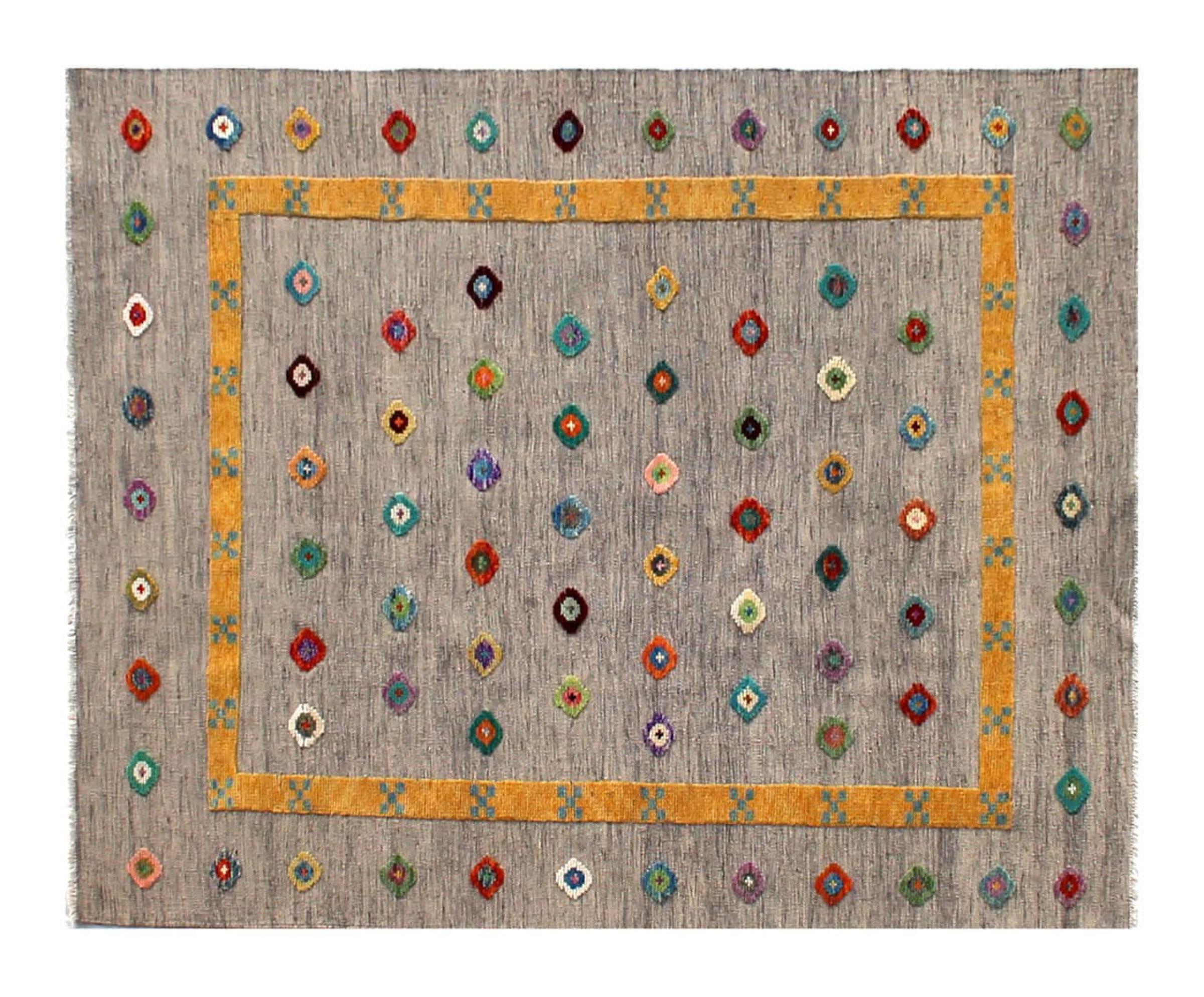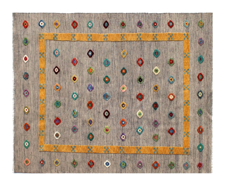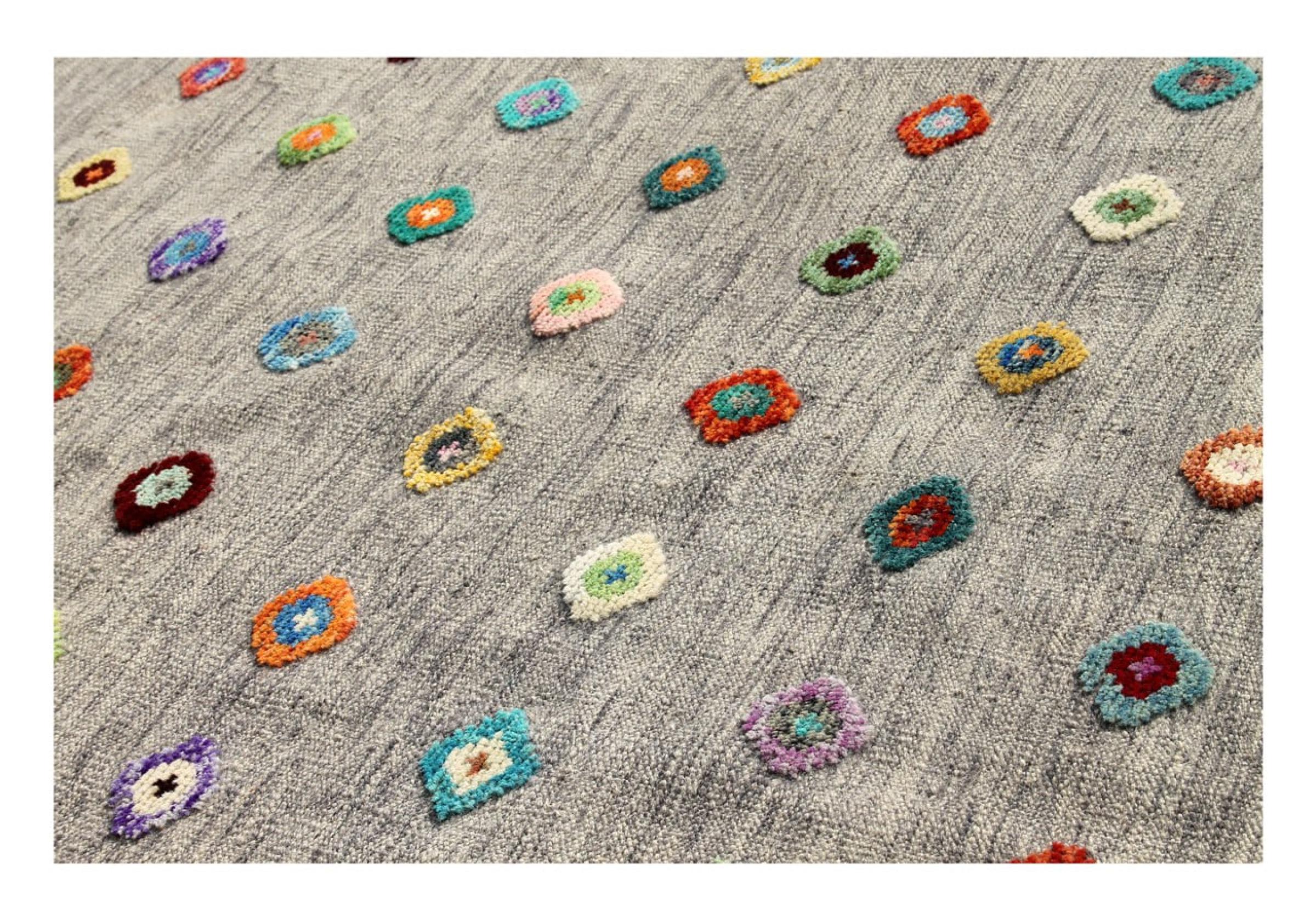 Esta alfombra fue hecha a mano en un telar como un tejido plano. Tejido plano es el término utilizado para describir las alfombras que no tienen pelo. Como el nombre promete, estas alfombras están tejidas y no anudadas. Esto resulta en una alfombra plana con una superficie estructurada. Los tejidos planos no son tan suaves y normalmente más delgados que las alfombras anudadas. Al mismo tiempo, su fabricación es mucho menos compleja y por lo general se pueden disponer por ambos lados (frontal y posterior). Sus patrones suelen ser geométricos, lo cual está determinado por el tejido.