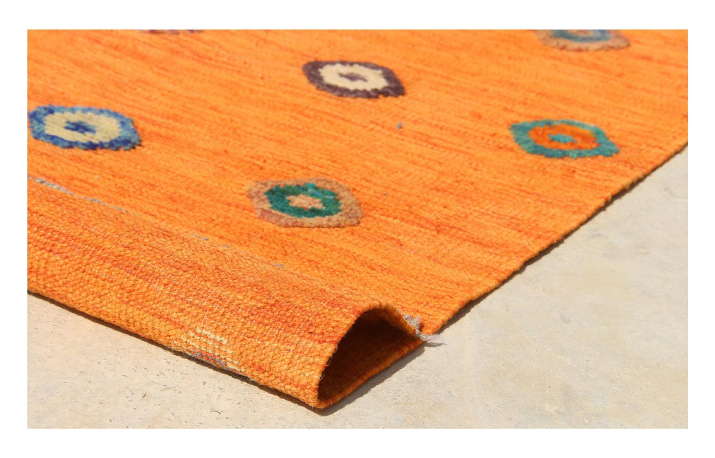 Esta alfombra fue hecha a mano en un telar como un tejido plano. Tejido plano es el término utilizado para describir las alfombras que no tienen pelo. Como el nombre promete, estas alfombras están tejidas y no anudadas. Esto resulta en una alfombra plana con una superficie estructurada. Los tejidos planos no son tan suaves y normalmente más delgados que las alfombras anudadas. Al mismo tiempo, su fabricación es mucho menos compleja y por lo general se pueden disponer por ambos lados (frontal y posterior). Sus patrones suelen ser geométricos, lo cual está determinado por el tejido.