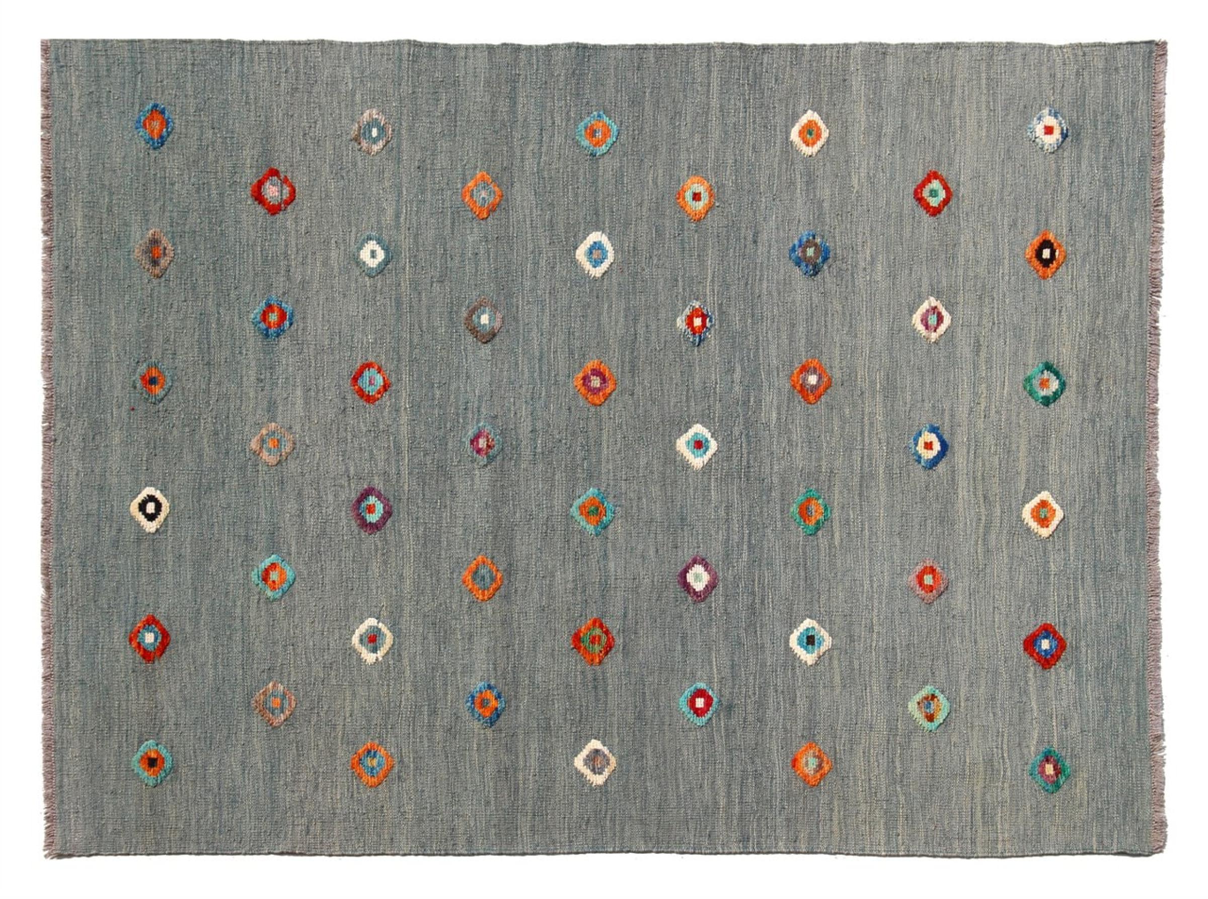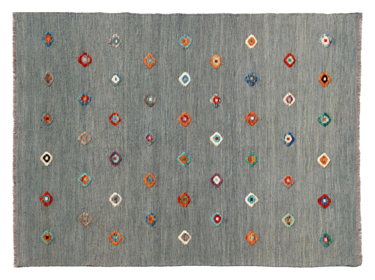 Esta alfombra fue hecha a mano en un telar como un tejido plano. Tejido plano es el término utilizado para describir las alfombras que no tienen pelo. Como el nombre promete, estas alfombras están tejidas y no anudadas. Esto resulta en una alfombra plana con una superficie estructurada. Los tejidos planos no son tan suaves y normalmente más delgados que las alfombras anudadas. Al mismo tiempo, su fabricación es mucho menos compleja y por lo general se pueden disponer por ambos lados (frontal y posterior). Sus patrones suelen ser geométricos, lo cual está determinado por el tejido.
