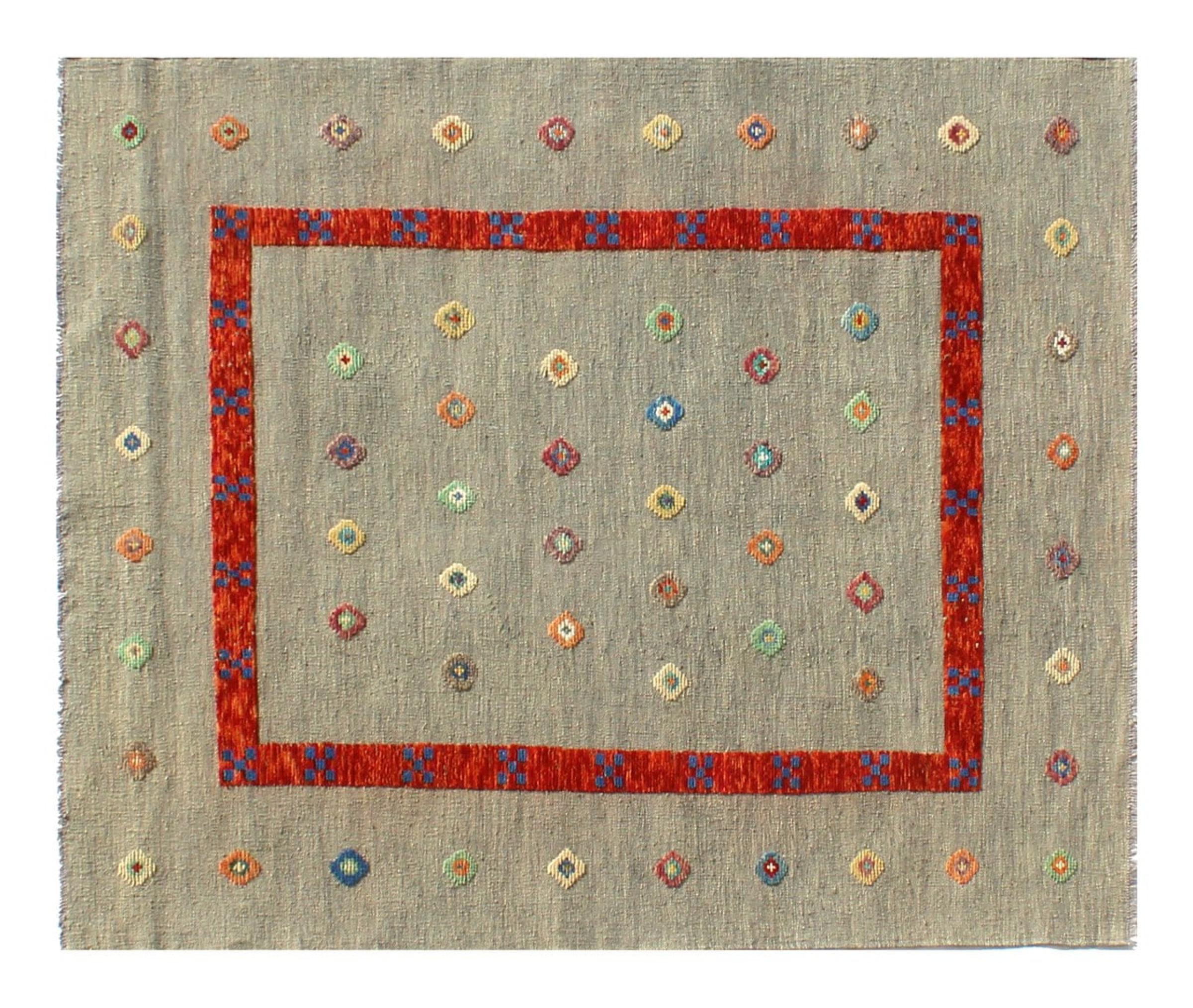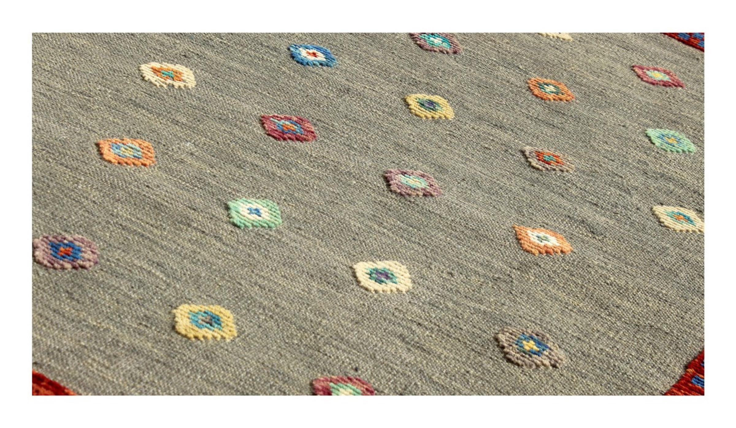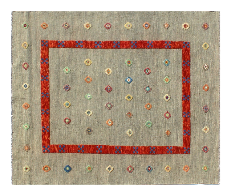 Esta alfombra fue hecha a mano en un telar como un tejido plano. Tejido plano es el término utilizado para describir las alfombras que no tienen pelo. Como el nombre promete, estas alfombras están tejidas y no anudadas. Esto resulta en una alfombra plana con una superficie estructurada. Los tejidos planos no son tan suaves y normalmente más delgados que las alfombras anudadas. Al mismo tiempo, su fabricación es mucho menos compleja y por lo general se pueden disponer por ambos lados (frontal y posterior). Sus patrones suelen ser geométricos, lo cual está determinado por el tejido.