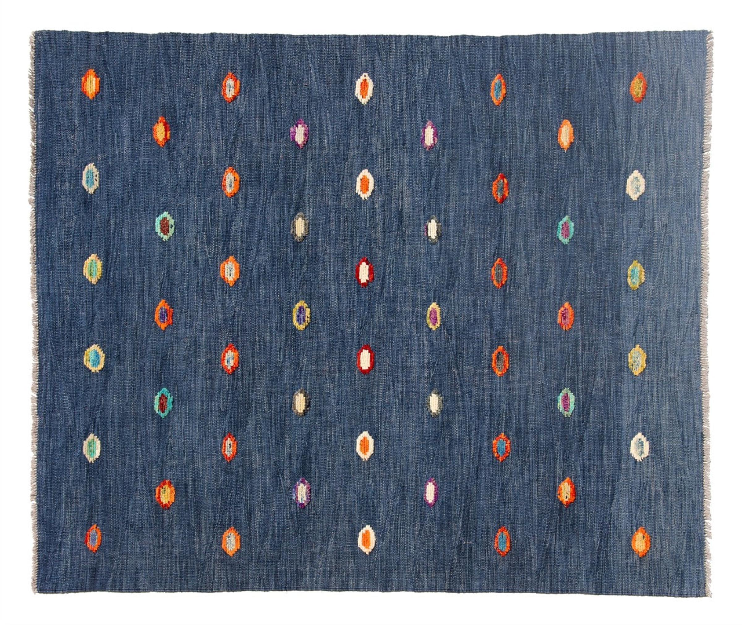 Esta alfombra fue hecha a mano en un telar como un tejido plano. Tejido plano es el término utilizado para describir las alfombras que no tienen pelo. Como el nombre promete, estas alfombras están tejidas y no anudadas. Esto resulta en una alfombra plana con una superficie estructurada. Los tejidos planos no son tan suaves y normalmente más delgados que las alfombras anudadas. Al mismo tiempo, su fabricación es mucho menos compleja y por lo general se pueden disponer por ambos lados (frontal y posterior). Sus patrones suelen ser geométricos, lo cual está determinado por el tejido.