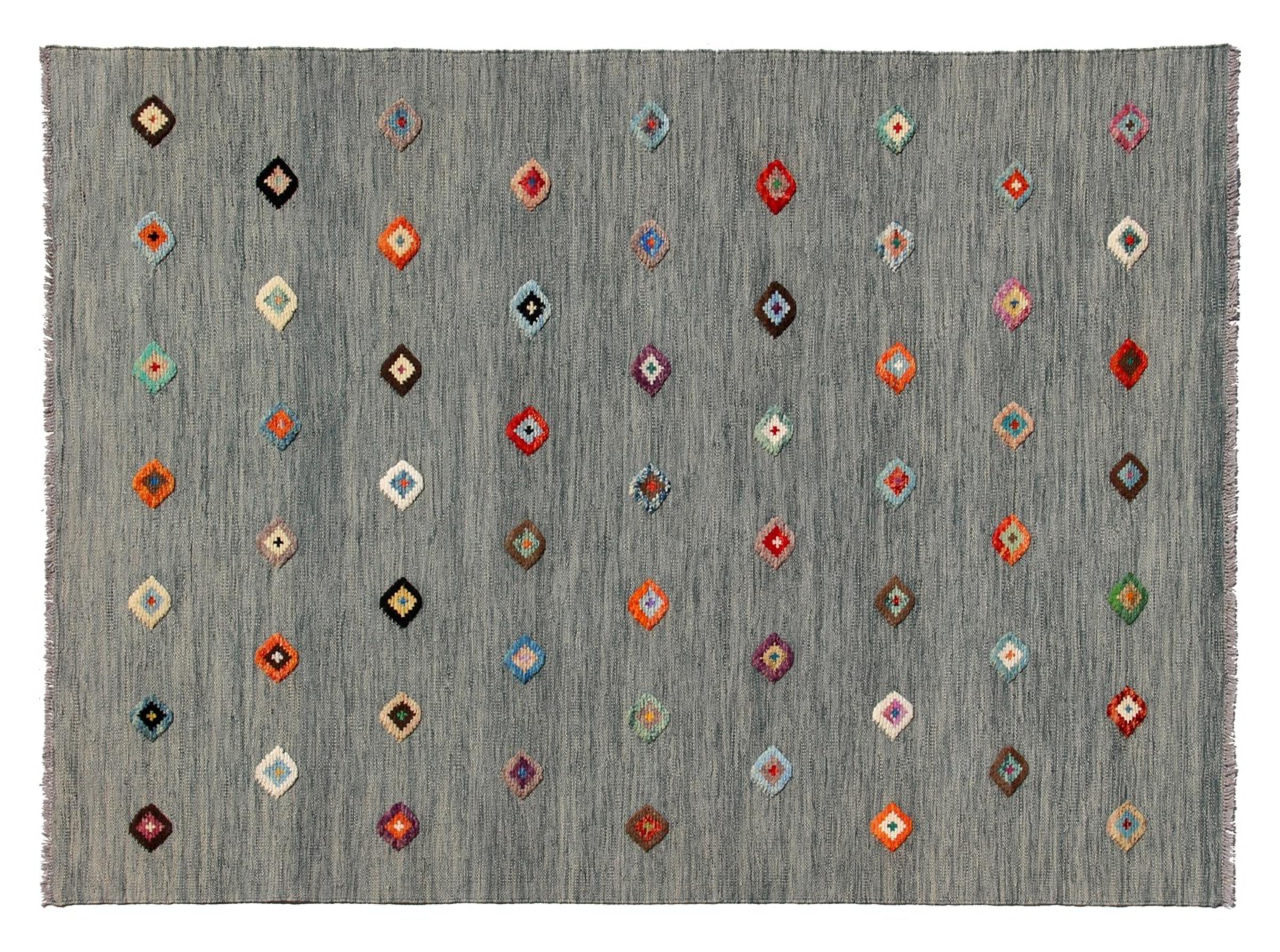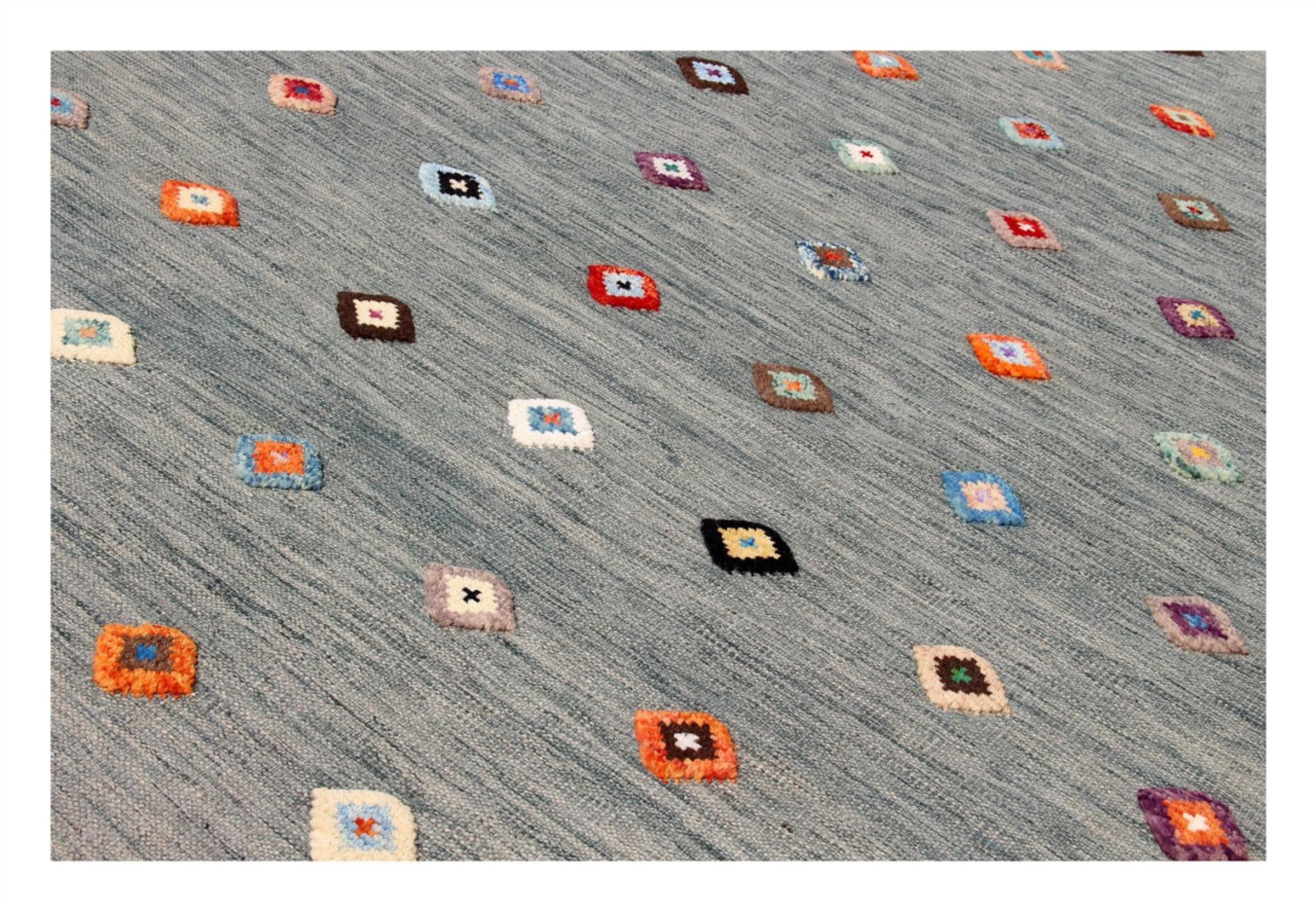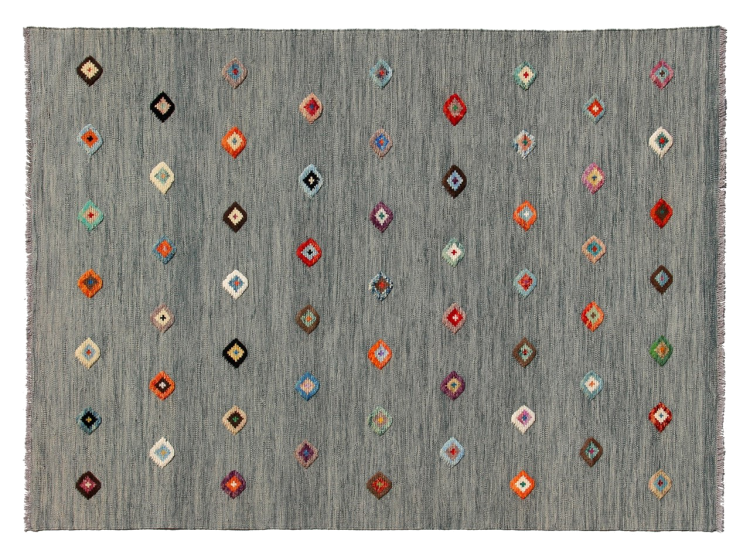 Esta alfombra fue hecha a mano en un telar como un tejido plano. Tejido plano es el término utilizado para describir las alfombras que no tienen pelo. Como el nombre promete, estas alfombras están tejidas y no anudadas. Esto resulta en una alfombra plana con una superficie estructurada. Los tejidos planos no son tan suaves y normalmente más delgados que las alfombras anudadas. Al mismo tiempo, su fabricación es mucho menos compleja y por lo general se pueden disponer por ambos lados (frontal y posterior). Sus patrones suelen ser geométricos, lo cual está determinado por el tejido.