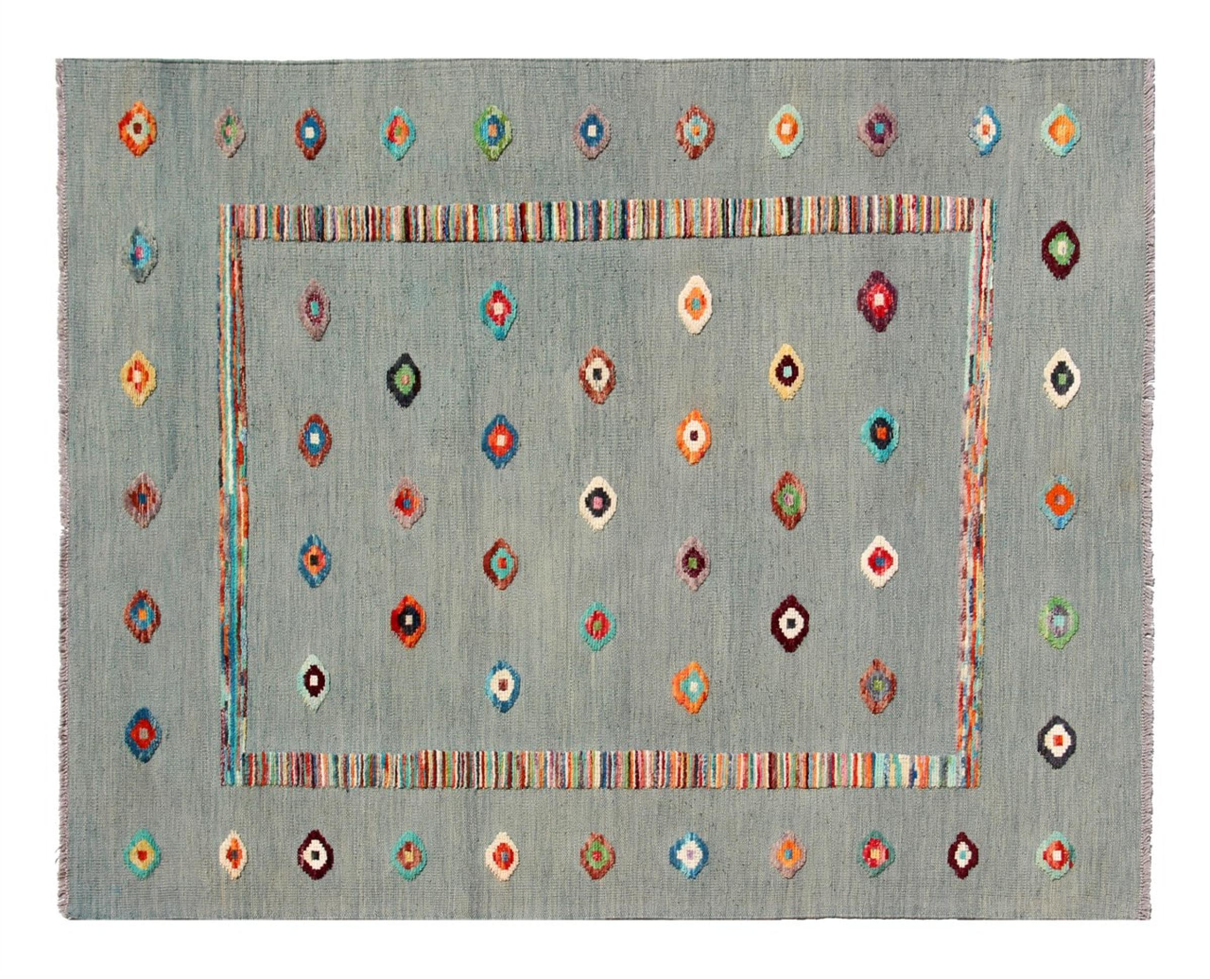 Esta alfombra fue hecha a mano en un telar como un tejido plano. Tejido plano es el término utilizado para describir las alfombras que no tienen pelo. Como el nombre promete, estas alfombras están tejidas y no anudadas. Esto resulta en una alfombra plana con una superficie estructurada. Los tejidos planos no son tan suaves y normalmente más delgados que las alfombras anudadas. Al mismo tiempo, su fabricación es mucho menos compleja y por lo general se pueden disponer por ambos lados (frontal y posterior). Sus patrones suelen ser geométricos, lo cual está determinado por el tejido.