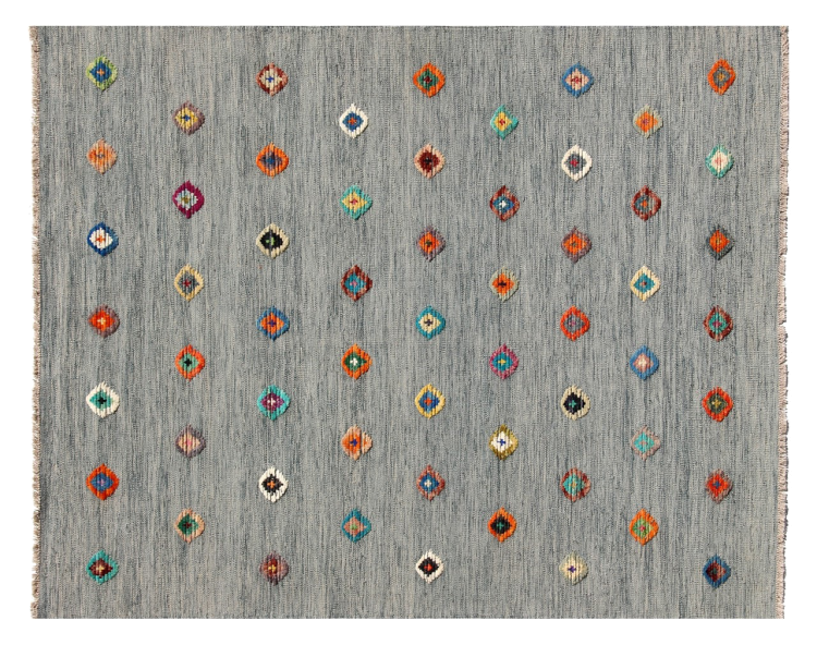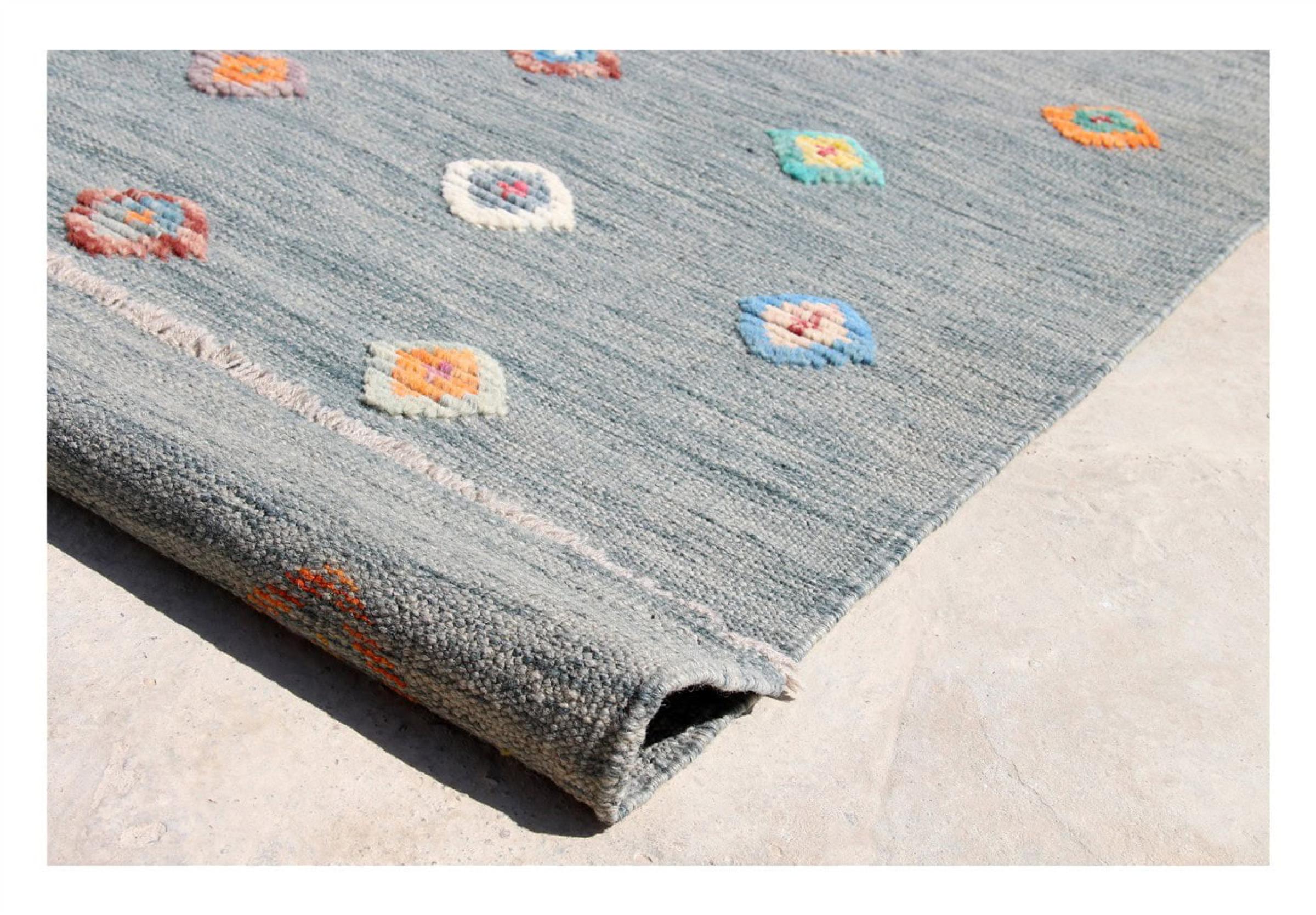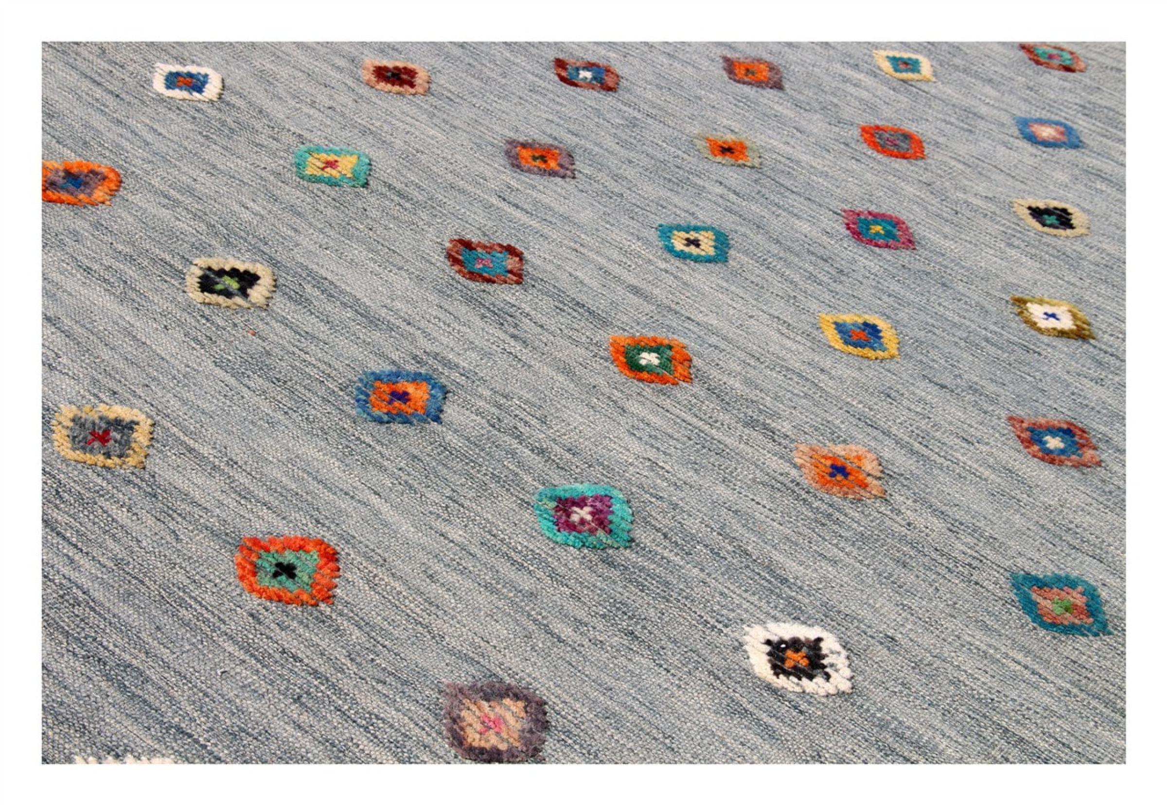 Esta alfombra fue hecha a mano en un telar como un tejido plano. Tejido plano es el término utilizado para describir las alfombras que no tienen pelo. Como el nombre promete, estas alfombras están tejidas y no anudadas. Esto resulta en una alfombra plana con una superficie estructurada. Los tejidos planos no son tan suaves y normalmente más delgados que las alfombras anudadas. Al mismo tiempo, su fabricación es mucho menos compleja y por lo general se pueden disponer por ambos lados (frontal y posterior). Sus patrones suelen ser geométricos, lo cual está determinado por el tejido.