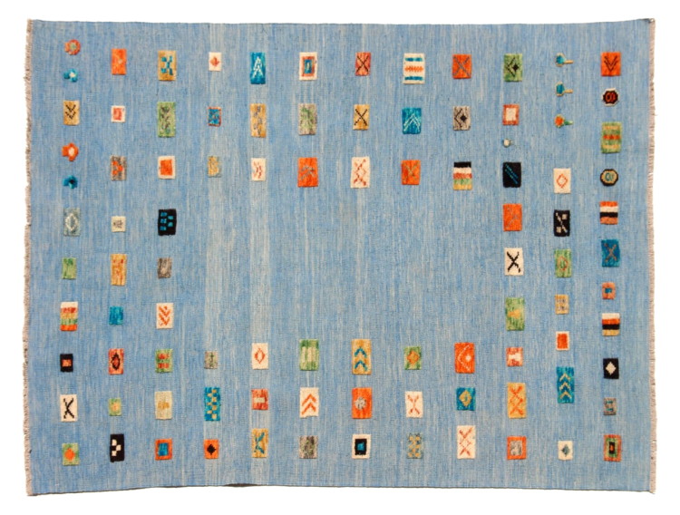 Esta alfombra fue hecha a mano en un telar como un tejido plano. Tejido plano es el término utilizado para describir las alfombras que no tienen pelo. Como el nombre promete, estas alfombras están tejidas y no anudadas. Esto resulta en una alfombra plana con una superficie estructurada. Los tejidos planos no son tan suaves y normalmente más delgados que las alfombras anudadas. Al mismo tiempo, su fabricación es mucho menos compleja y por lo general se pueden disponer por ambos lados (frontal y posterior). Sus patrones suelen ser geométricos, lo cual está determinado por el tejido.